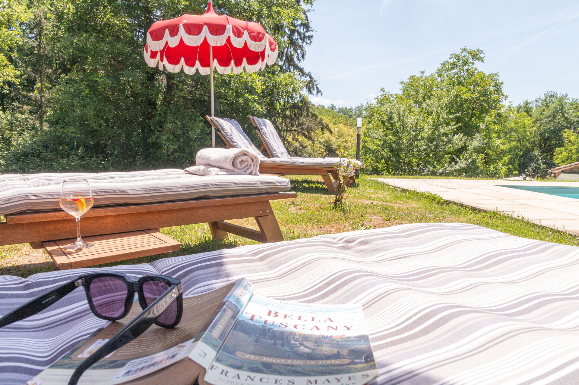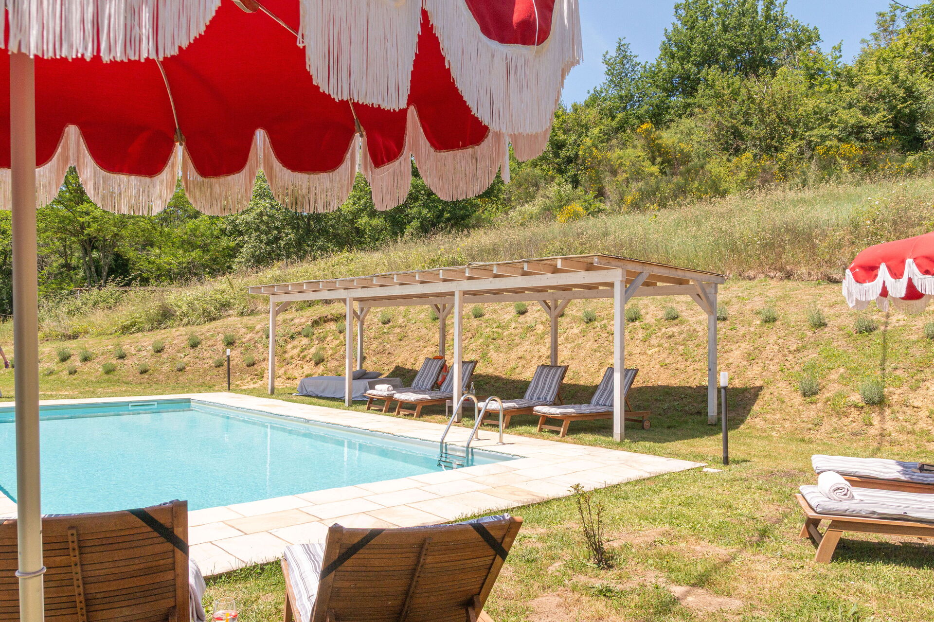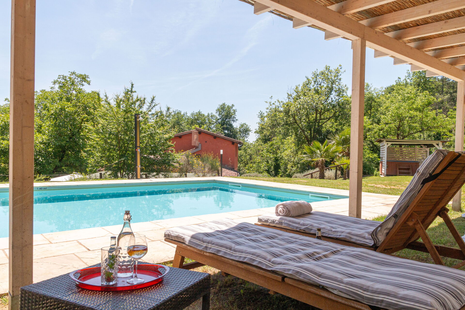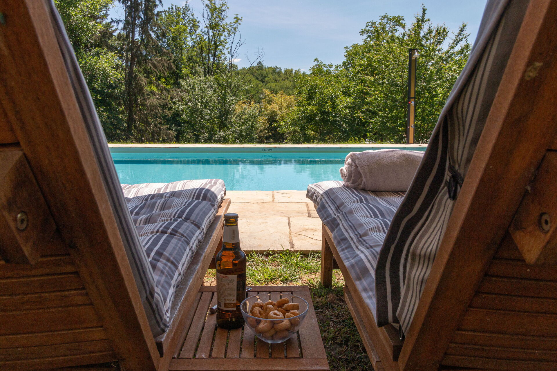 Piscine à quelques pas (10m long, 5m large, profondeur 1.4-1.6m). Lits de jardin, chaises, parasols.