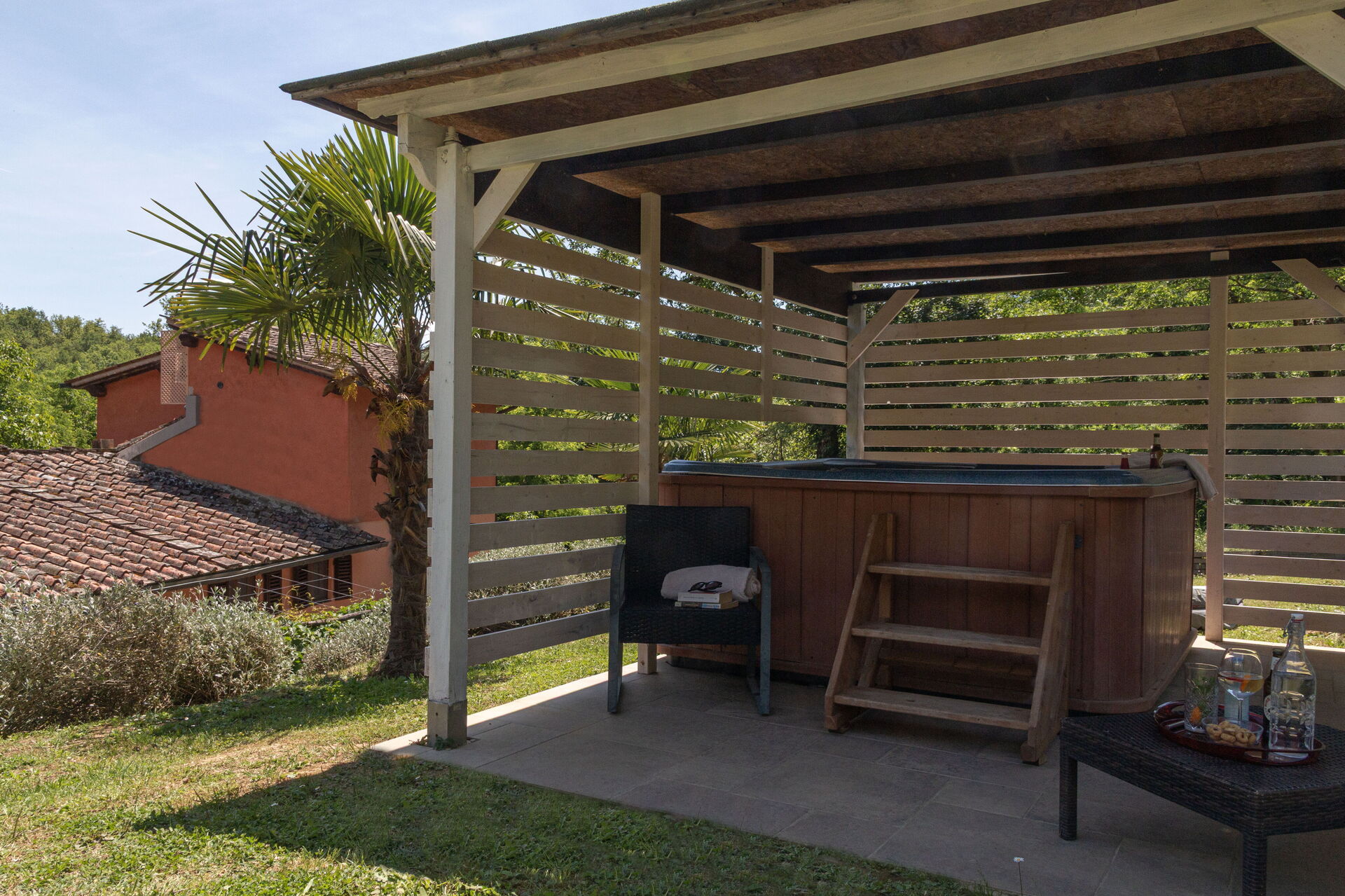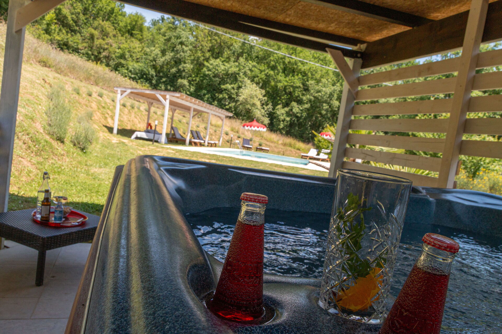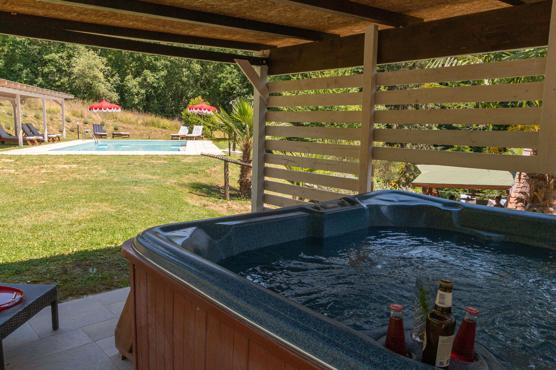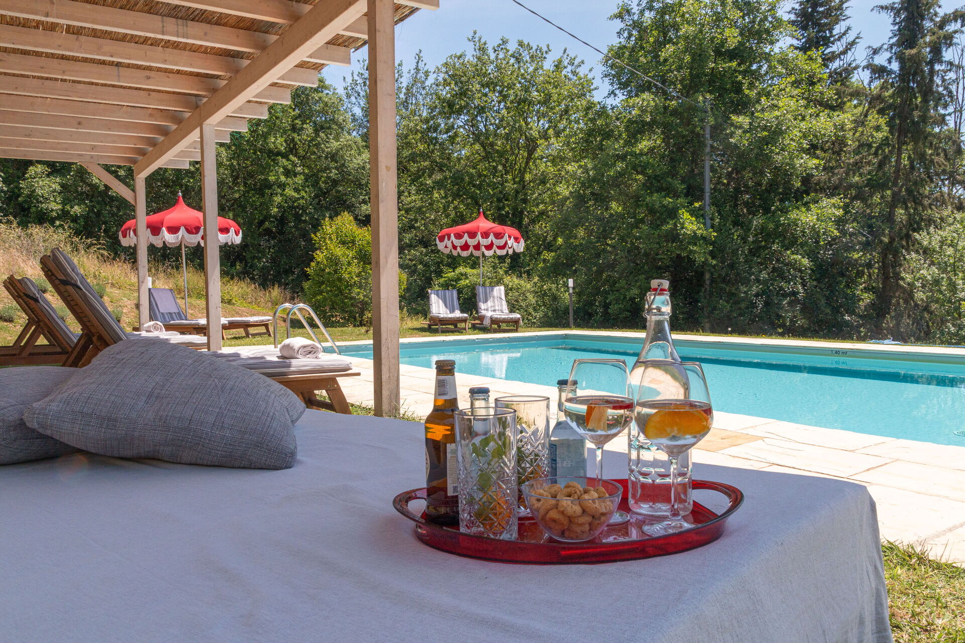 Piscine à quelques pas (10m long, 5m large, profondeur 1.4-1.6m). Lits de jardin, chaises, parasols.
