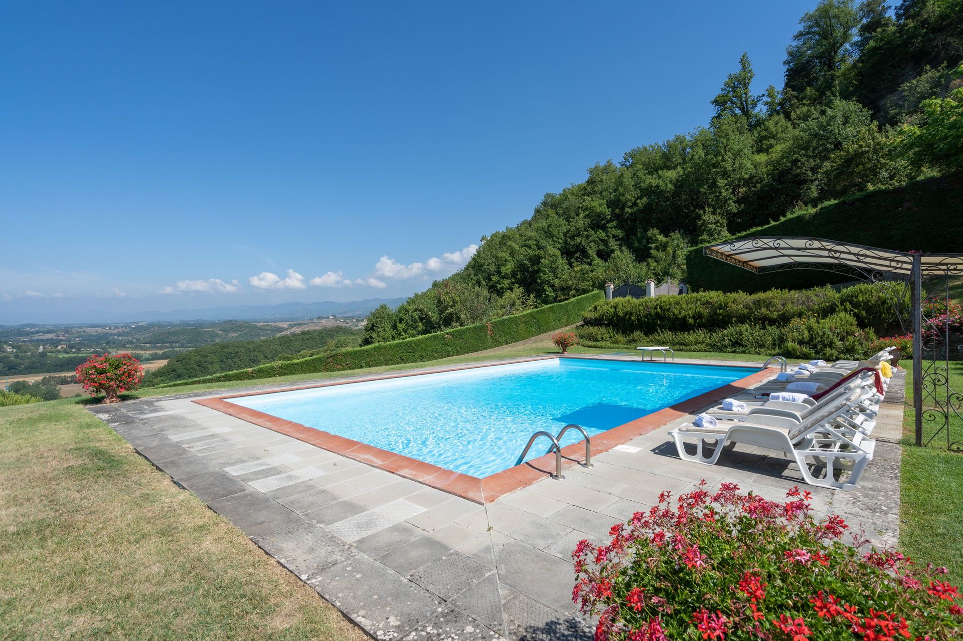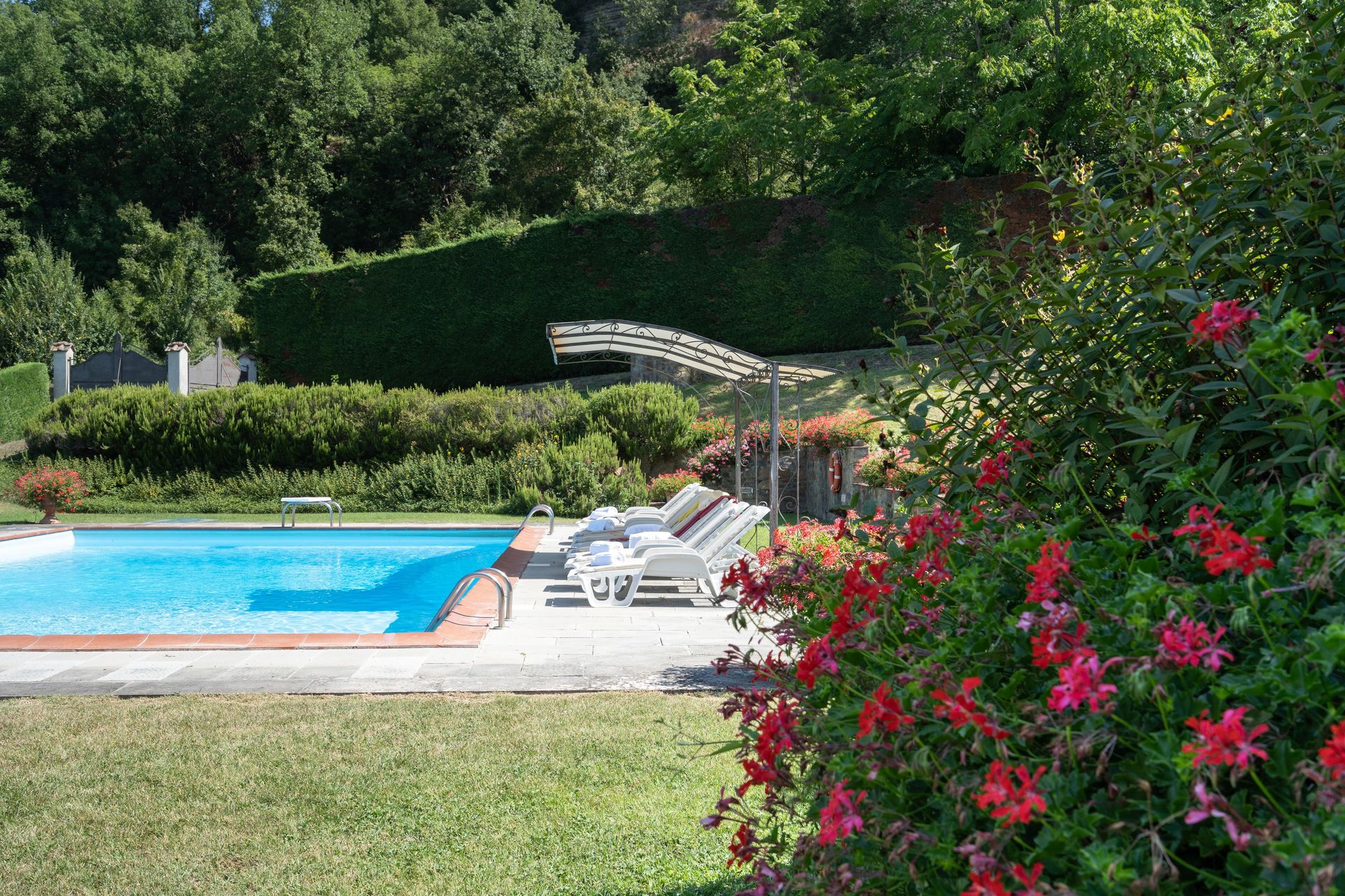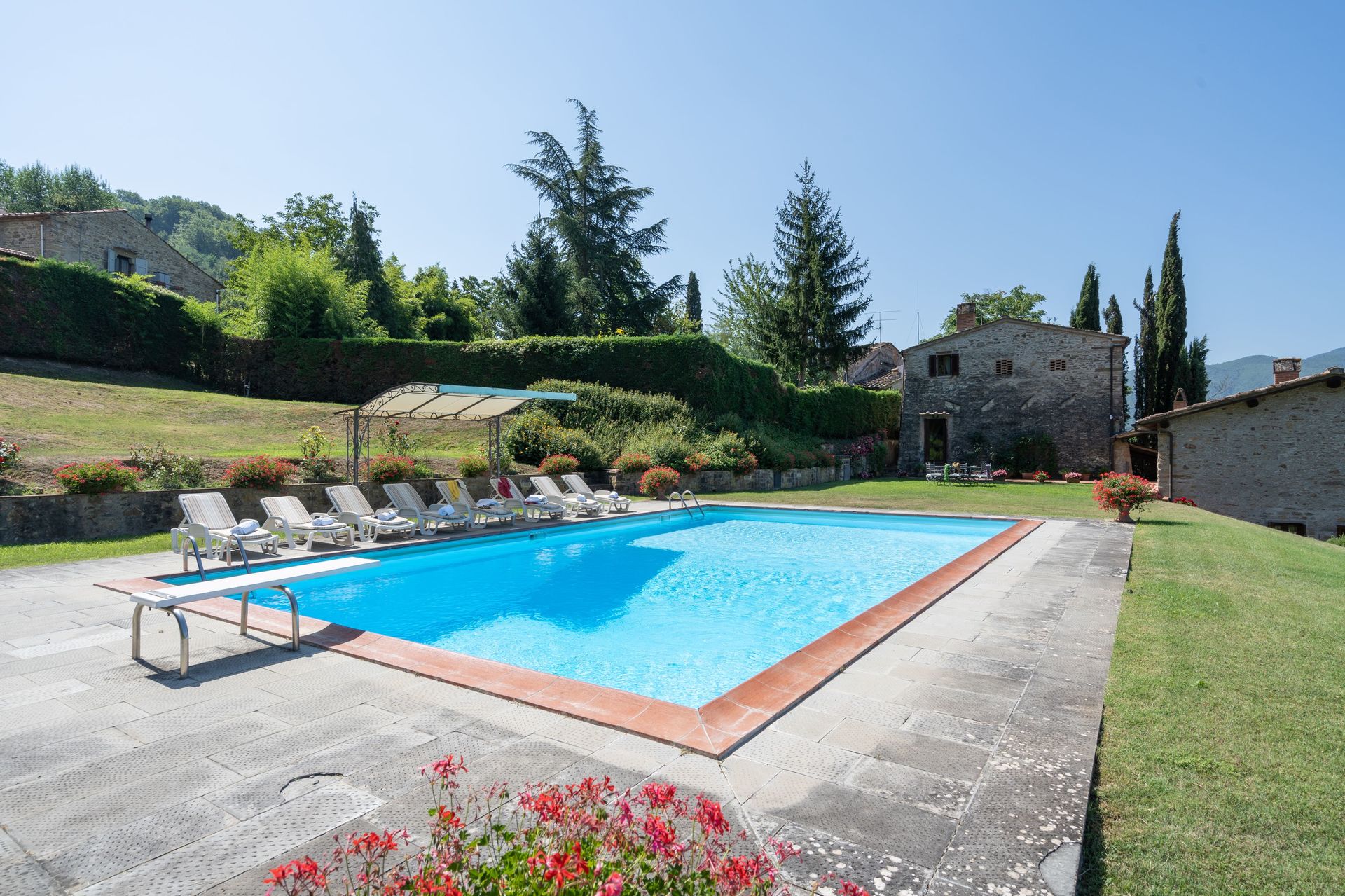 IMPORTANT: Un côté de la propriété et une partie du jardin sont contiguës à la maison de vacances "San Lorenzo" (à environ 30 mètres de distance) et les deux maisons sont divisées simplement par une haie de laurier. Chaque maison dispose en tous cas d'une entrée séparée et indépendante, d'une piscine privée et des espaces extérieurs privés. Il est possible de réserver les deux maisons ensemble.