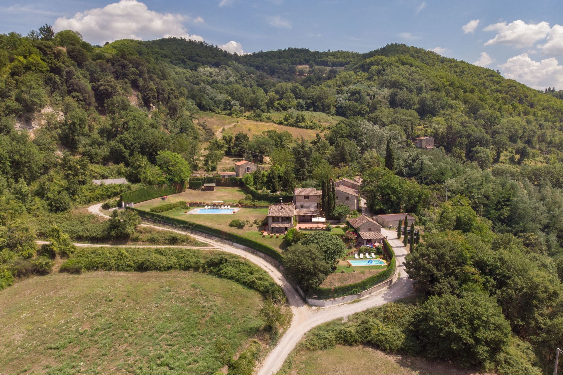 Pour atteindre la propriété, les derniers 300 mètres de route sont en terre battue et seulement partiellement goudronnés.