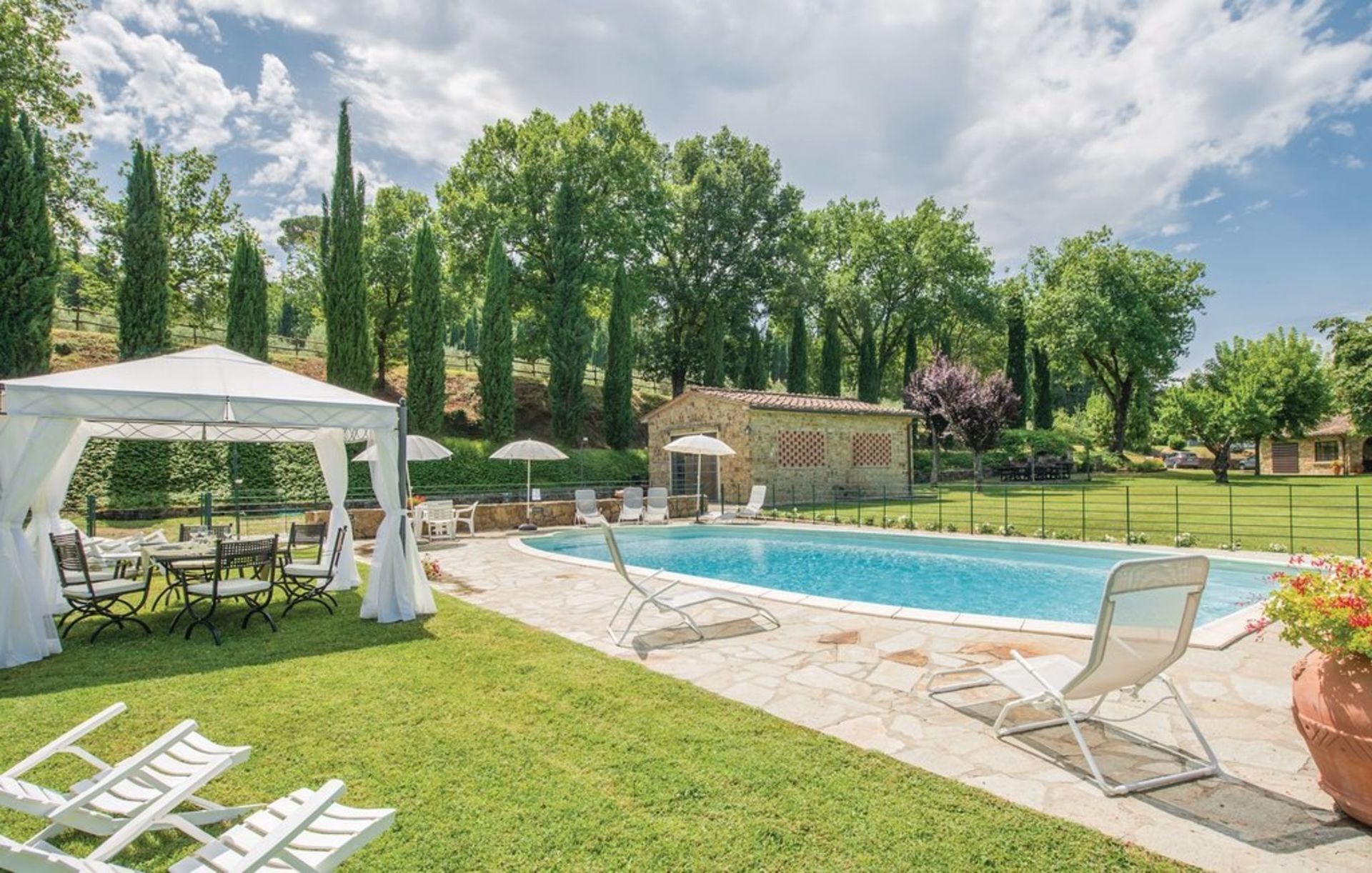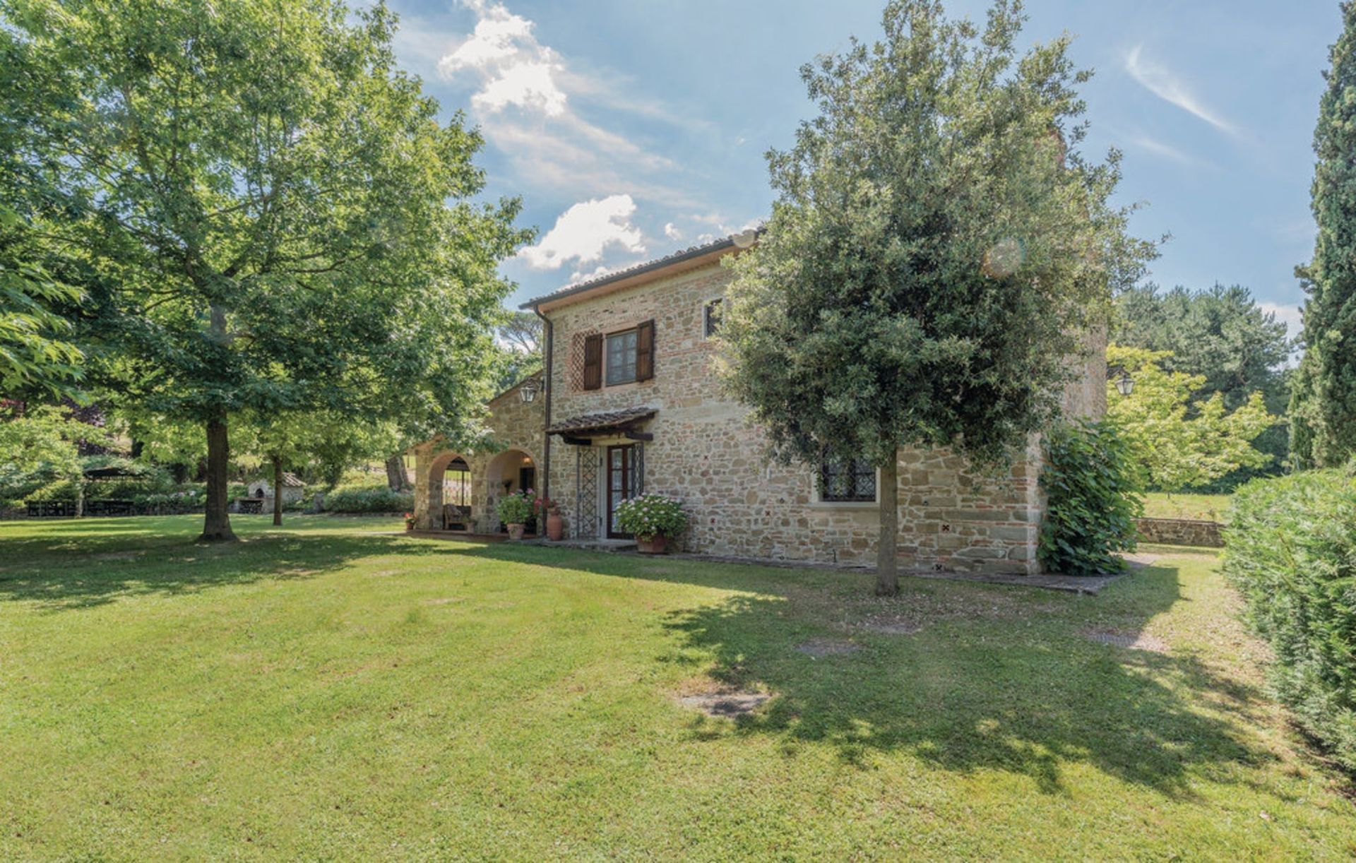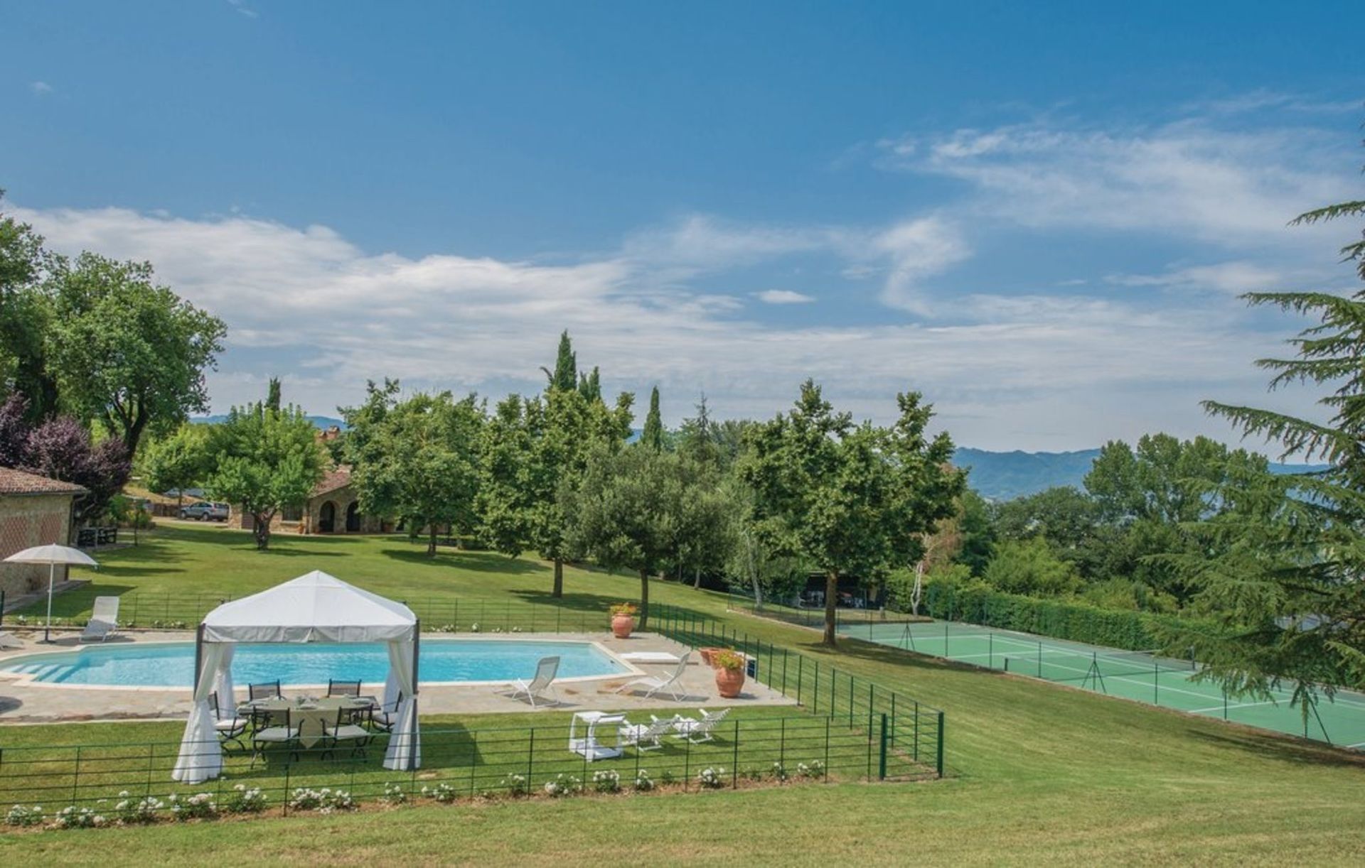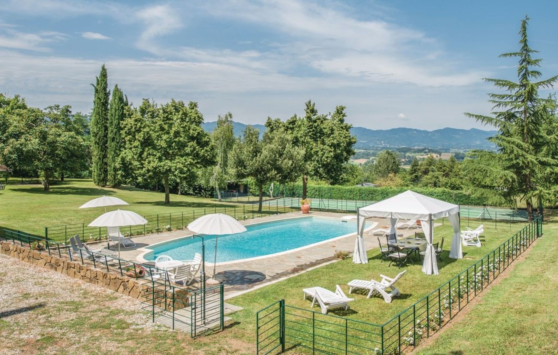 Ancienne grange finement restaurée, située en position panoramique sur les pentes des collines mugellanes, entre le village de San Lorenzo et celui de vicchio, à quelques kilomètres de Florence. La structure dispose d’un mobilier très soigné et confortable, avec des antiquités. Air conditionné au premier étage. Entoure la maison un grand jardin de plus de 5000 m². entièrement clôturé et équipé avec piscine clôturée et chauffée à l’usage exclusif des hôtes (12m. x 6m. prof. 125/200cm.). La propriété dispose également d’espaces extérieurs (deux kiosques) pour les déjeuners et dîners en plein air (barbecue et four à bois). Court de tennis privé à usage complet (raquettes à disposition). Internet Wi-Fi gratuit. Parking privé dans la propriété. La maison est située à 3km de "Vicchio" (village natal de Giotto et de Beato Angelico), à 35km de Florence, à 23km du Barberino Designer Outlet (plus de 100 boutiques de grandes marques de la mode italienne et internationale) et du lac de balance (canoë, voile, planche à voile), à 12km de Poggio dei Medici Golf Club, à 7km du centre équestre.
