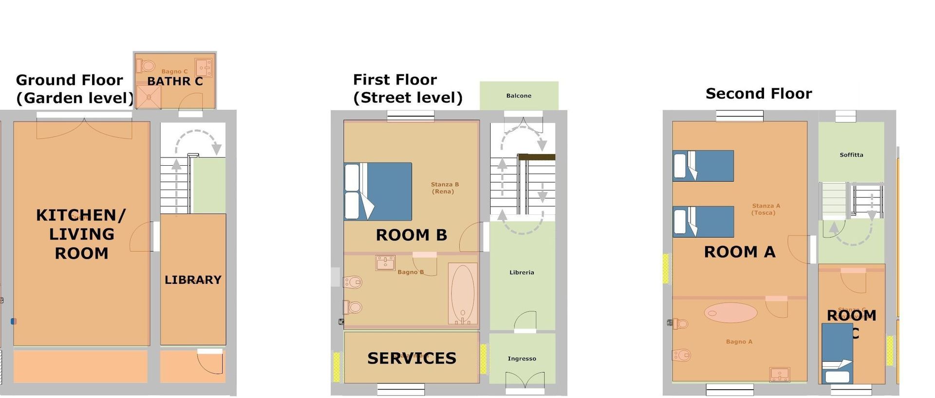 La maison est sur 3 étages, avec 2 chambres a coucher, 3 salles de bains (deux attachées aux chambre à coucher, une au rez de chaussé), une grande salle avec cuisine et salon.