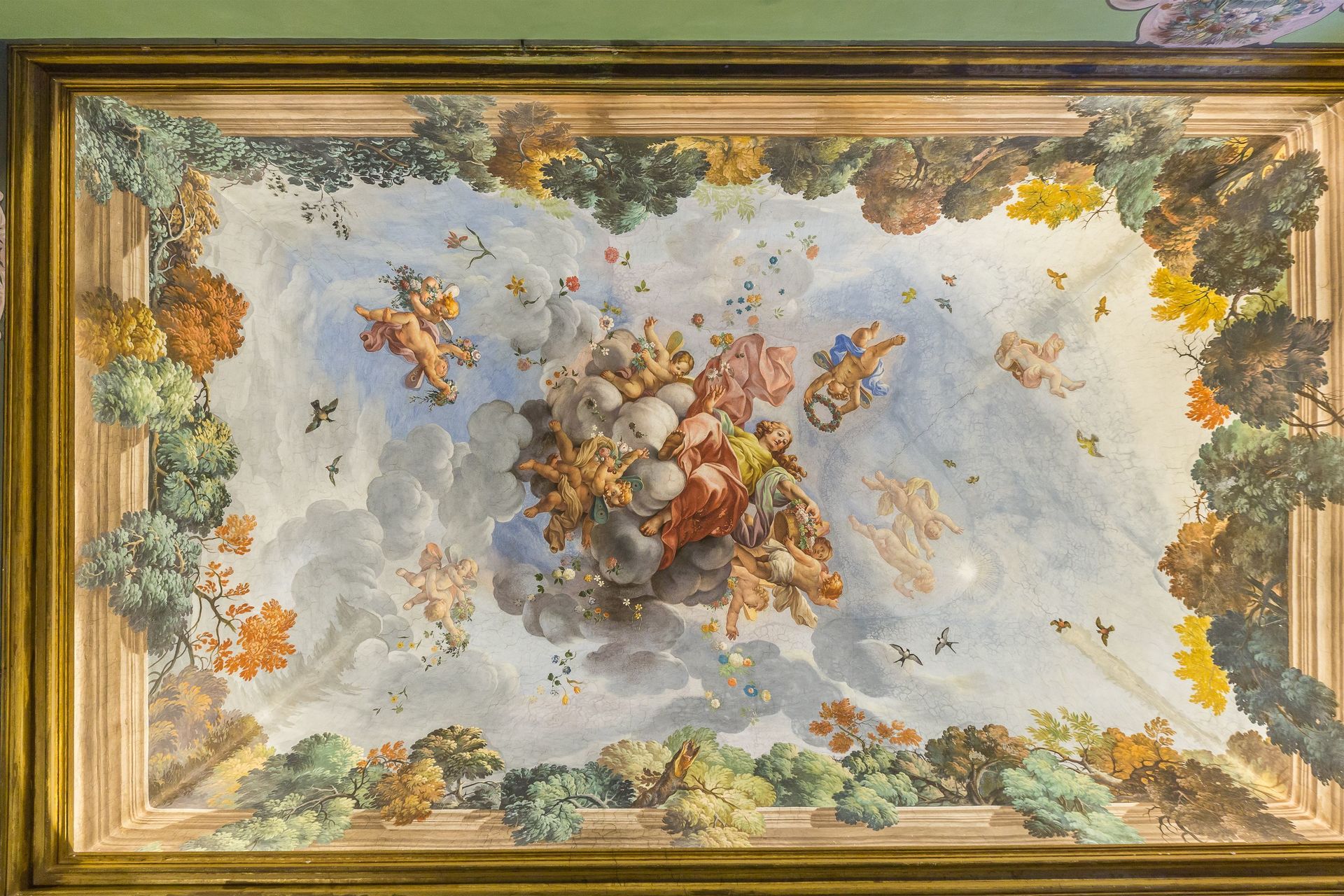 Toutes les pièces sont finement décorées de fresques du XVIIème siècle et les fenêtres ouvrent sur le jardin et sur la campagne environnante.
