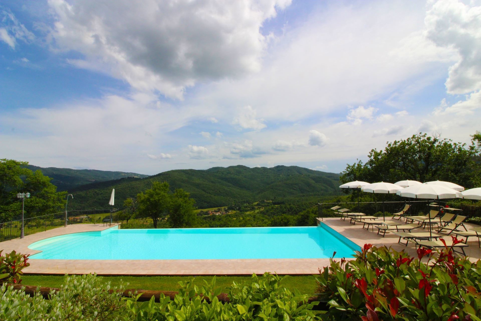 L'espace extérieur du Borgo di Usciano est divisé en plusieurs terrasses panoramiques, et vous aurez l'embarras du choix entre vous détendre dans le solarium au bord de la belle piscine à débordement (taille m 7x14, profondeur m 1-1,60 - ouvert du 01 Mai au 30 Septembre), à l'ombre d'un arbre frais dans la partie inférieure du jardin, ou monter sur la colline avec une vue à 360° et un bon livre pour vous tenir compagnie.