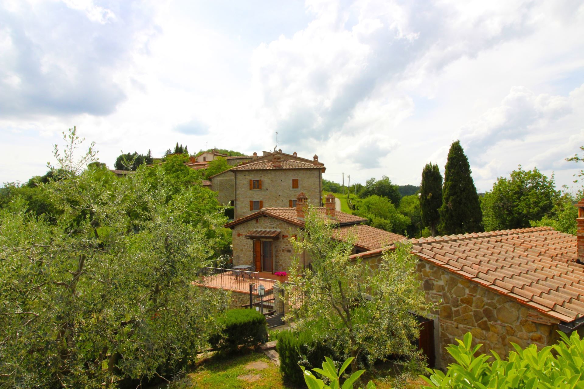 Usciano est un ancien village d'origine médiévale, situé à quelques km de la ville d'Arezzo. Nous le trouvons dans une position panoramique et perché sur une haute colline, entouré d'oliveraies et de vertes forêts de chênes. La maison principale en pierre et les deux maisonnettes datent de 1851, lorsque le petit village était habité par des bûcherons, des fermiers et des châtaigniers, ses atmosphère vous ramènera immédiatement à cette époque.