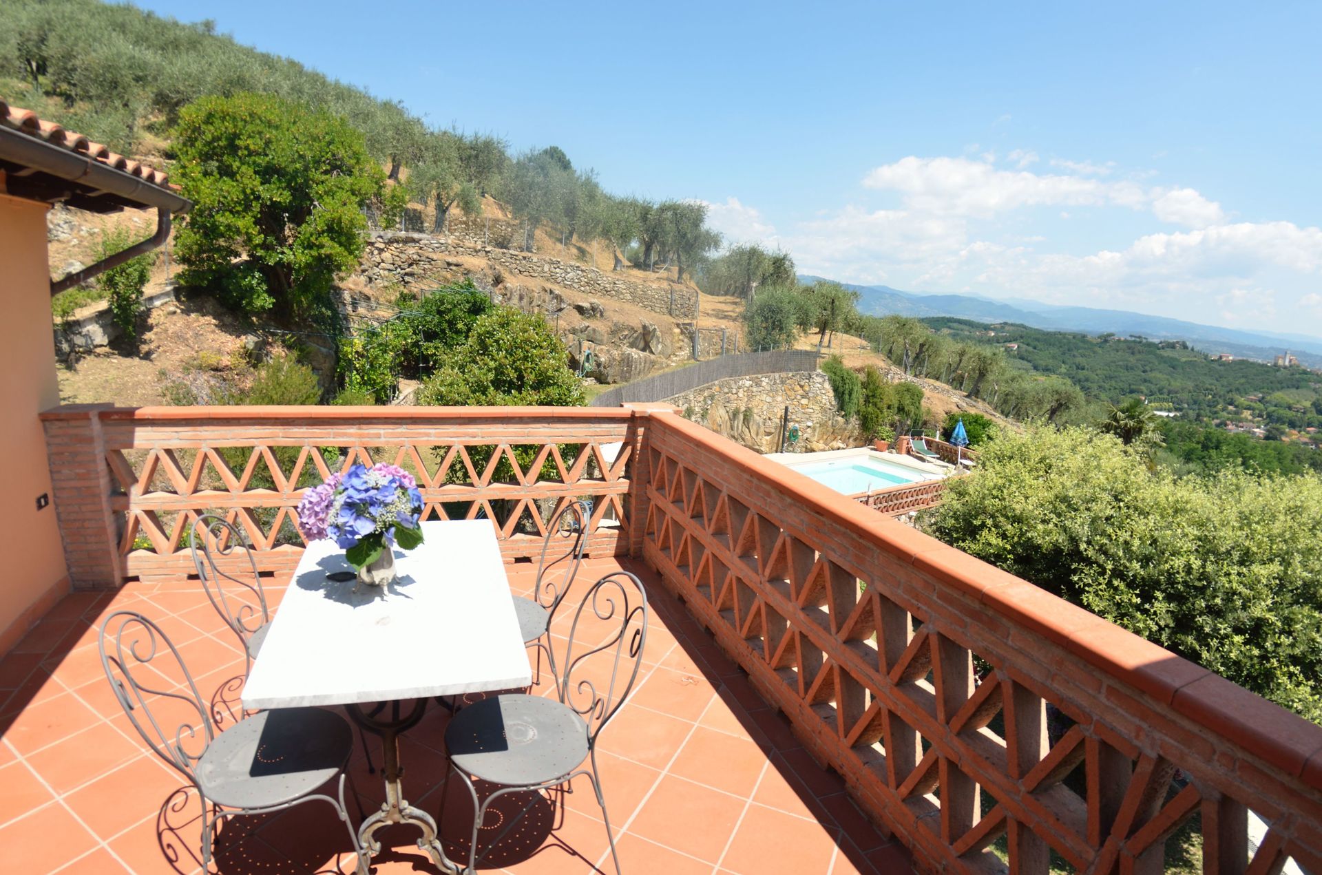 Une fois arrivés à Agli Olivi vous trouverez une jolie propriété, propre et bien entretenue, avec vue sur montagnes et les collines idéale pour des calmes vacances en Toscane. Après une épuisante journée de visites, passez du temps avec la famille et les amis en bord de piscine en dégustant un verre de vin, un moyen idéal pour vous délasser à la fin de la journée. Il y a une cuisine y compris assez de vaisselle et couverts jusqu'à huit personnes. Si vous préférez dîner «al fresco», il y a à votre disposition un balcon entièrement meublé où vous pourrez profiter du beau temps tout en mangeant en plein air.
