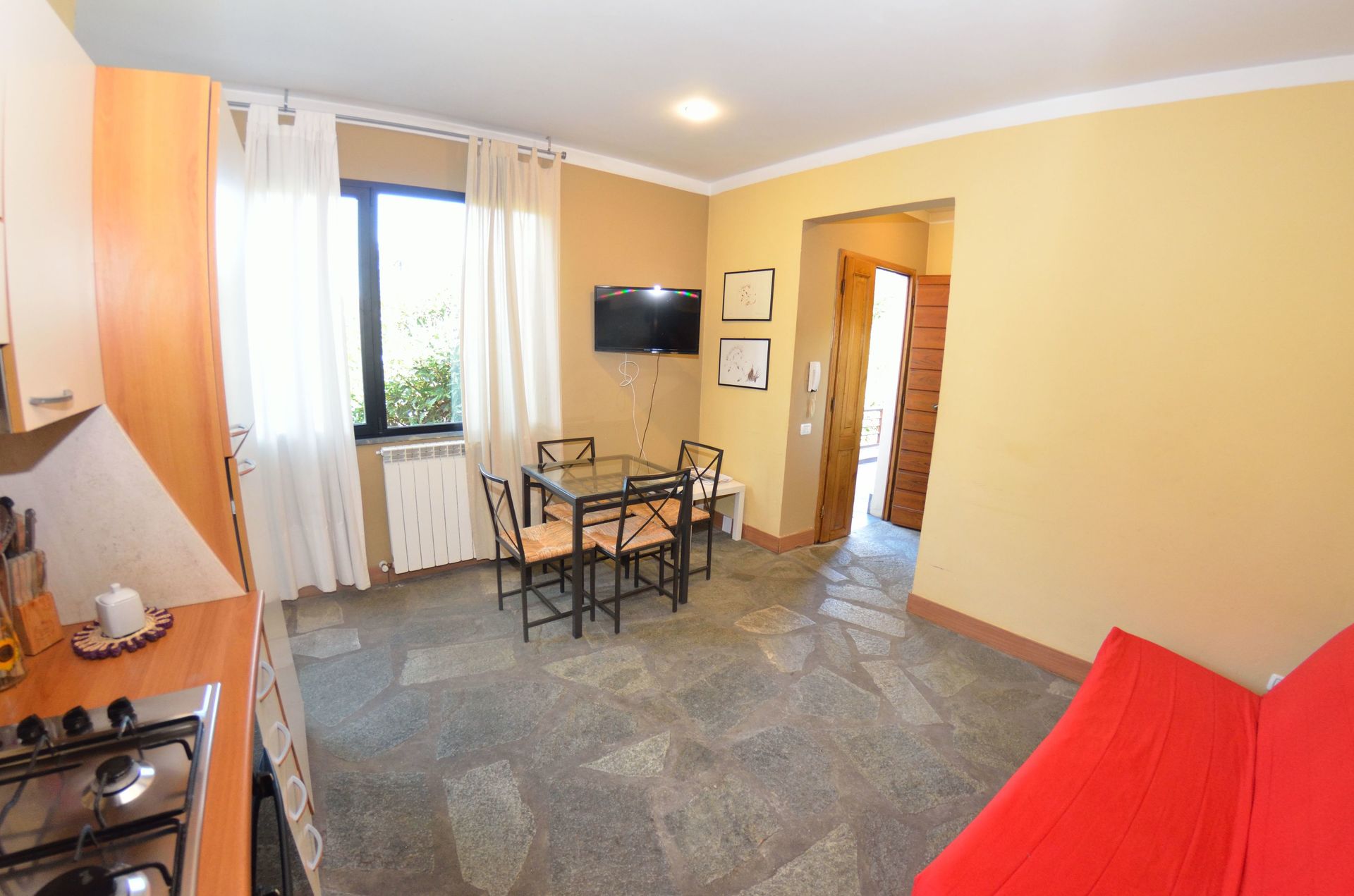 Cuisine – salle de séjour: table à manger (personnes: 4), réfrigérateur, cuisinière, canapé, sortie sur la terrasse.