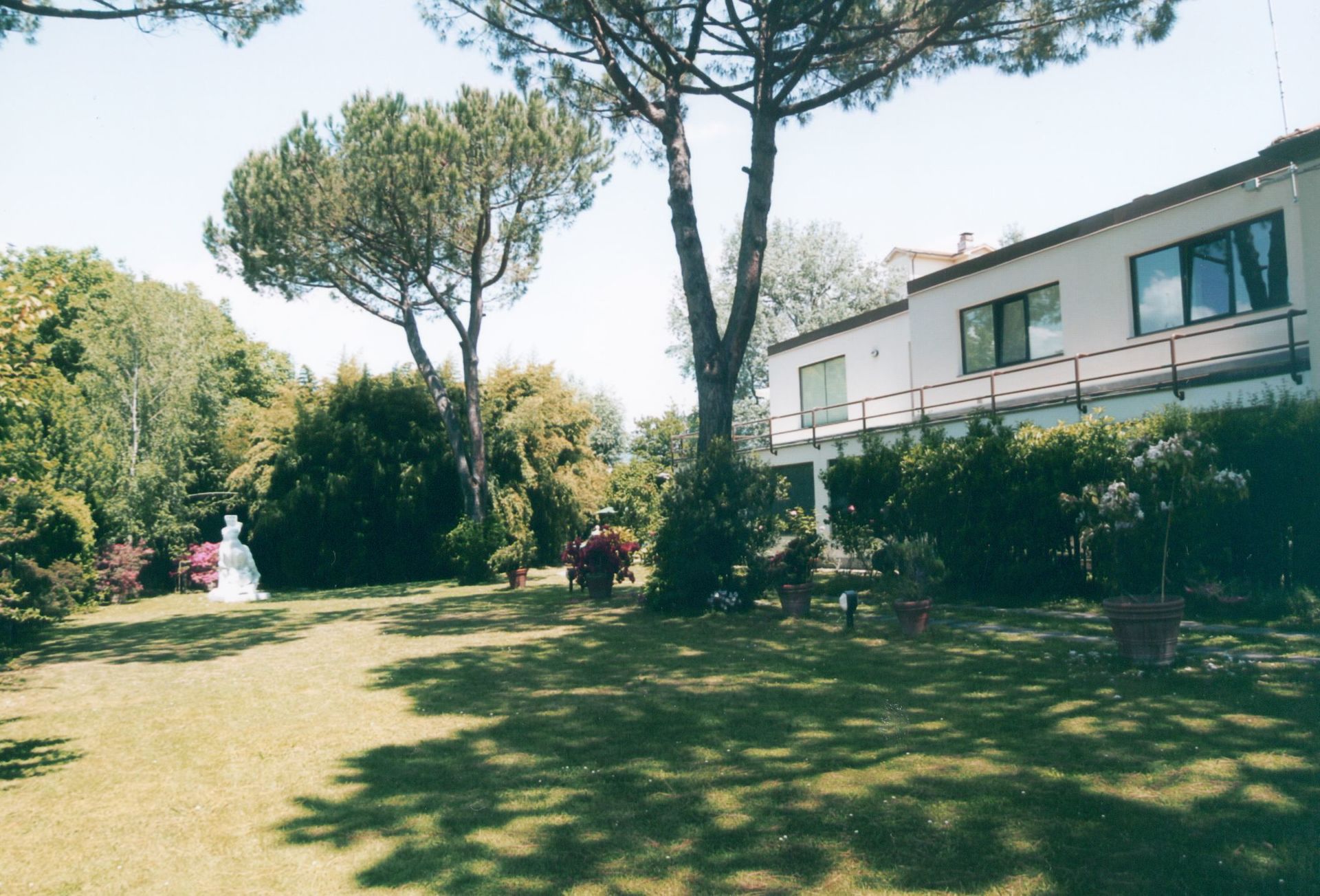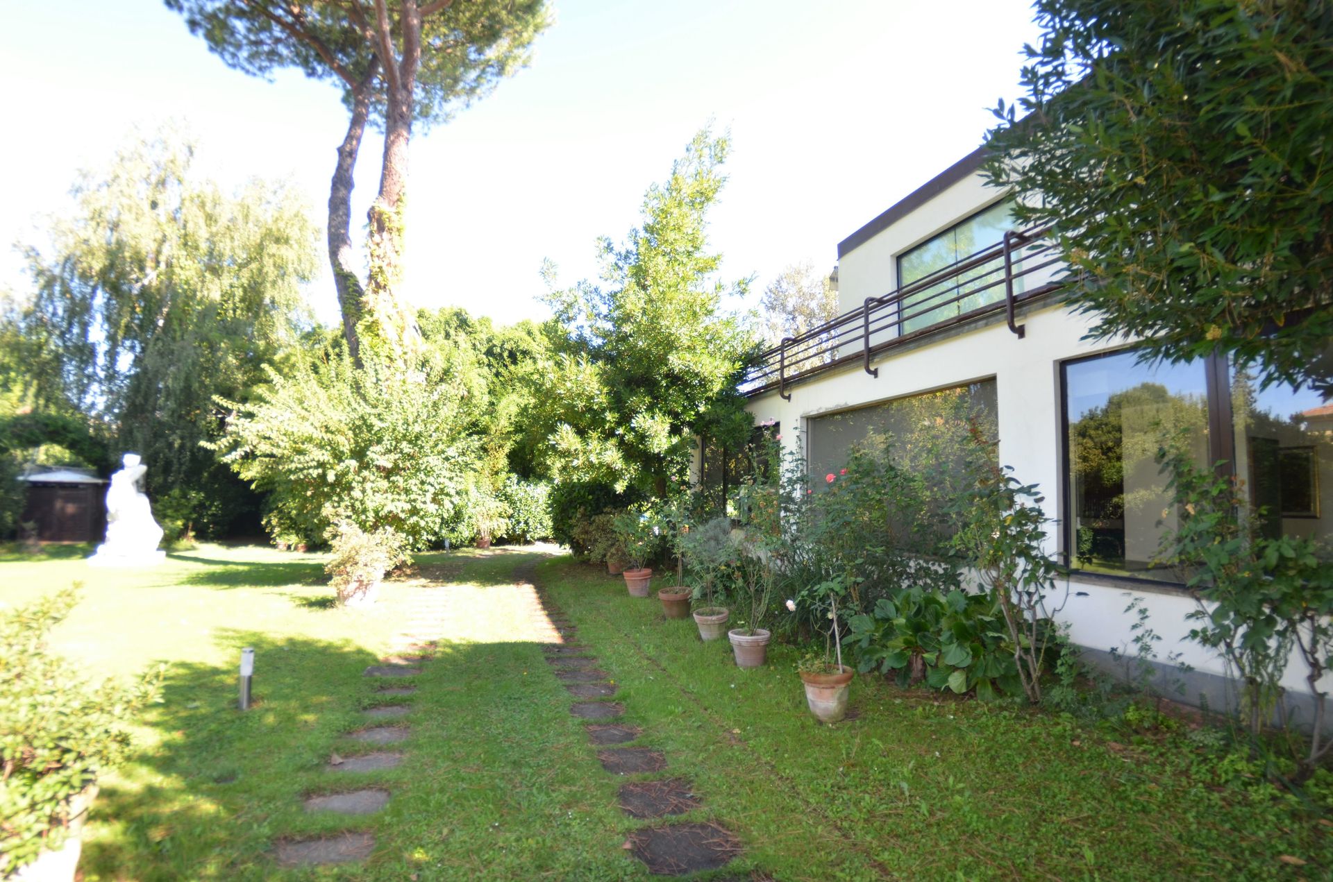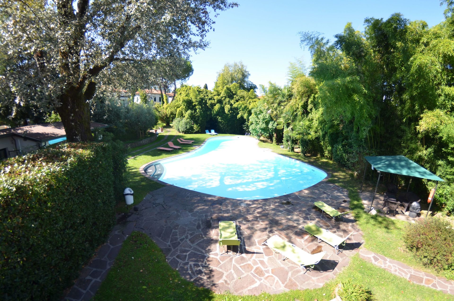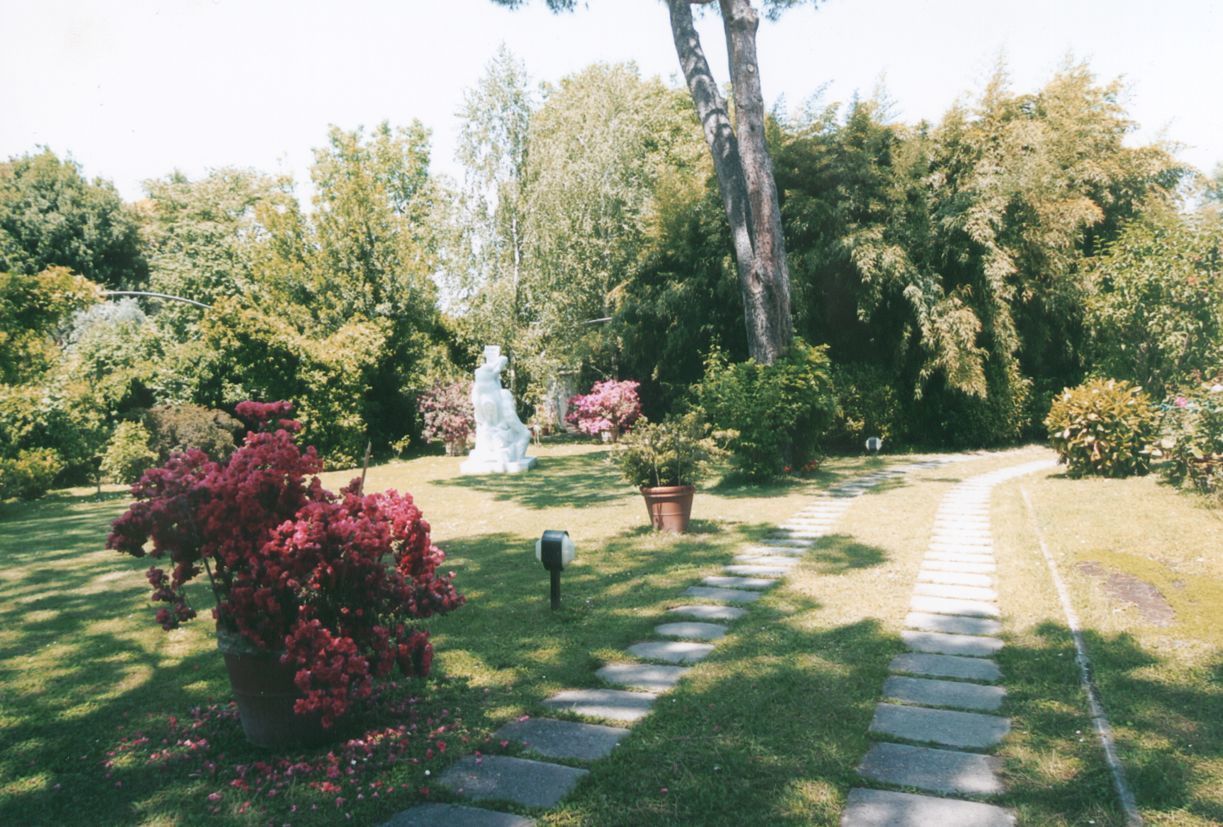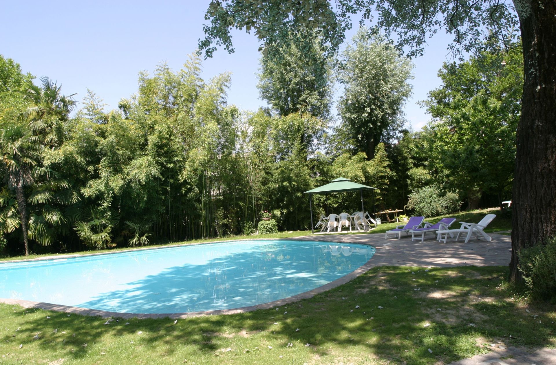 jardin: piscine (largeur: 8m, longueur: 21m), meuble de jardin.