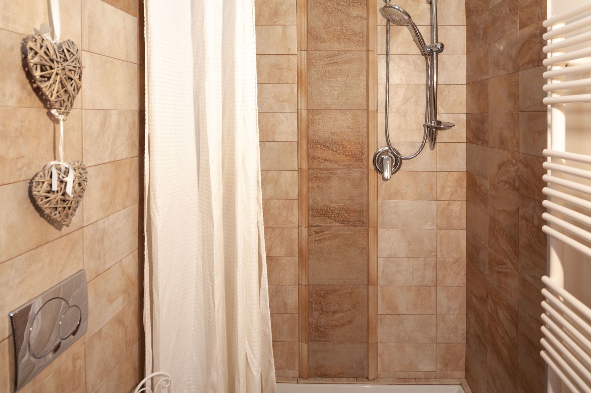 Salle de bain avec grande douche, lavabo, toilette et bidet, sèche-cheveux, lave-linge.