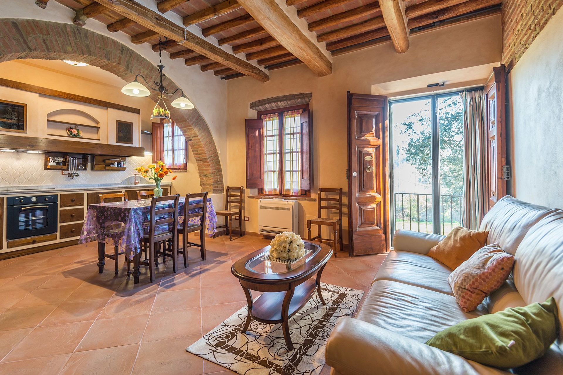 Rez-de-chaussée : salon avec canapé-lit double (avec supplément), salle à manger avec cuisine et cheminée, deux chambres doubles, deux salles de bains avec douche.