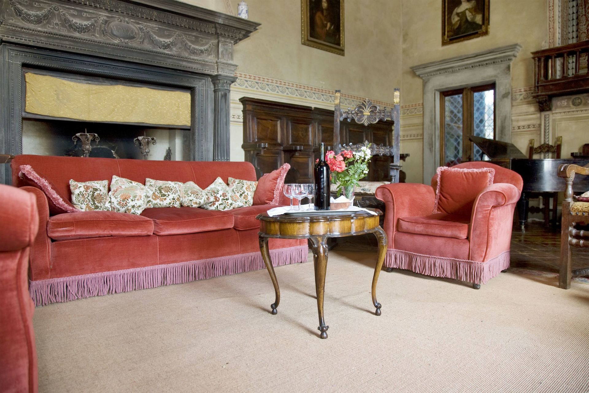 Il y a un piano dans le salon, disponible pour les invités. La propriété se compose du bâtiment principal, de l'aile droite et de la tour.