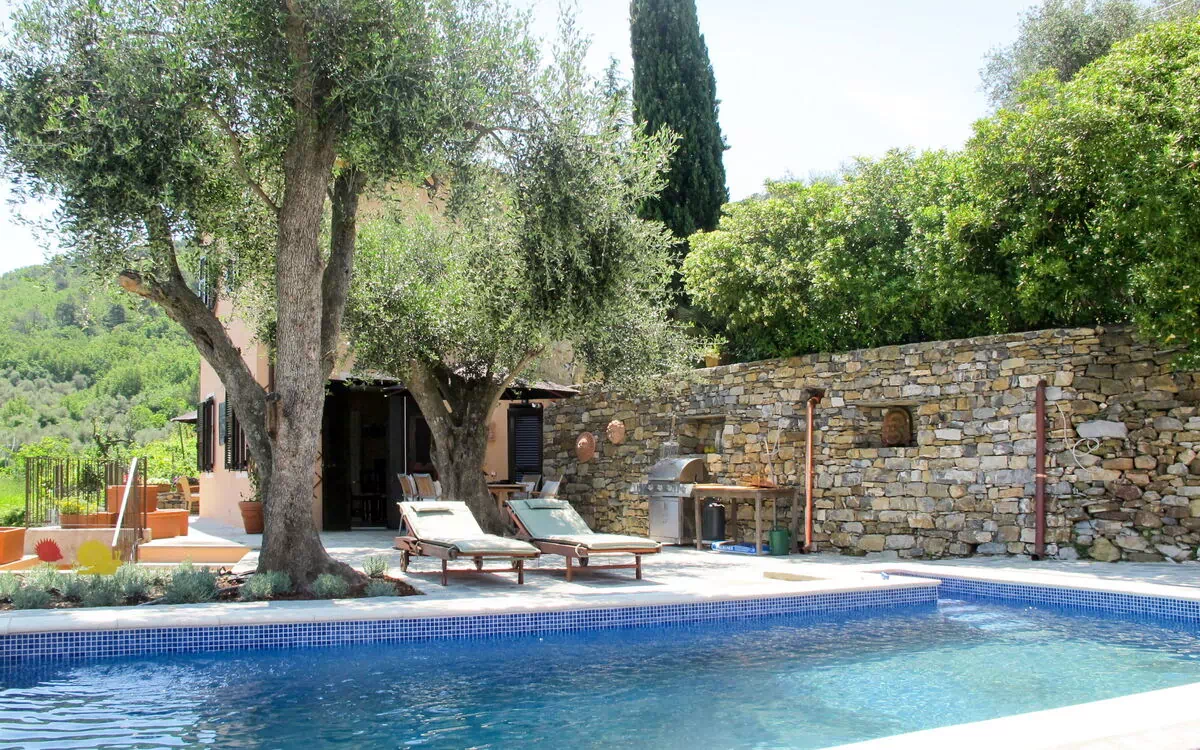 Le jardin terrasse privé s'étend sur 300 mètres carrés et accueille un jardin de faune ainsi que des arbres établis qui offrent de l'ombre et une sensation d'intimité. La piscine privée mesure 7 x 3 mètres avec une profondeur de 150 centimètres ; elle est disponible de manière saisonnière du 15 mai au 1er octobre. Une douche extérieure est aménagée à proximité de la piscine. Un patio et une terrasse complètent les espaces extérieurs, tous deux équipés de mobilier de jardin. Une terrasse ensoleillée est également disponible au sein du complexe, offrant un espace supplémentaire pour profiter du soleil et de la vue sur les collines environnantes. L'accès à la maison se fait par un escalier de 14 marches qui mène les hôtes depuis le terrain jusqu'à l'entrée de la propriété.