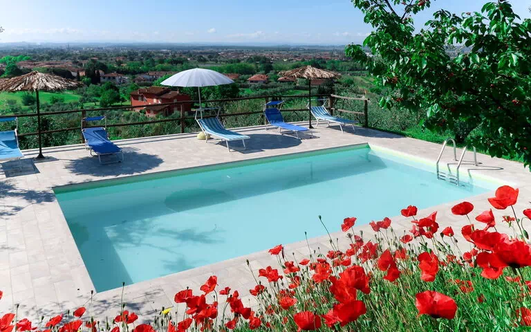 Le jardin en terrasses mesure 3 000 m² et est aménagé avec une pelouse bien entretenue, des arbres matures et un verger productif. Une zone de pelouse dédiée permet de profiter du soleil toscan abondant. La piscine mesure 8 x 4 m avec une profondeur de 120 cm ; elle est disponible du 4 avril au 24 octobre. Une douche extérieure est située à proximité de la piscine. Une terrasse bien aménagée et équipée de mobilier de jardin offre un cadre idéal pour les repas en plein air et la détente ; un barbecue est également disponible sur place.