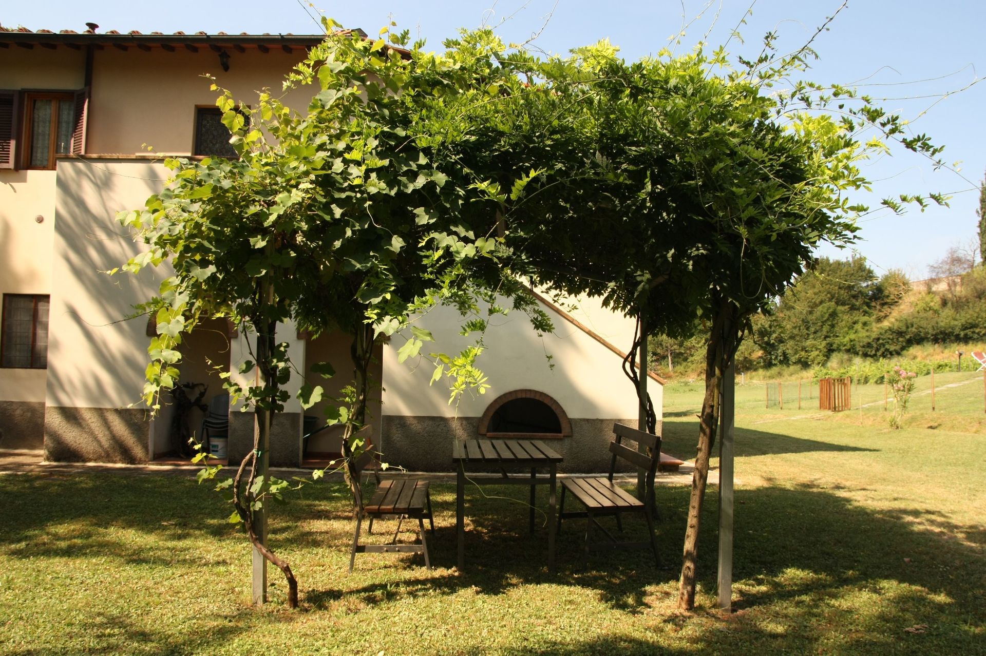 A l'extérieur du Podere, une piscine panoramique, un espace barbecue dans le jardin et des vues sur les collines toscanes.