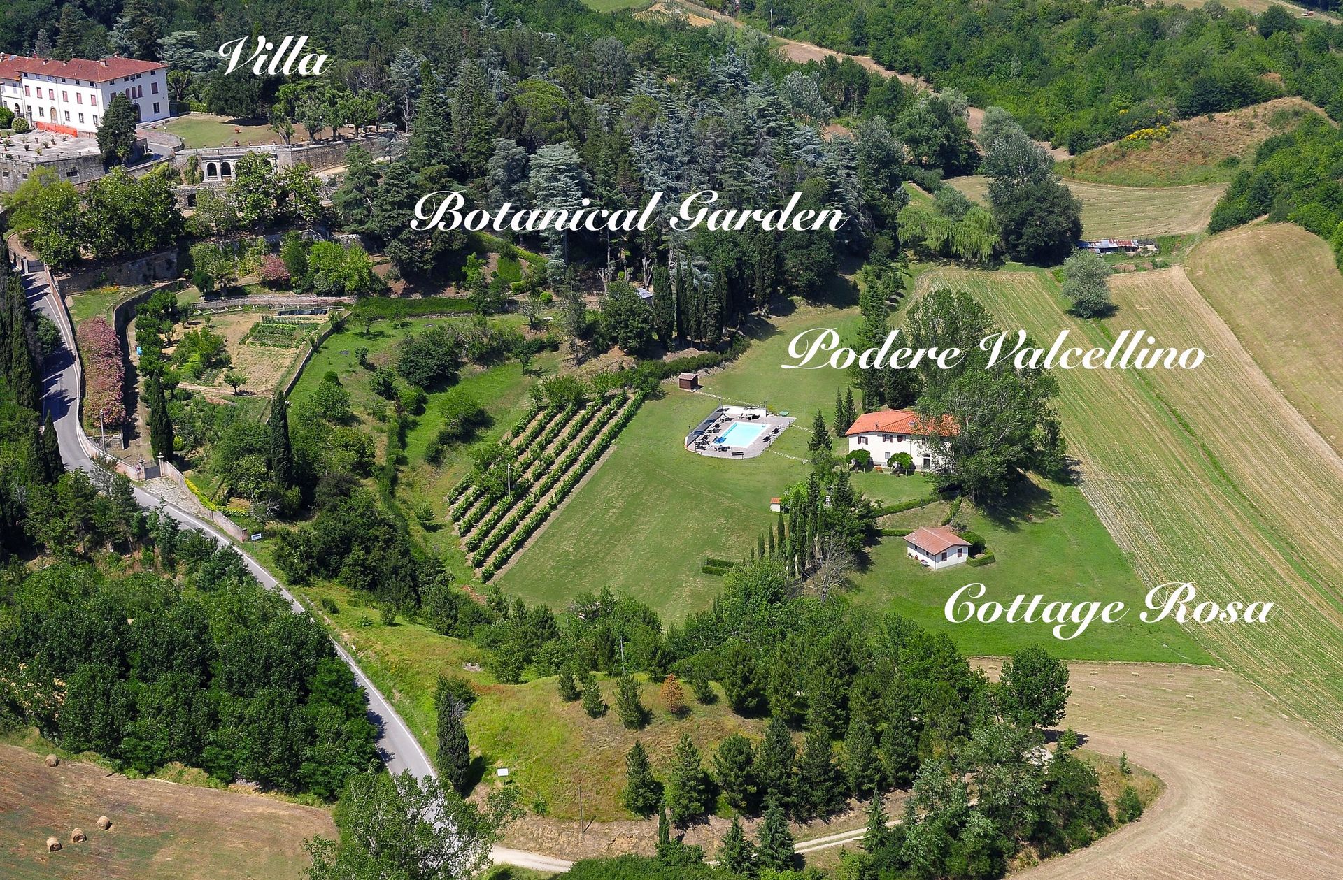 Le domaine comprend une villa du XVIIIe siècle et l'ancienne ferme, à côté de la piscine.