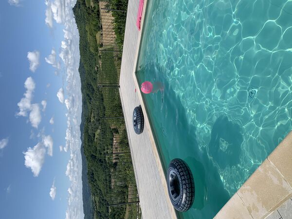 Le jardin privé, soigneusement entretenu et riche en arbres ainsi qu'une section dédiée au jardin naturel, crée un environnement harmonieux et accueillant. La cour offre un espace de vie extérieure polyvalent, tandis que du mobilier de jardin est disponible pour les repas en plein air et la détente. Une douche extérieure est située près de la zone de la piscine. La piscine mesure 10 x 5 mètres avec une profondeur de 150 cm ; elle est disponible du 1er mai au 3 octobre et est équipée d'une couverture à volet pour la sécurité et la facilité d'entretien.