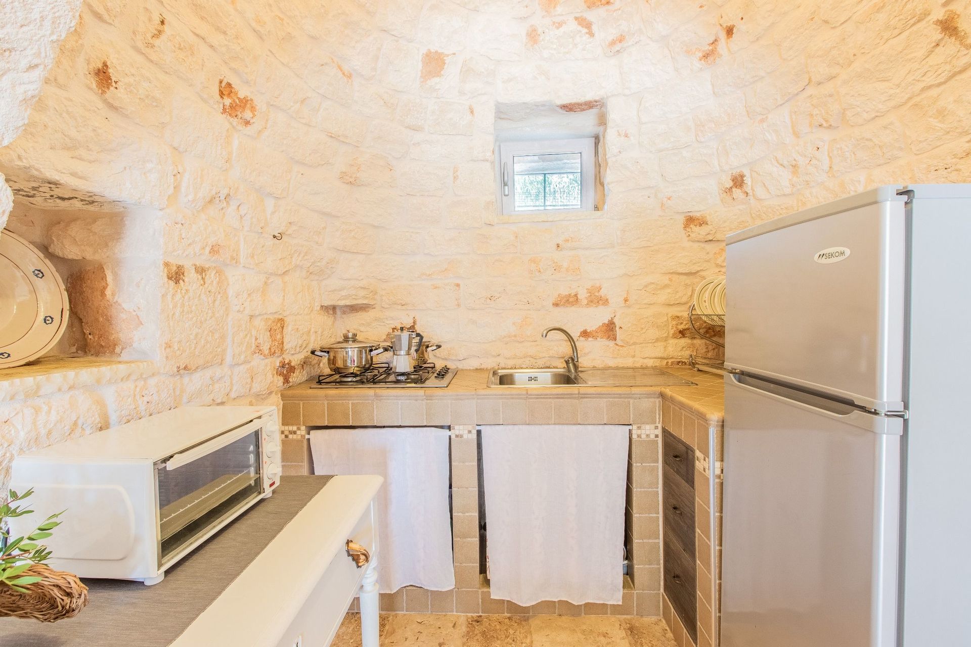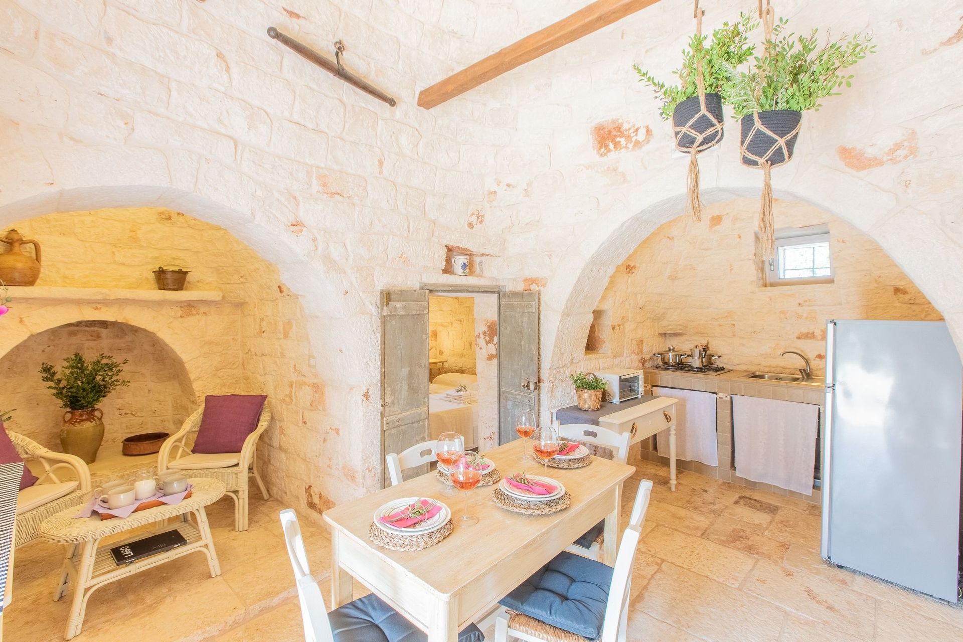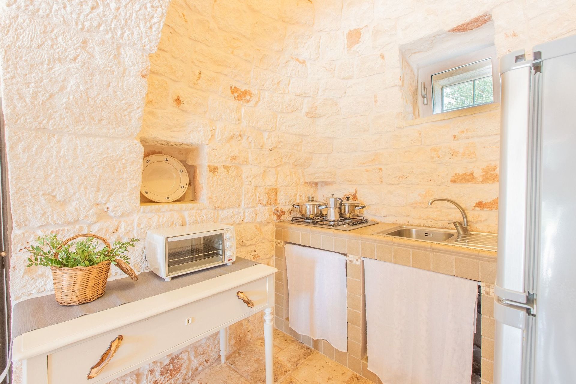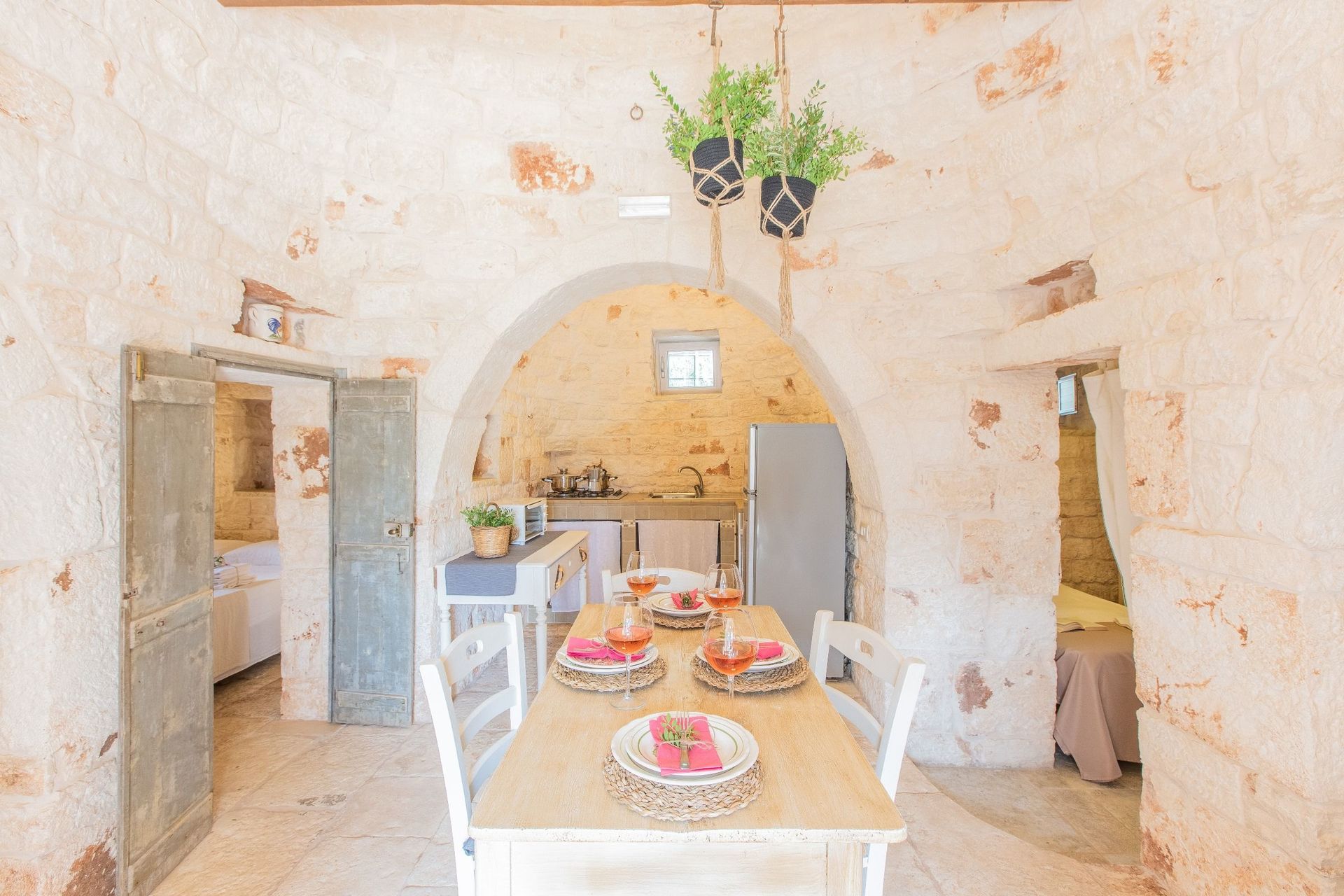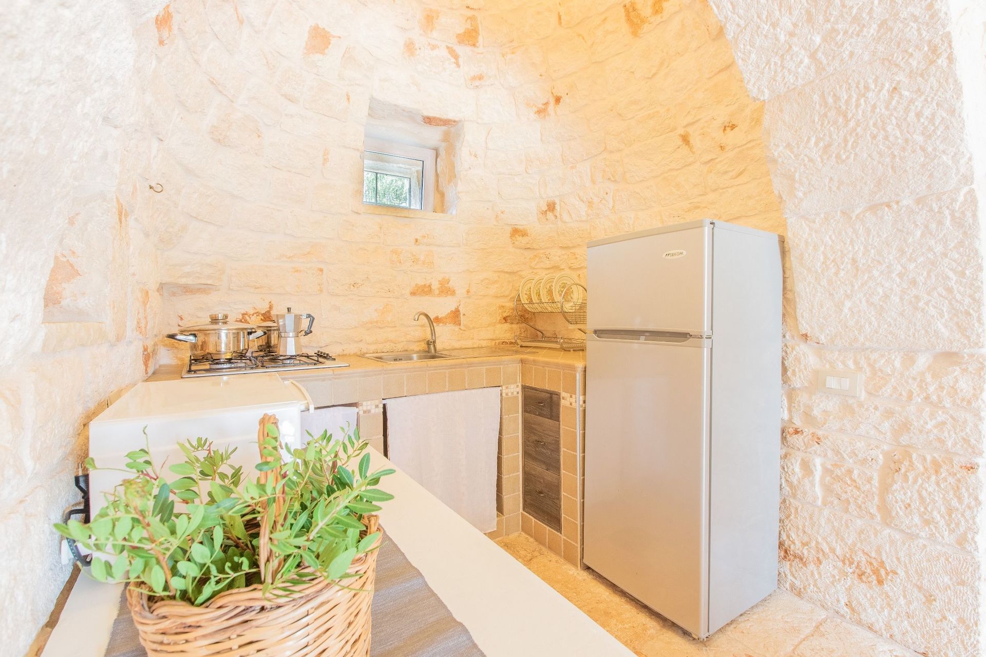 à l'arrivée à Trullo Del Mandarino vous trouverez une jolie propriété, propre et bien entretenue, parfaite pour des vacances calmes en Pouilles. Peu importe comment vous passez vos journées... shopping, visites, visites de musées ou tout simplement en vous baladant à la campagne, quand vous arrivez à la maison, vous pouvez vous délasser à la piscine avec votre famille et vos amis et conclure au mieux un autre jour de vacances en Pouilles. Si vous aimez cuisiner pour la famille et les amis il y a une cuisine bien equipée y compris four micro-onde, grille-pain et réfrigérateur, ainsi que, assez de vaisselle et couverts jusqu'à quatre personnes. Si vous préférez dîner «al fresco», il y a à votre disposition une véranda entièrement meublée où vous pourrez profiter du beau temps tout en mangeant en plein air.