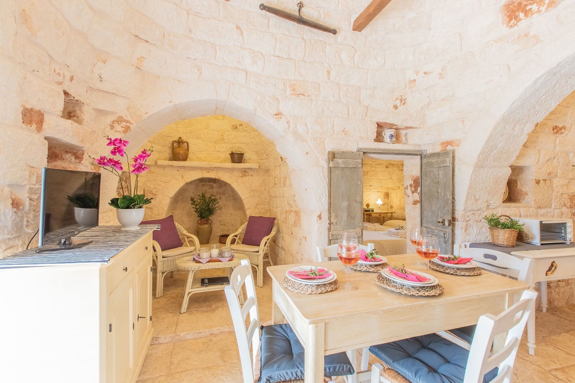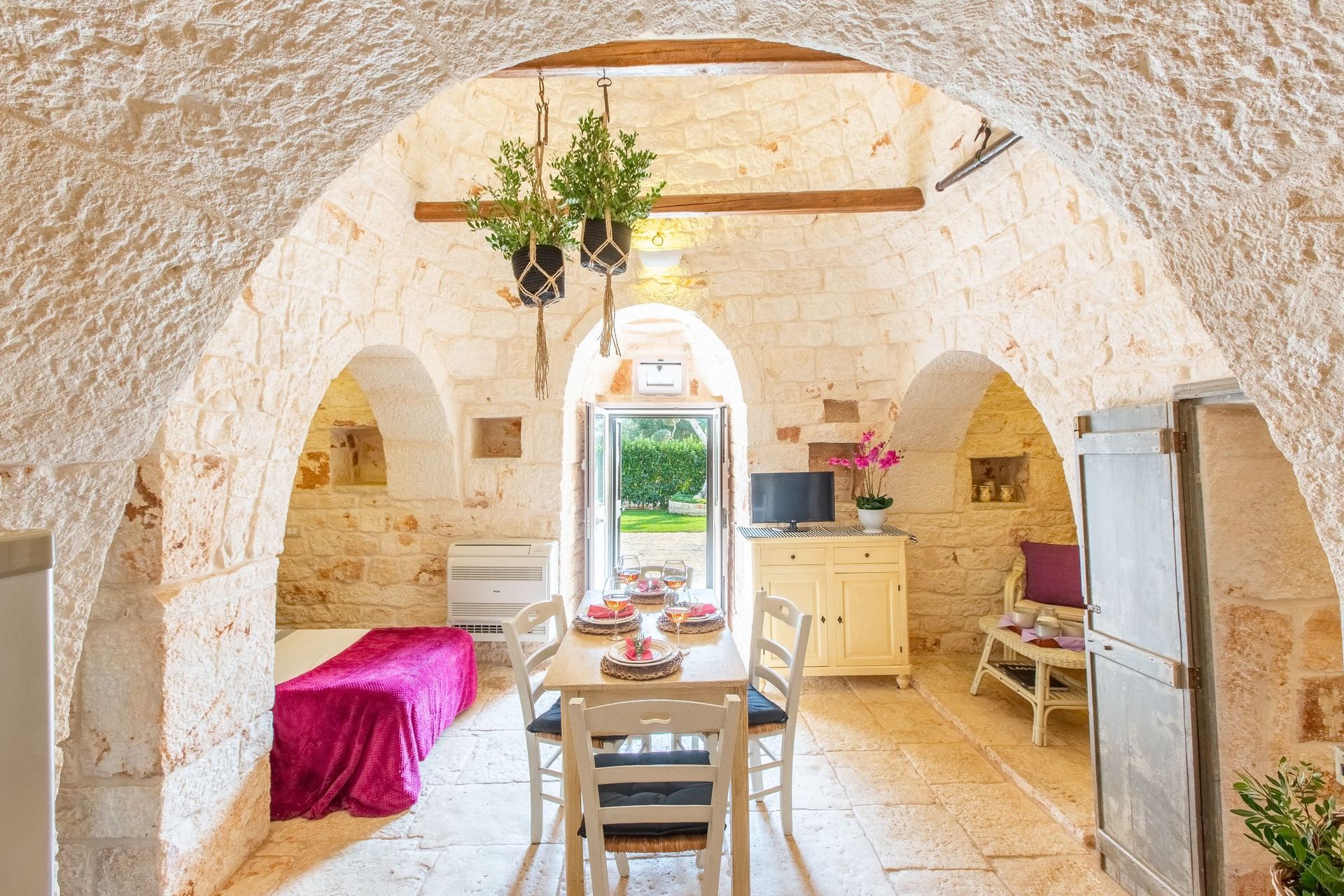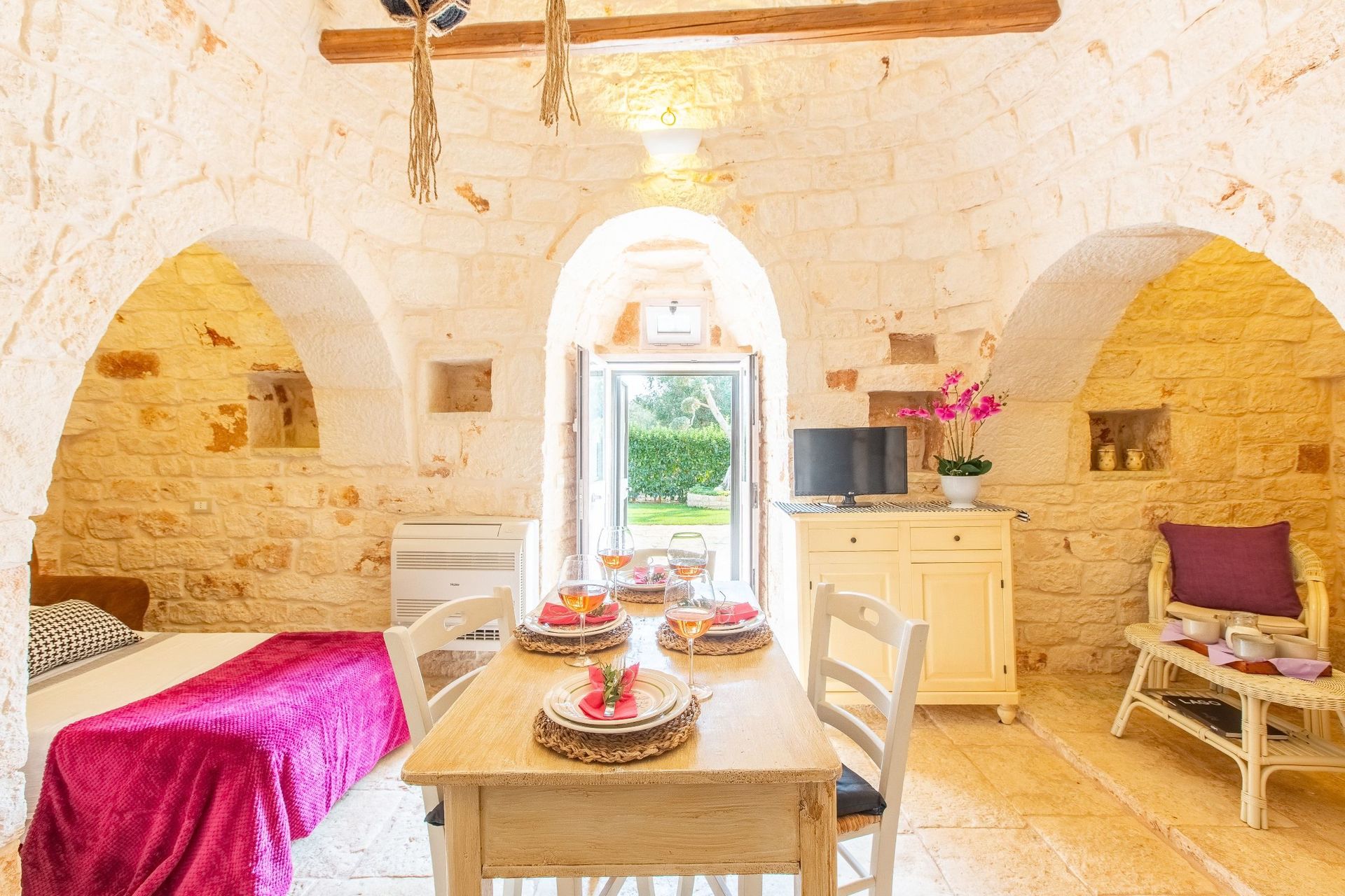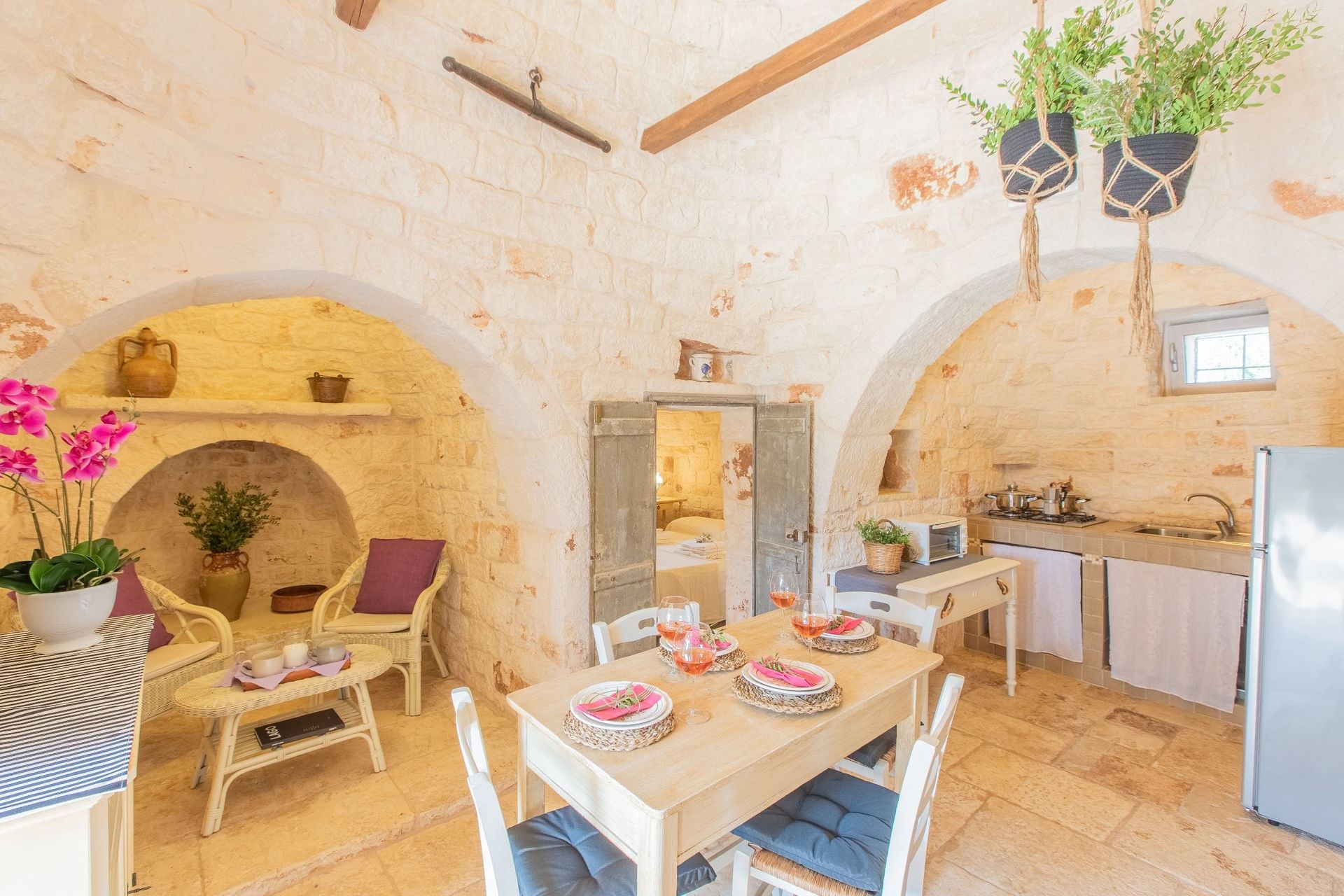 à l'arrivée à Trullo Del Mandarino vous trouverez une jolie propriété, propre et bien entretenue, parfaite pour des vacances calmes en Pouilles. Peu importe comment vous passez vos journées... shopping, visites, visites de musées ou tout simplement en vous baladant à la campagne, quand vous arrivez à la maison, vous pouvez vous délasser à la piscine avec votre famille et vos amis et conclure au mieux un autre jour de vacances en Pouilles. Si vous aimez cuisiner pour la famille et les amis il y a une cuisine bien equipée y compris four micro-onde, grille-pain et réfrigérateur, ainsi que, assez de vaisselle et couverts jusqu'à quatre personnes. Si vous préférez dîner «al fresco», il y a à votre disposition une véranda entièrement meublée où vous pourrez profiter du beau temps tout en mangeant en plein air.