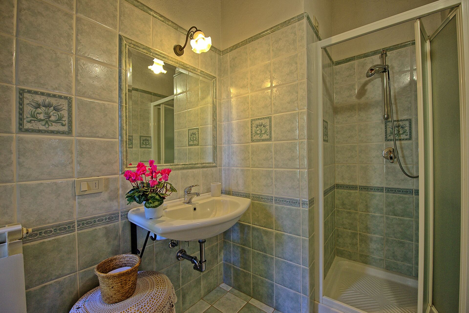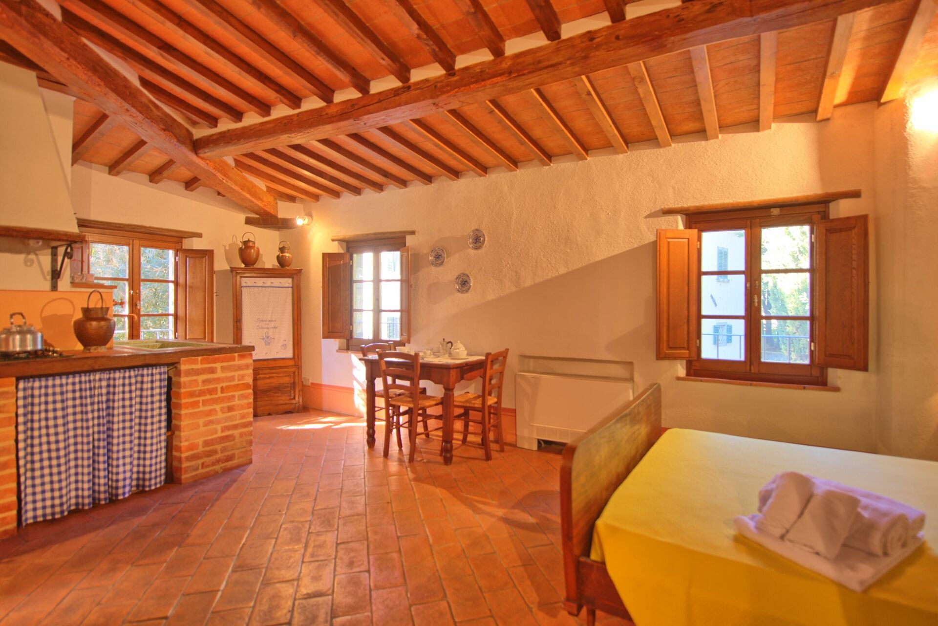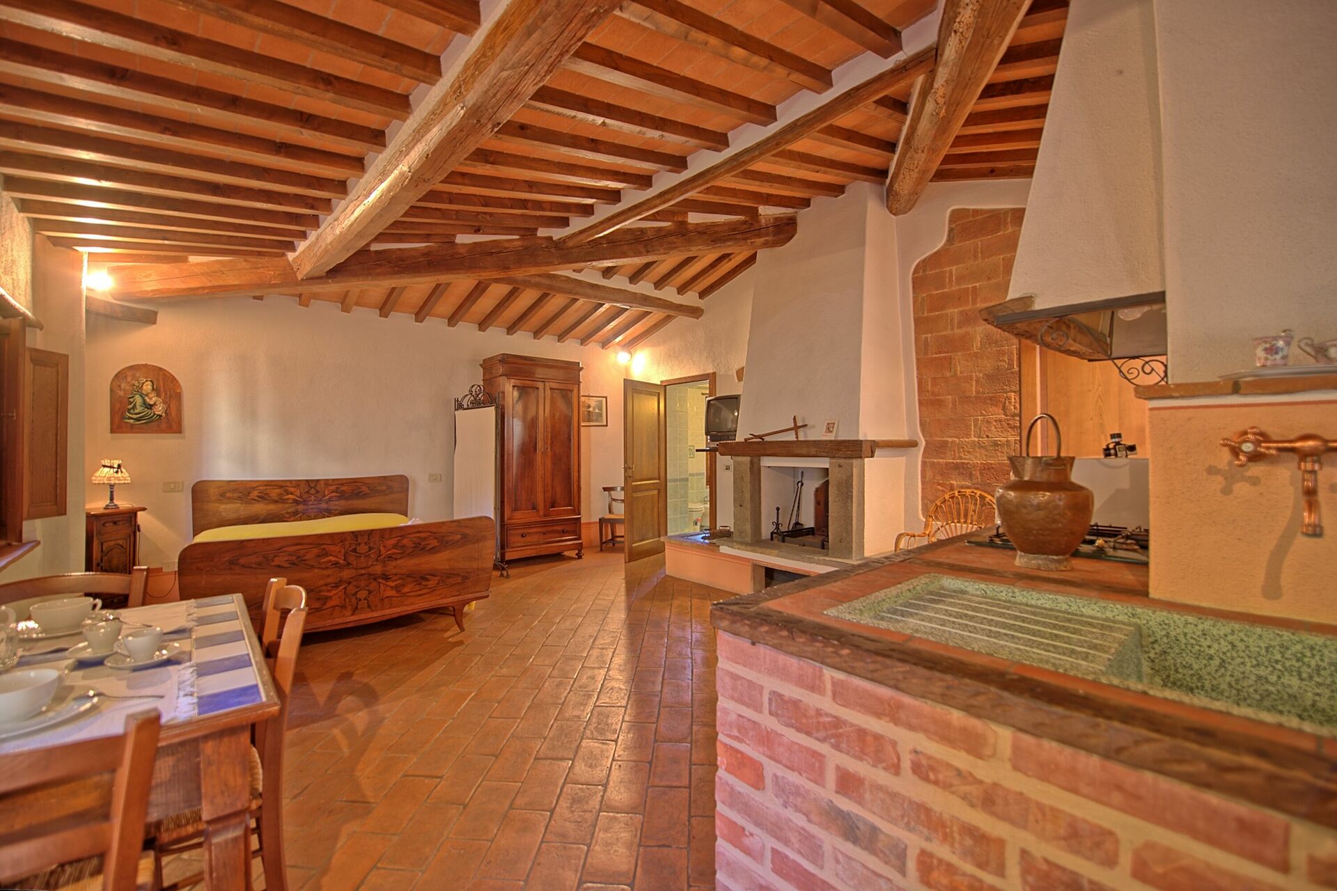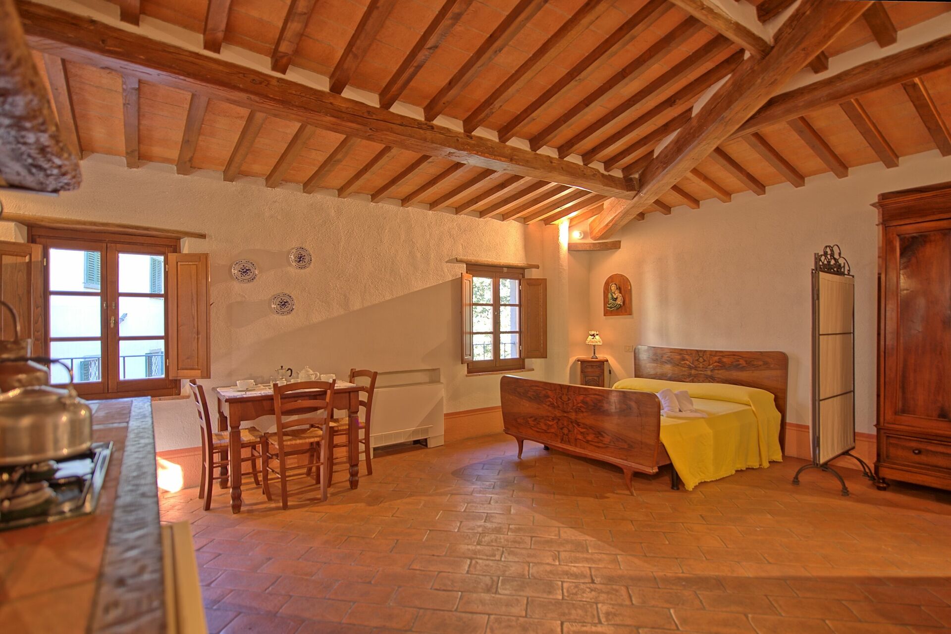 Premier étage: studio (climatisation) avec lit double et coin repas avec cheminée et kitchenette (réfrigérateur, micro-ondes), salle de bains avec douche.
