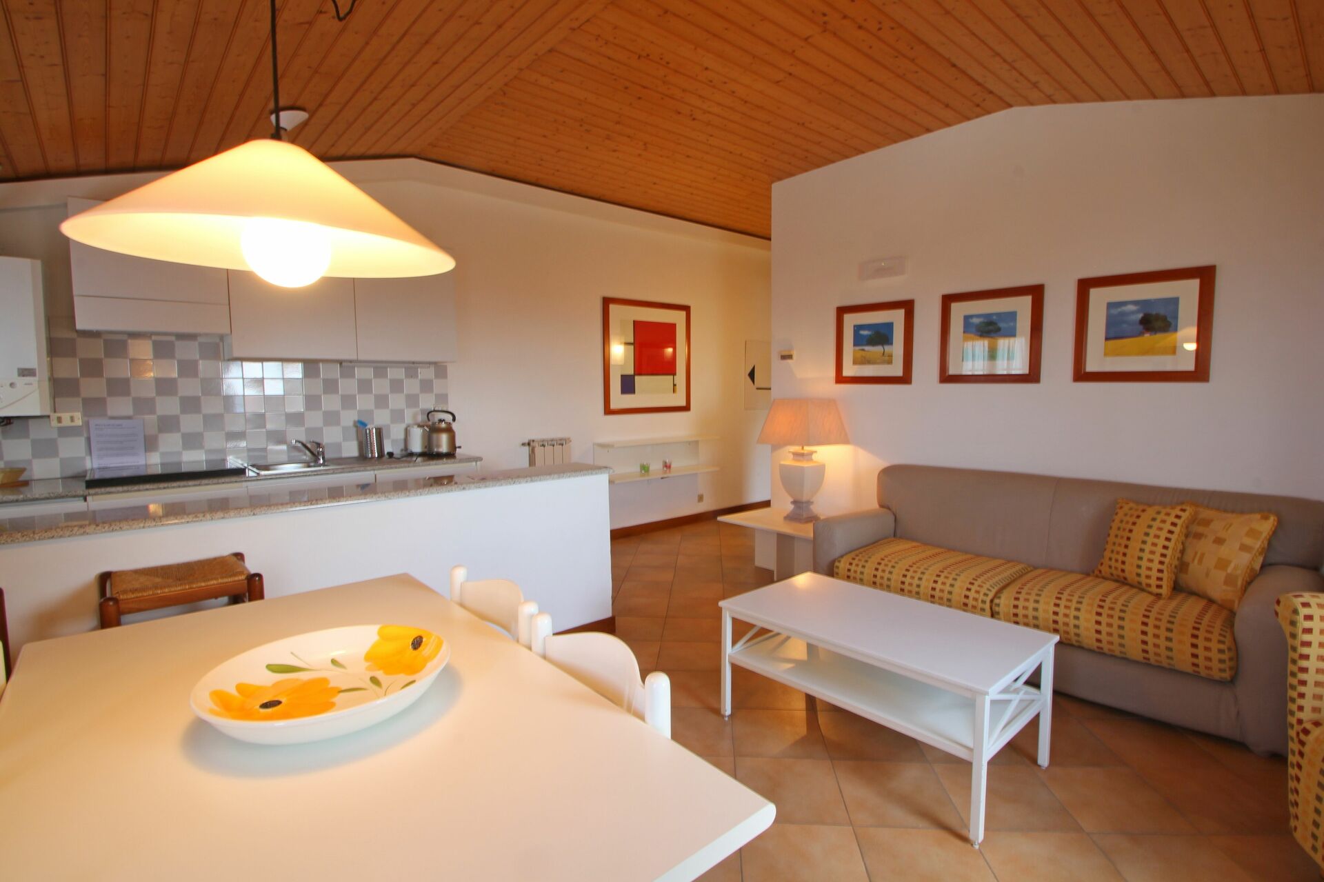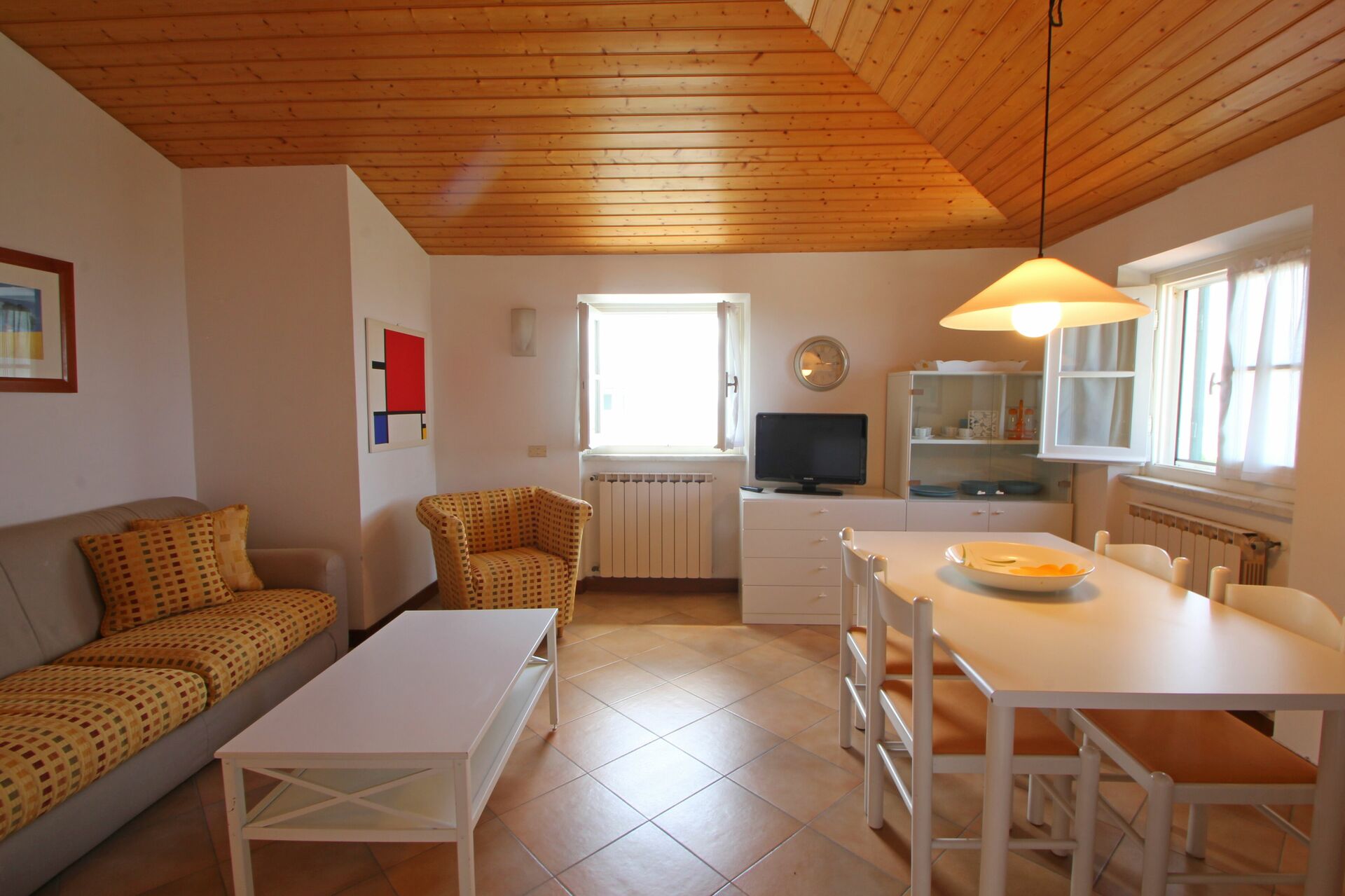 The apartment has a sea view and panoramic view of the hamlets and villages, hallway, shower room with window, open kitchen with dining table, living room with pull-out sofa bed and TV, mosquito nets, WiFi.