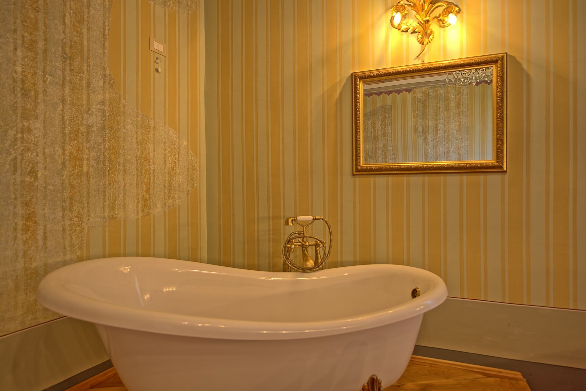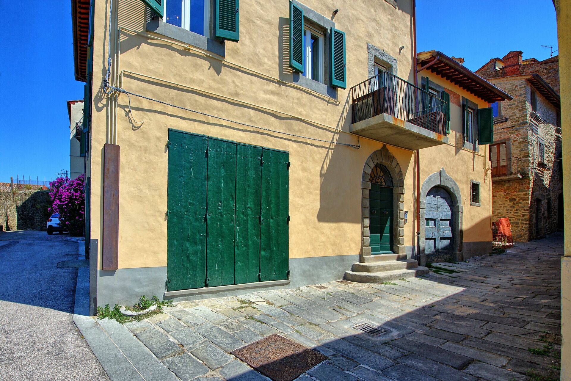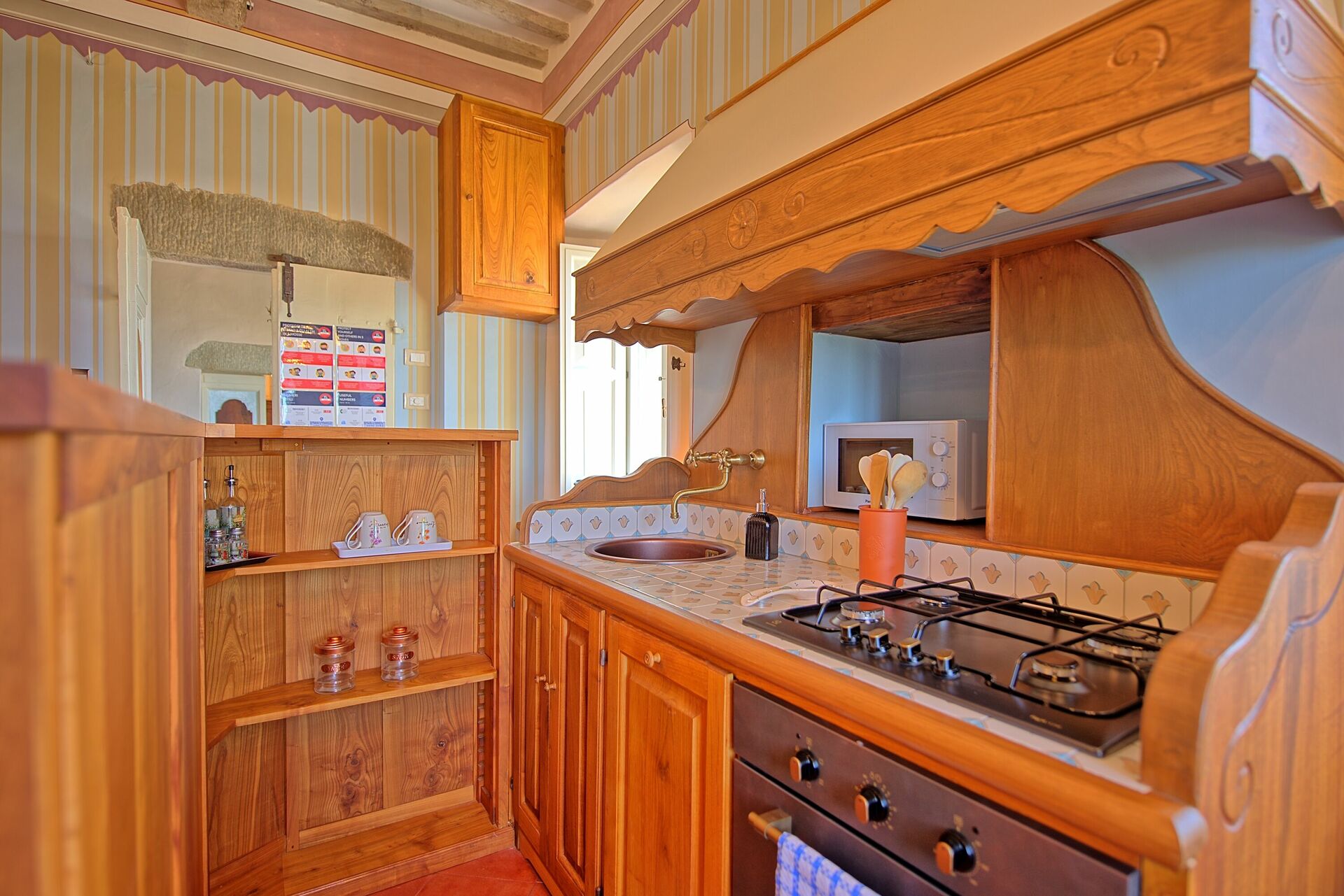 Premier étage : entrée sur le salon (air conditionné) avec TV satellitaire et coin repas avec coin cuisine (four, congélateur, lave-vaisselle, micro-ondes, machine à café à capsules, grille-pain), salle de bain avec douche, chambre à coucher avec lit double, lit simple et baignoire.