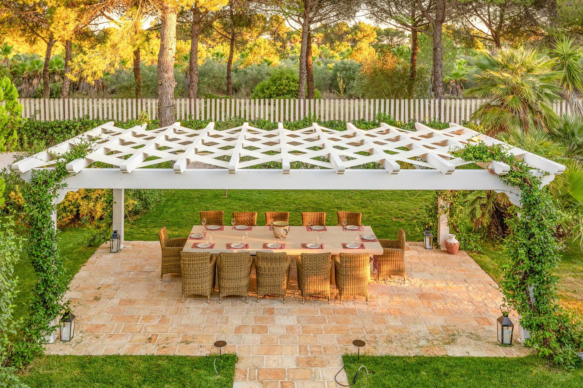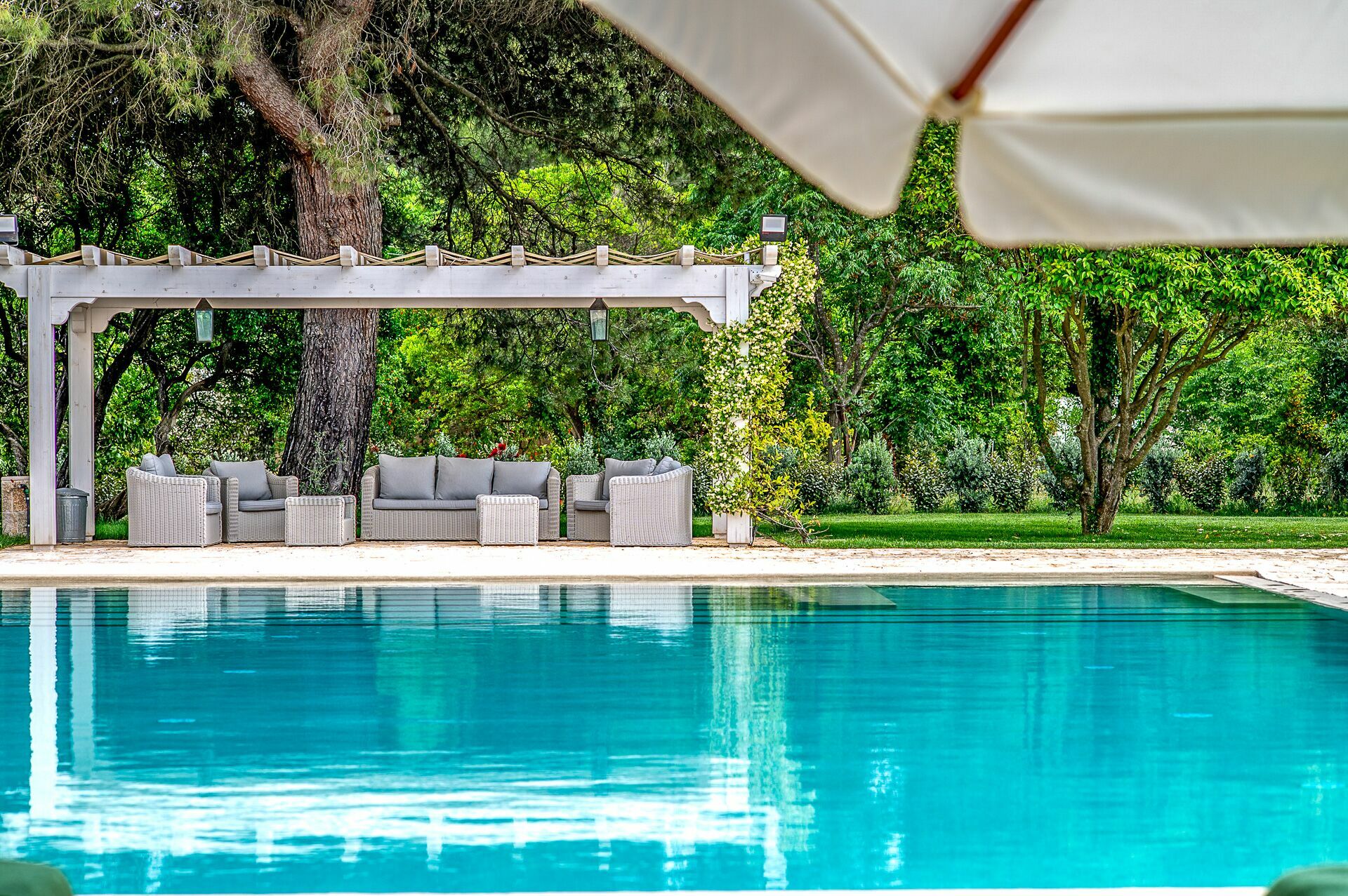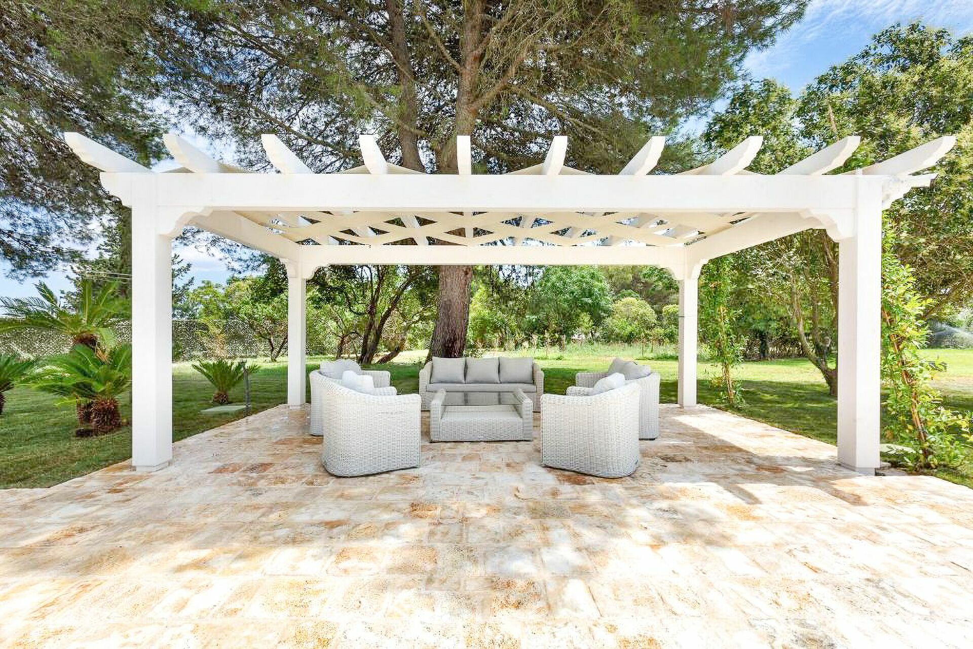 The nature is the uncontaminated one of Puglia and the only light is that of the Alto Salento. Villa Oria, finished renovating in July 2020, embellished with a large well-kept garden, with lawn and various relaxation areas such as covered gazebos, poolside solarium and green paths.