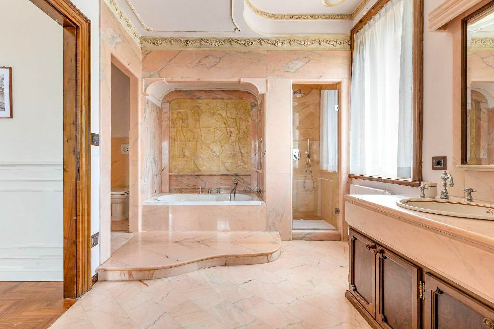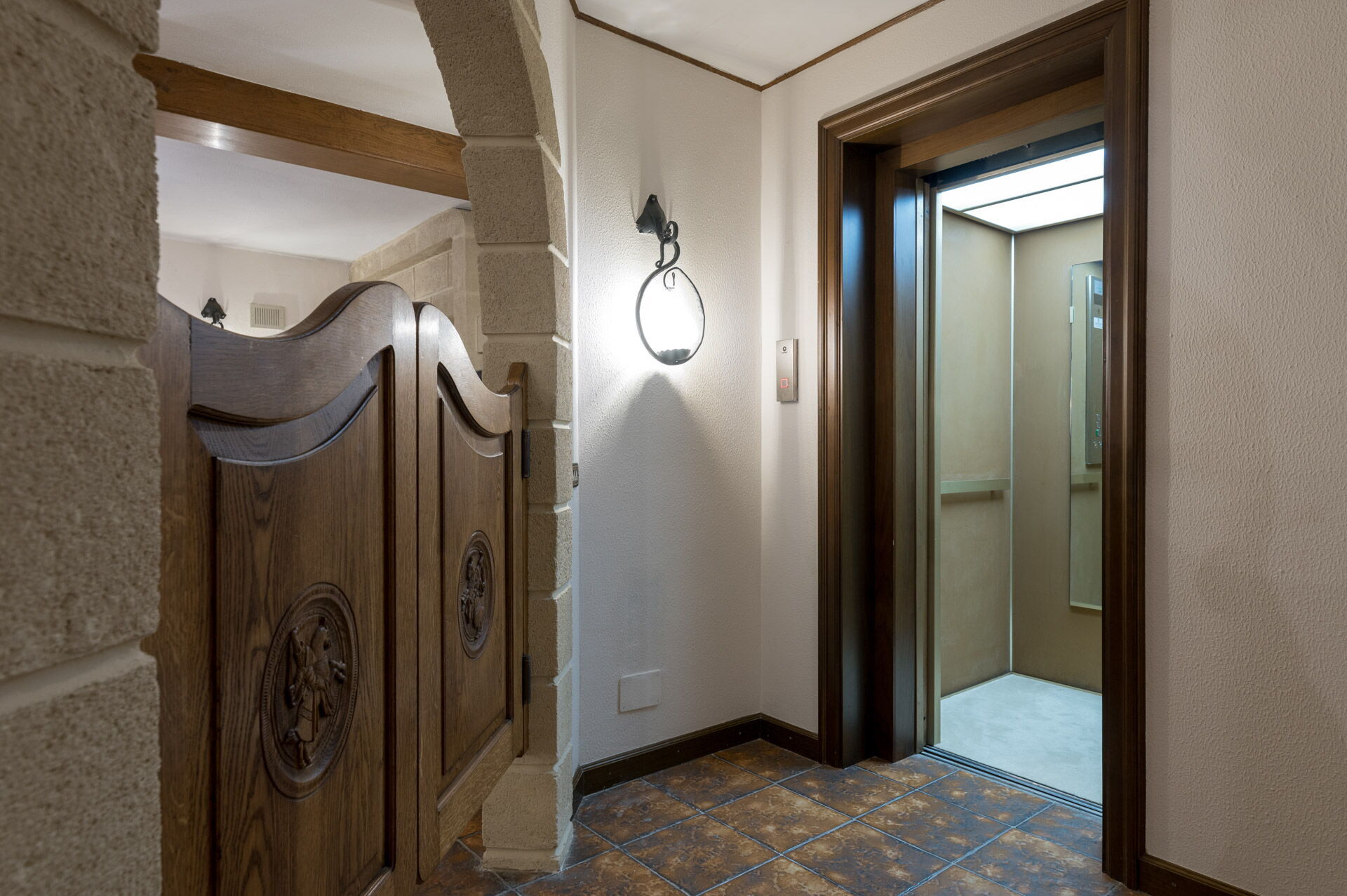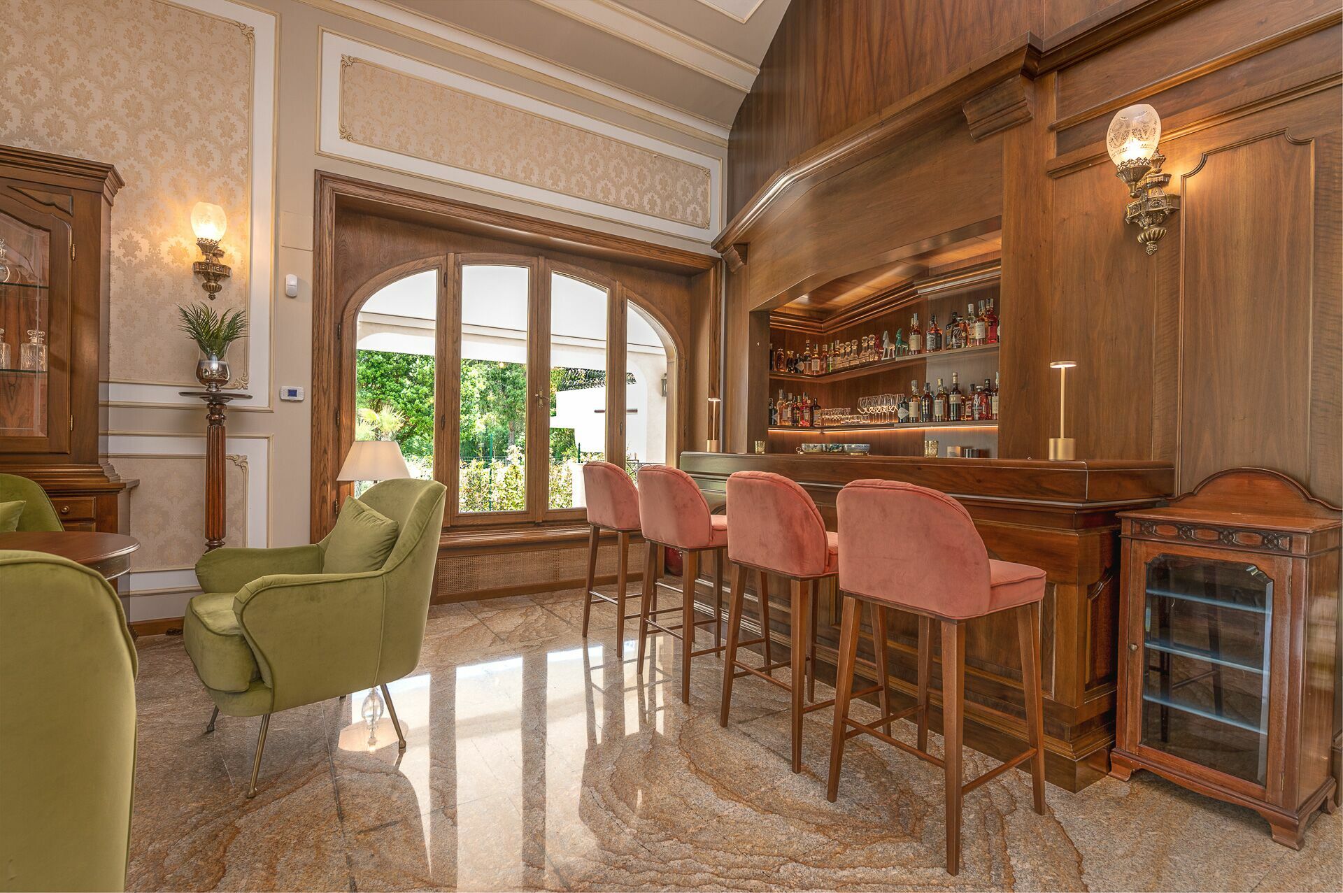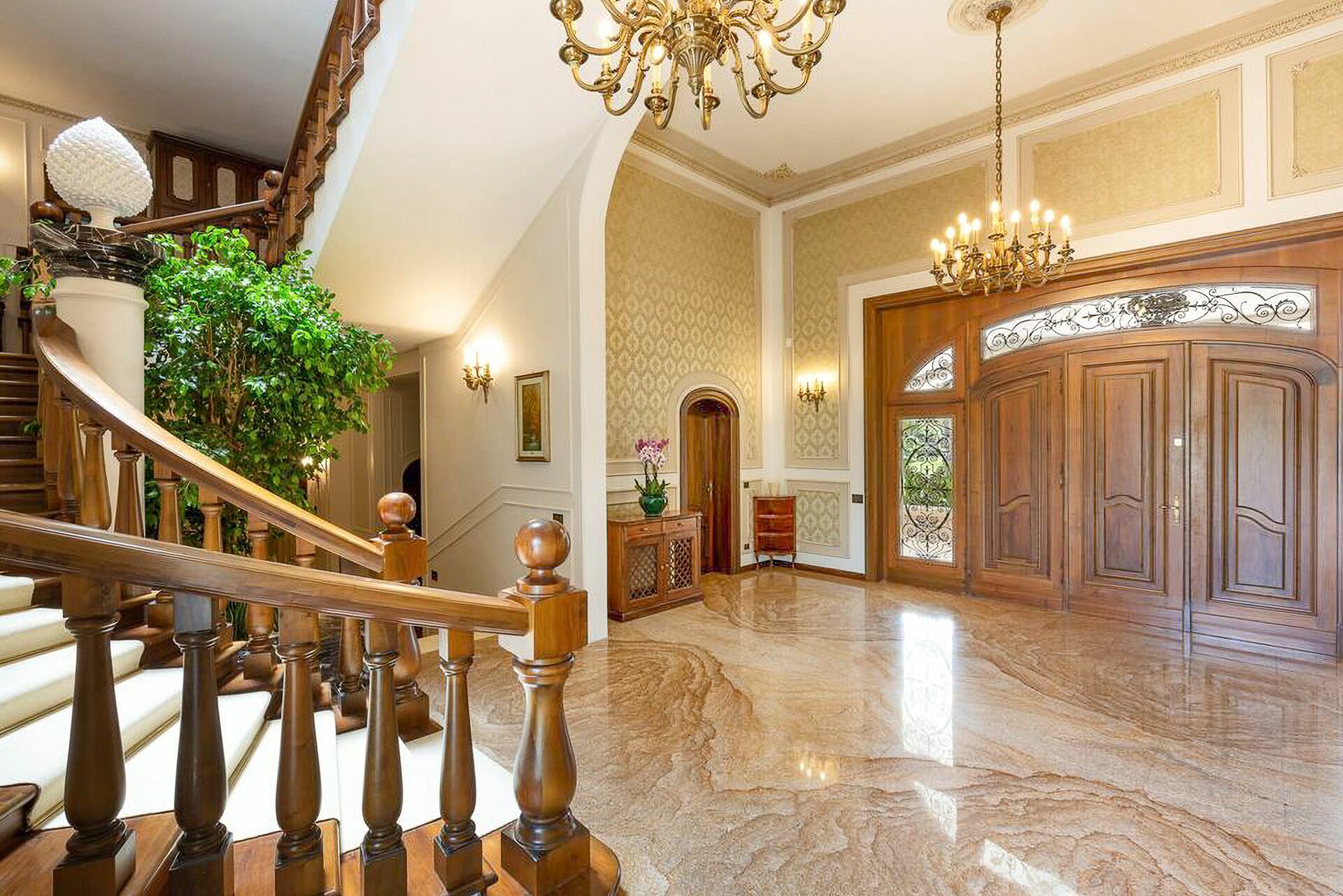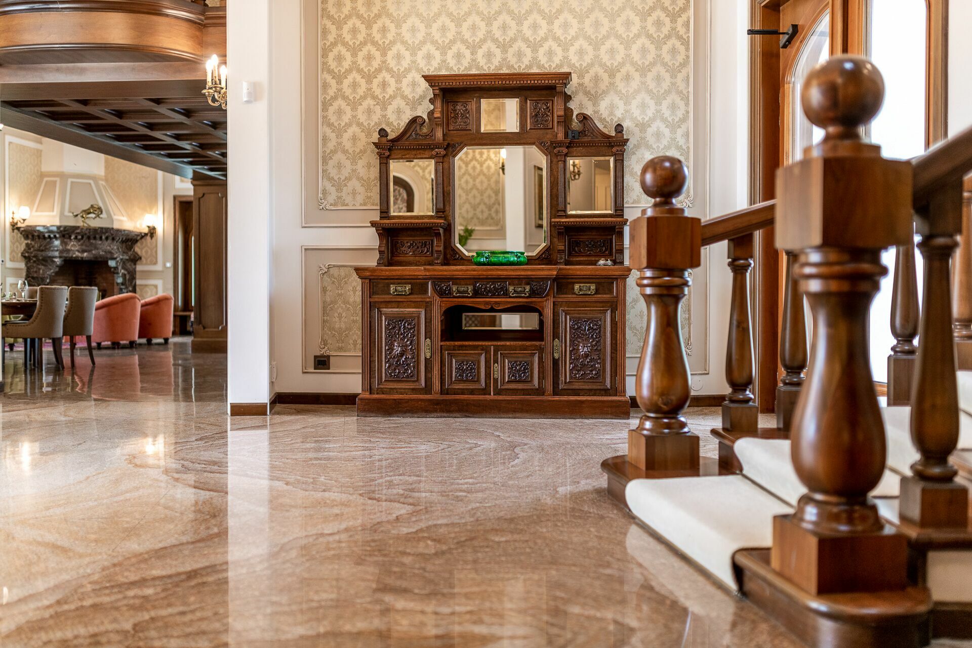 The interiors are characterized by marble and wooden coatings and fine furnishings.