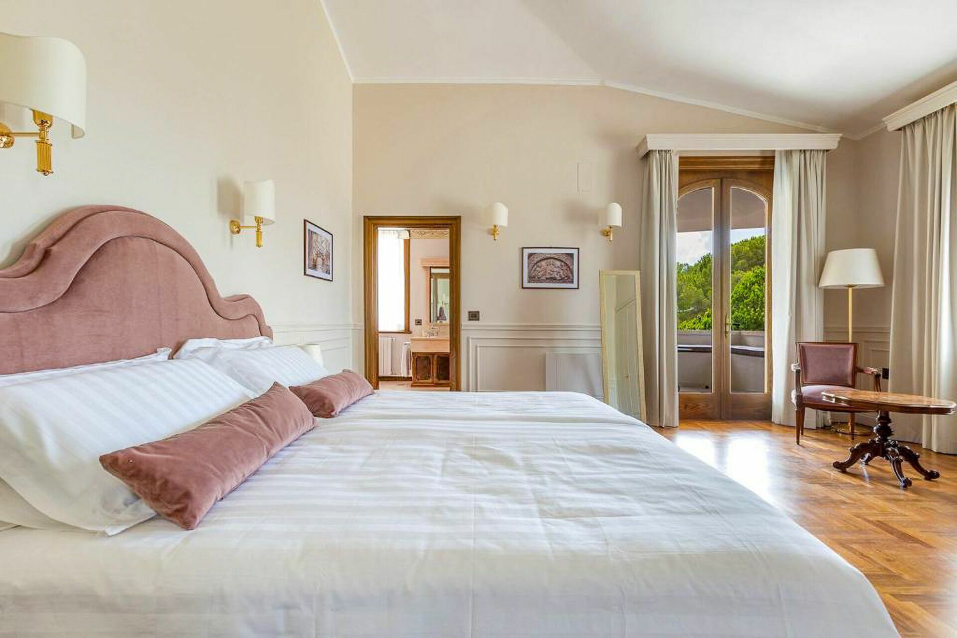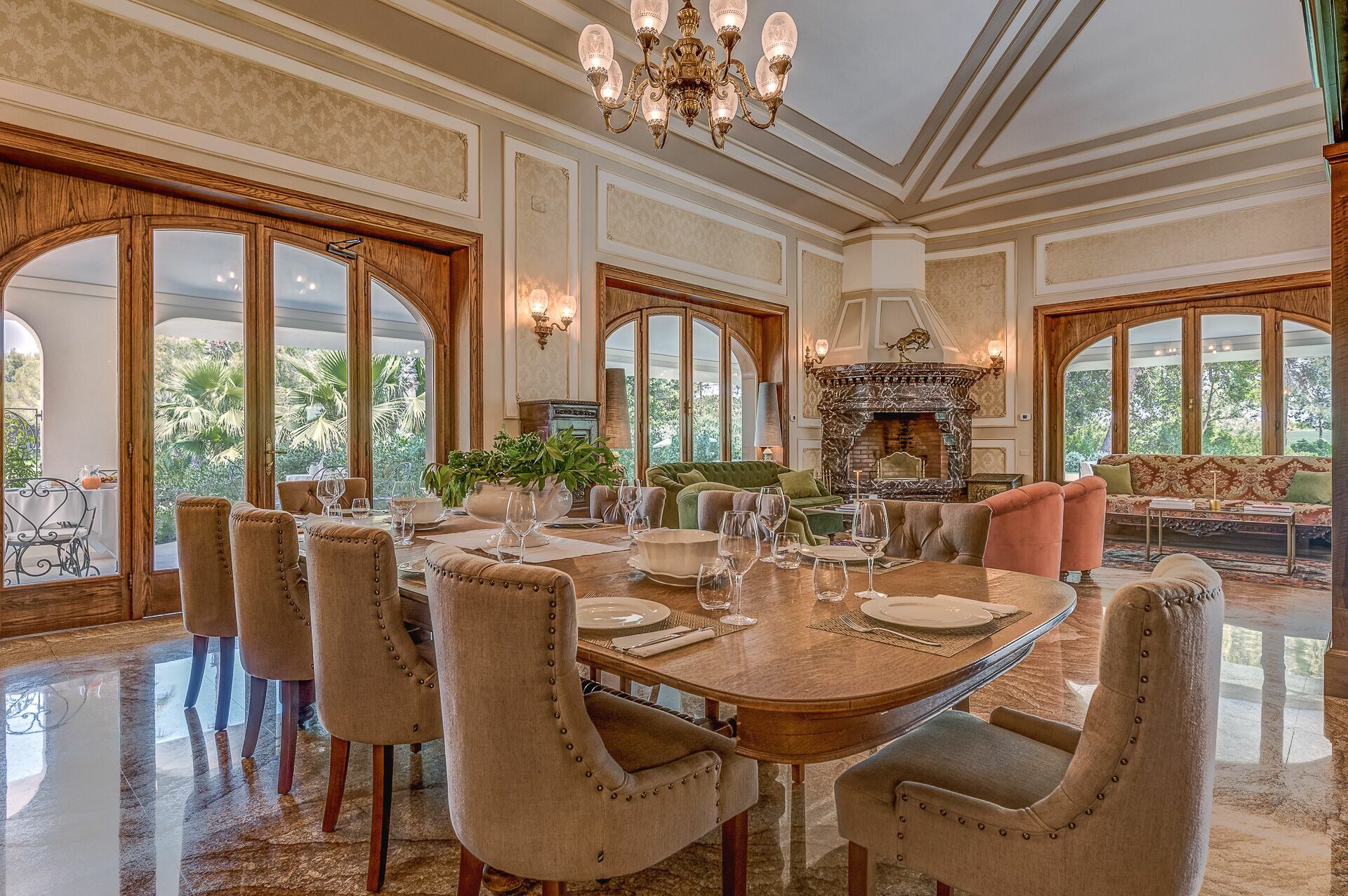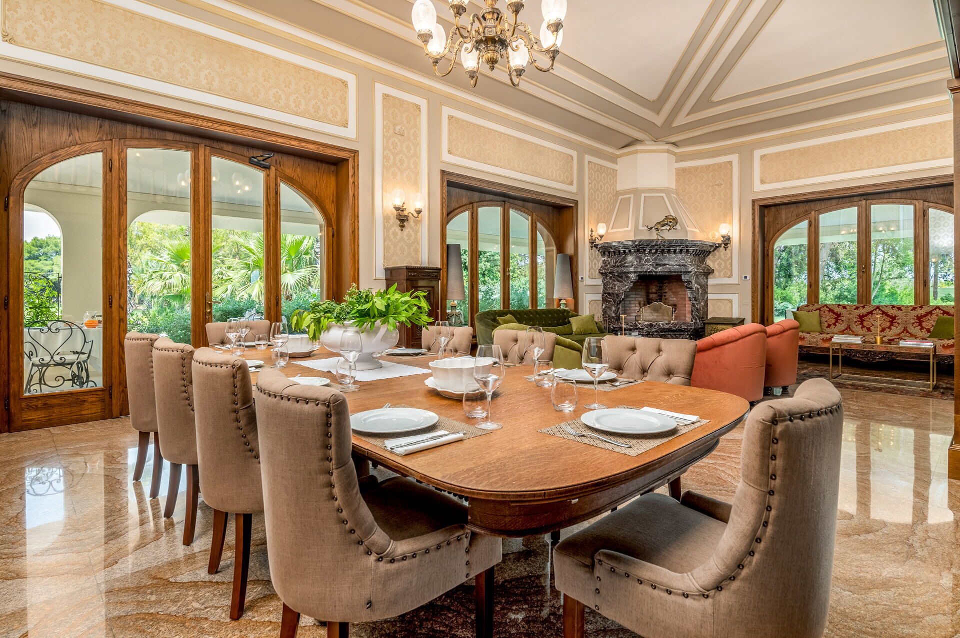 The interiors of Villa Oria are precious, characterized by polychrome marble and wood inlaid by master cabinetmakers. In addition to the large living rooms, the fully equipped kitchen with direct exit to the garden, the villa accommodates from 14 to 18 people thanks to the beautiful and spacious suites on three levels, served by an internal lift.