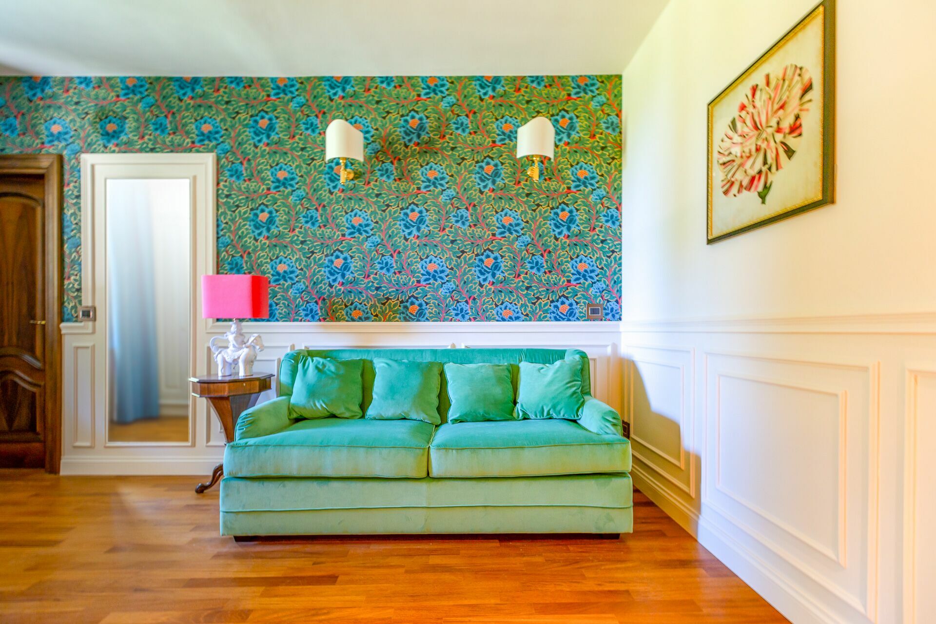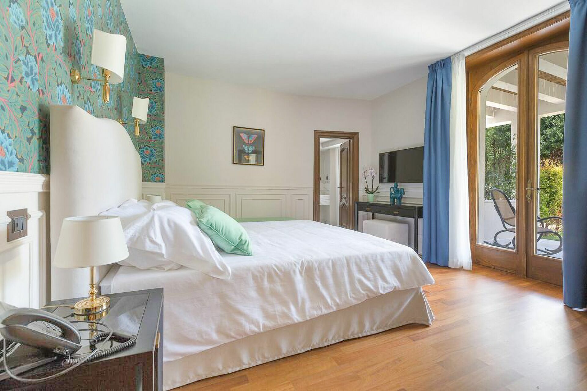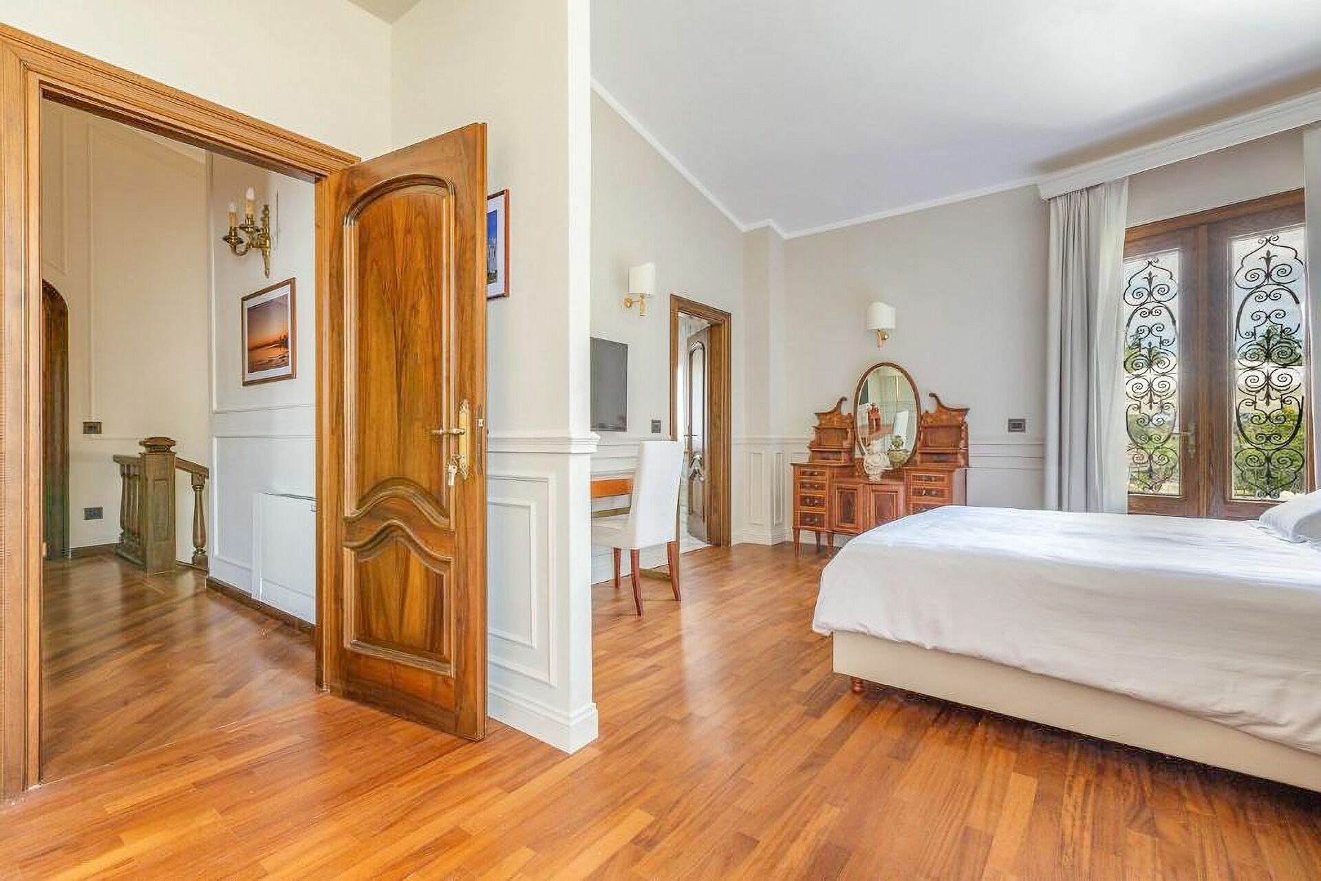 The interiors of Villa Oria are precious, characterized by polychrome marble and wood inlaid by master cabinetmakers. In addition to the large living rooms, the fully equipped kitchen with direct exit to the garden, the villa accommodates from 14 to 18 people thanks to the beautiful and spacious suites on three levels, served by an internal lift.