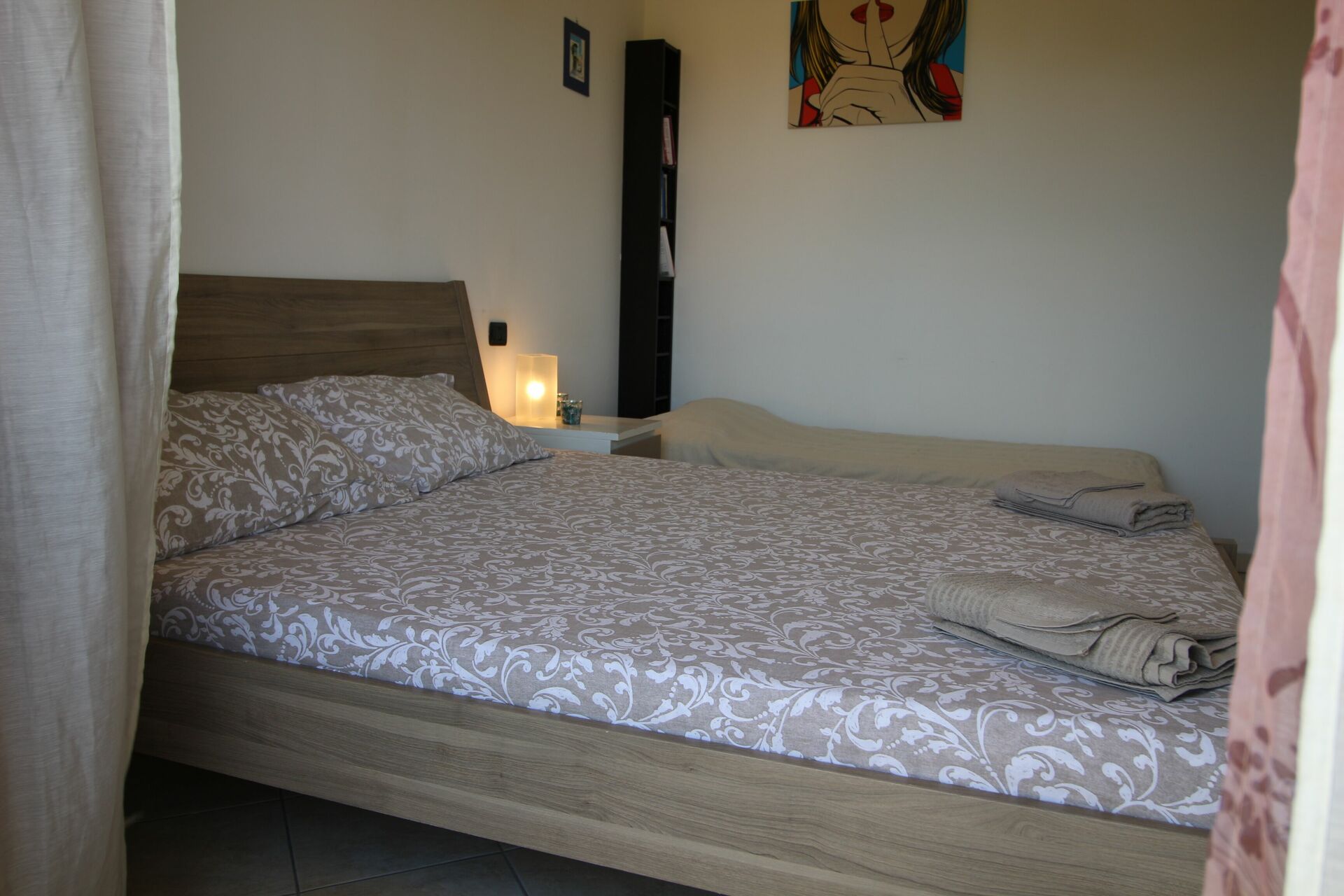 Cuisine – salle de séjour (20 m2): cuisine bien équipée, table à manger, lave-vaisselle, réfrigérateur, congélateur, four, grille-pain, machine à café italienne, machine à café américaine, canapé, canapé-lit double, tv satellitaire, ventilateur portable, sortie sur le balcon.