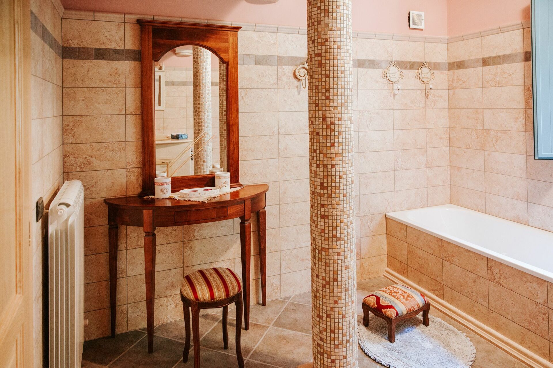 chambre avec salle de bain 2: lit double, internet WIFI, fauteuil, bureau, bassin, wc, bidet, douche, sèche-cheveux.