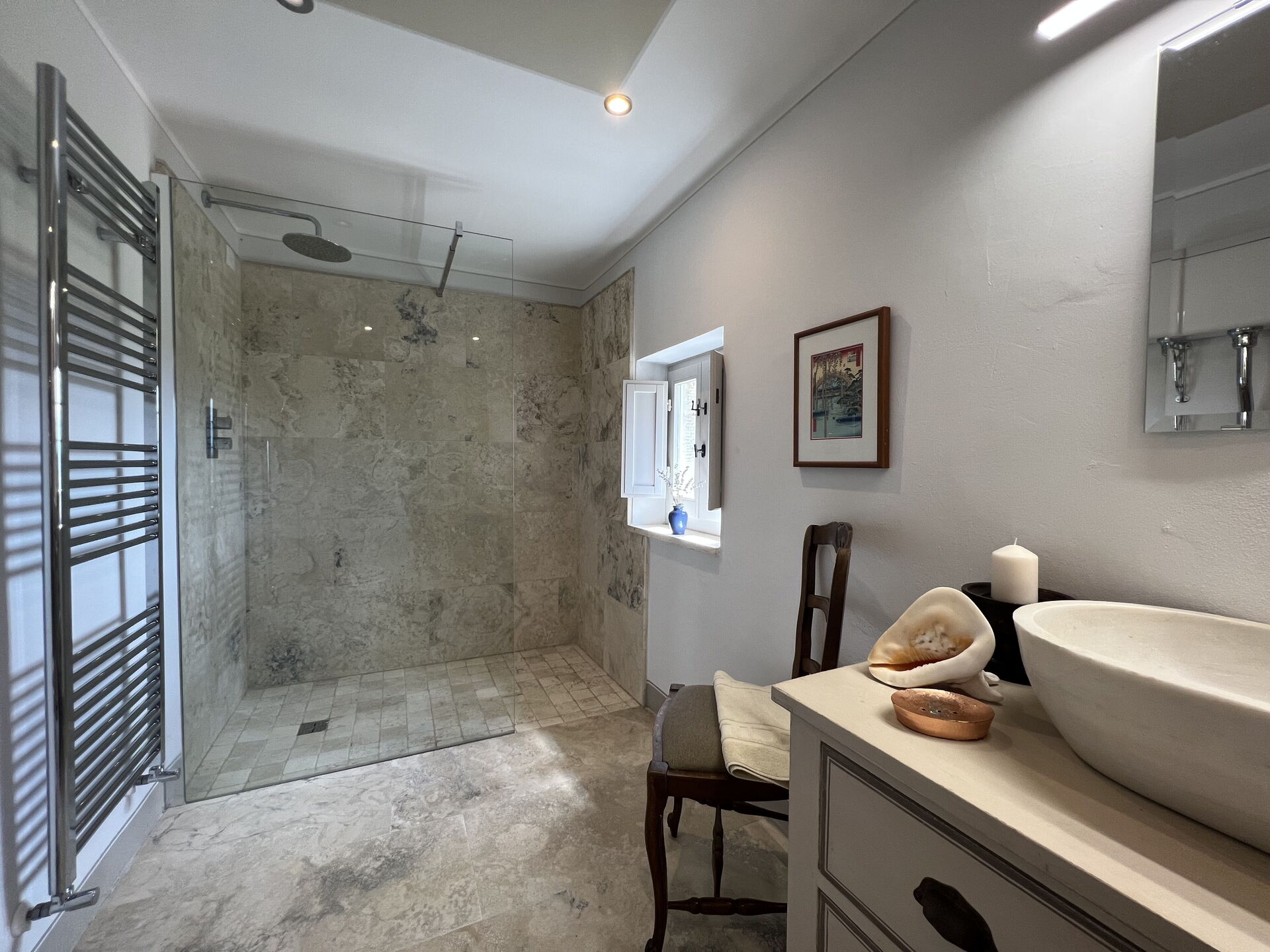 chambre avec salle de bain 1: lit double, internet WIFI, climatisation, bassin, wc, douche, sèche-cheveux, sortie sur la terrasse.