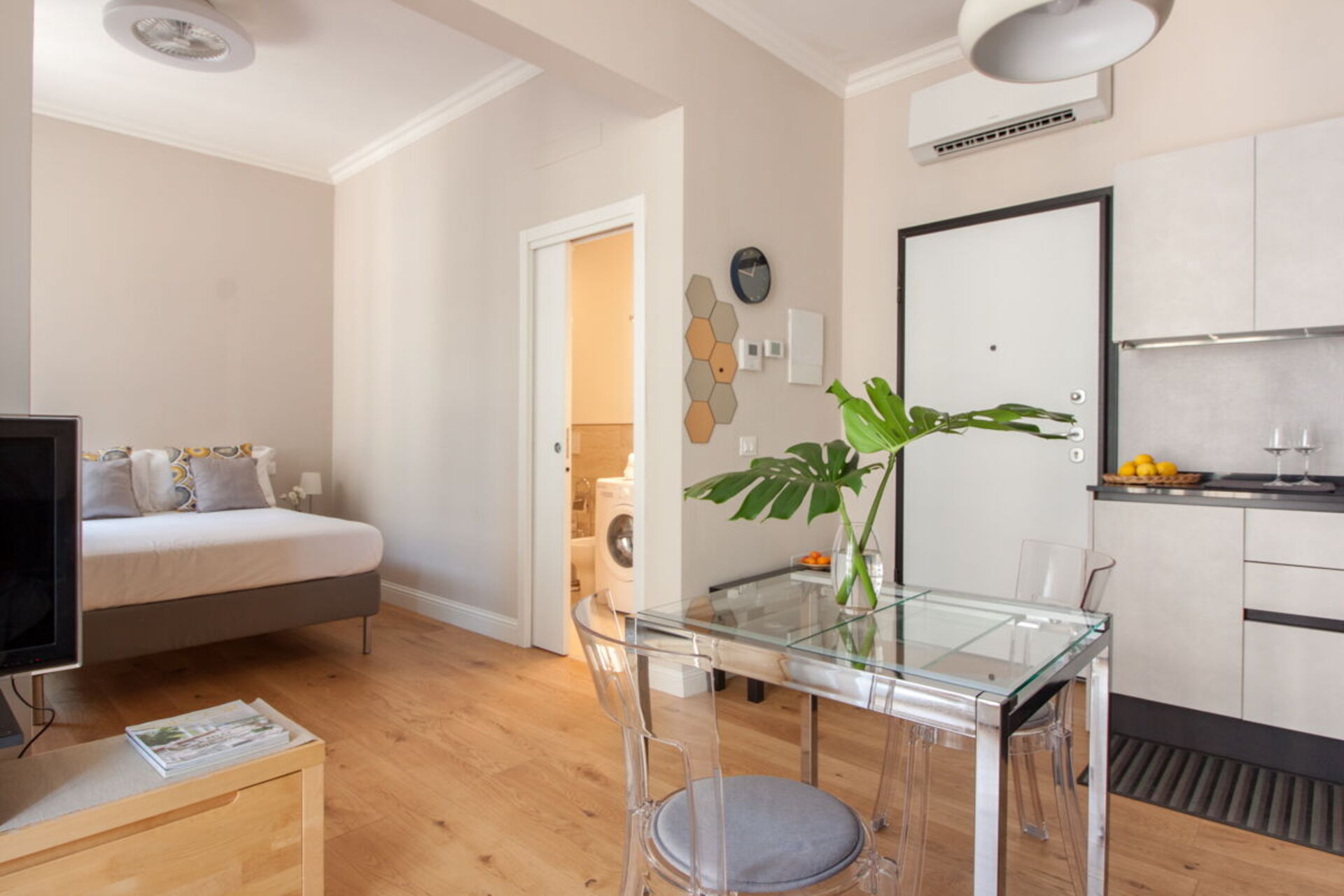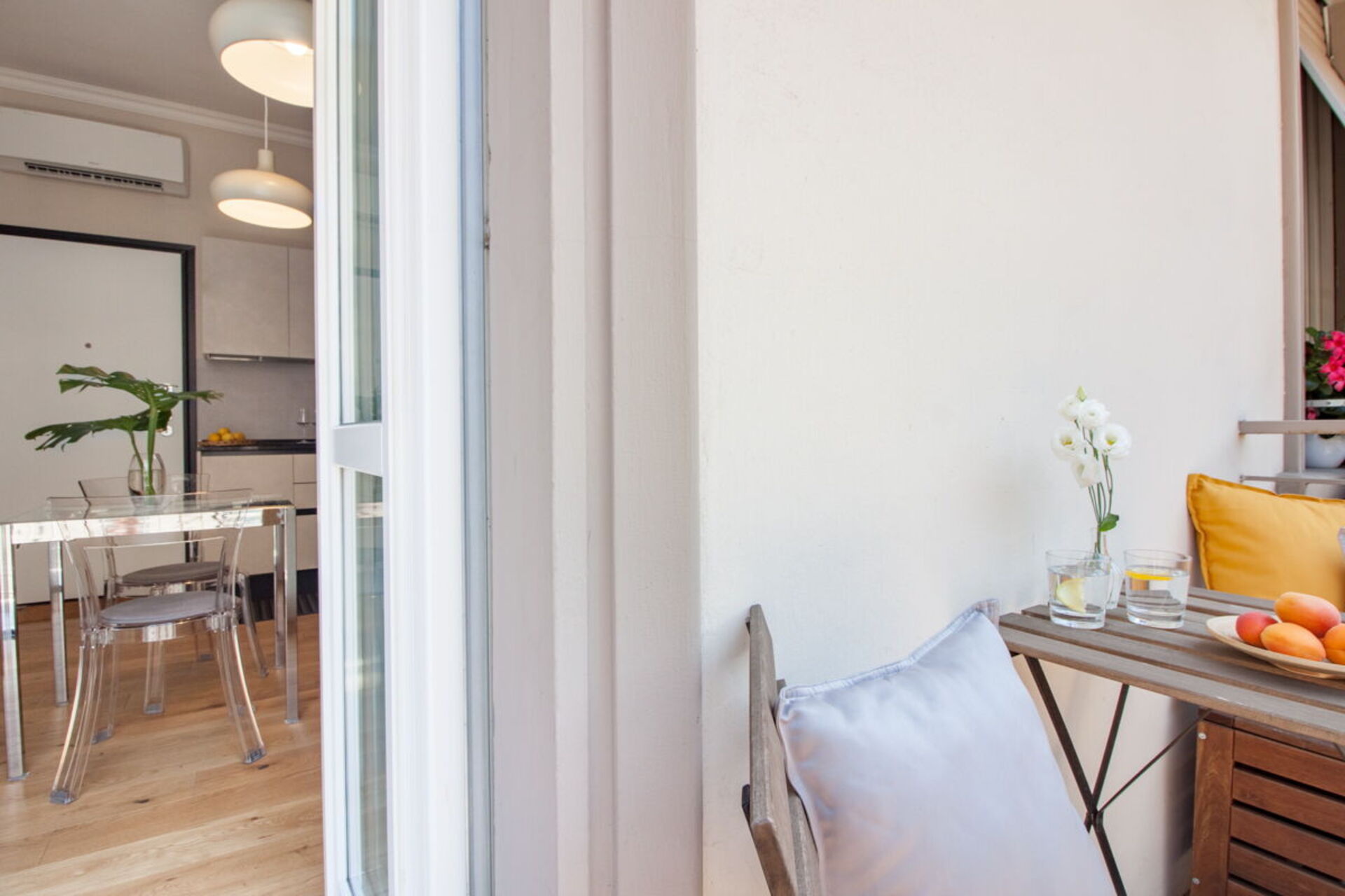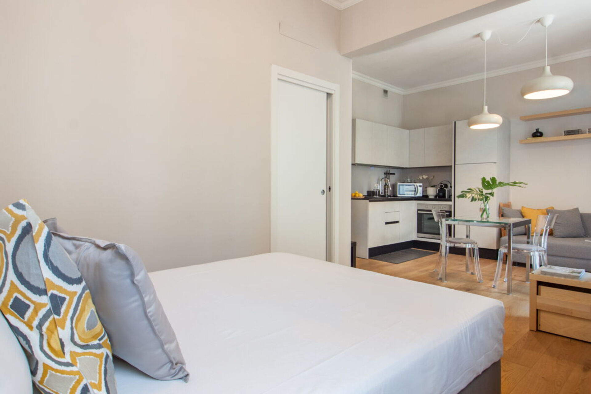 Cuisine – salle de séjour: cuisine bien équipée, table à manger, lave-vaisselle, réfrigérateur, congélateur, cuisinière, four, grille-pain, machine à café italienne, machine à café américaine, bureau, canapé-lit double, internet WIFI, internet, climatisation, tv satellitaire, sortie sur le balcon.