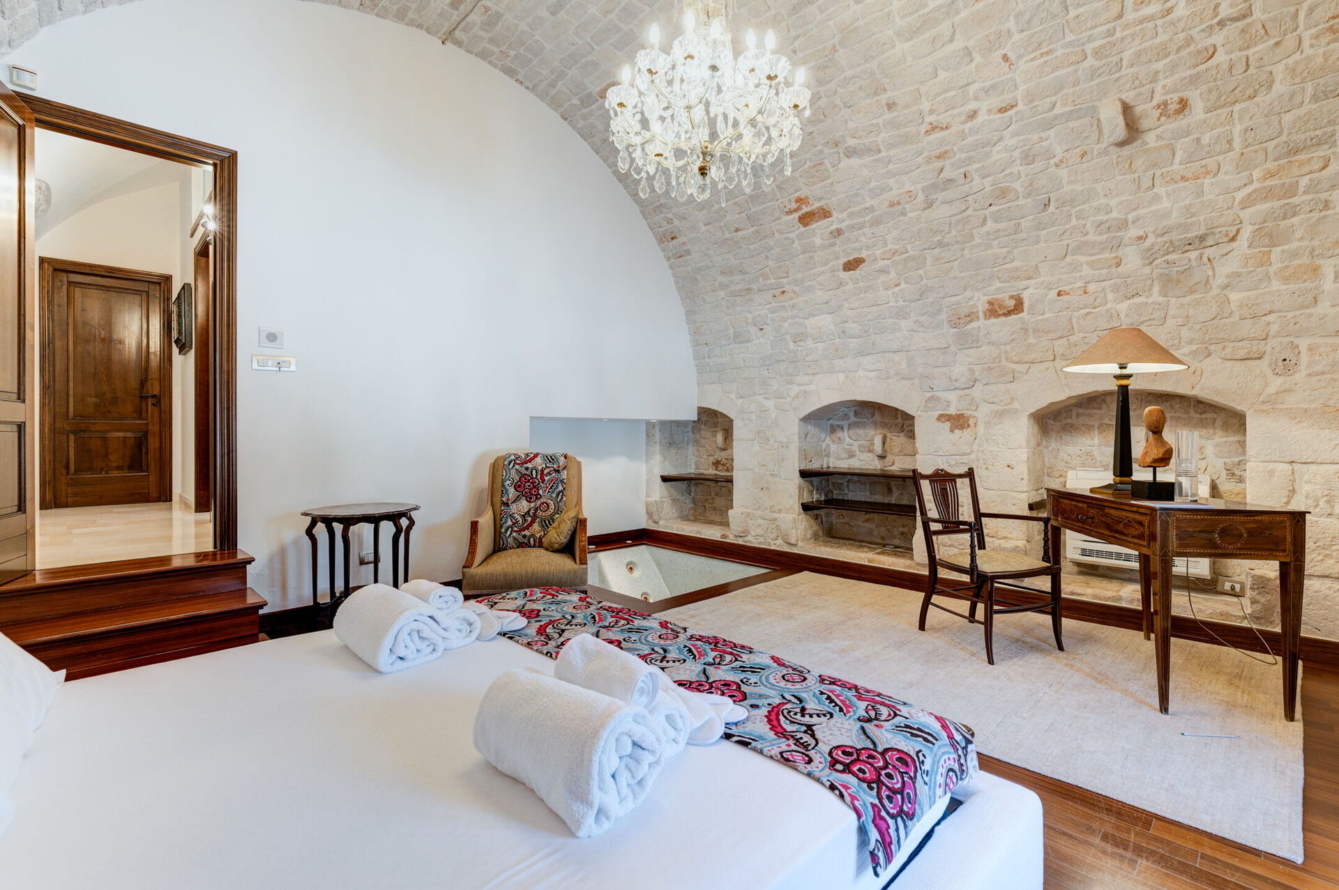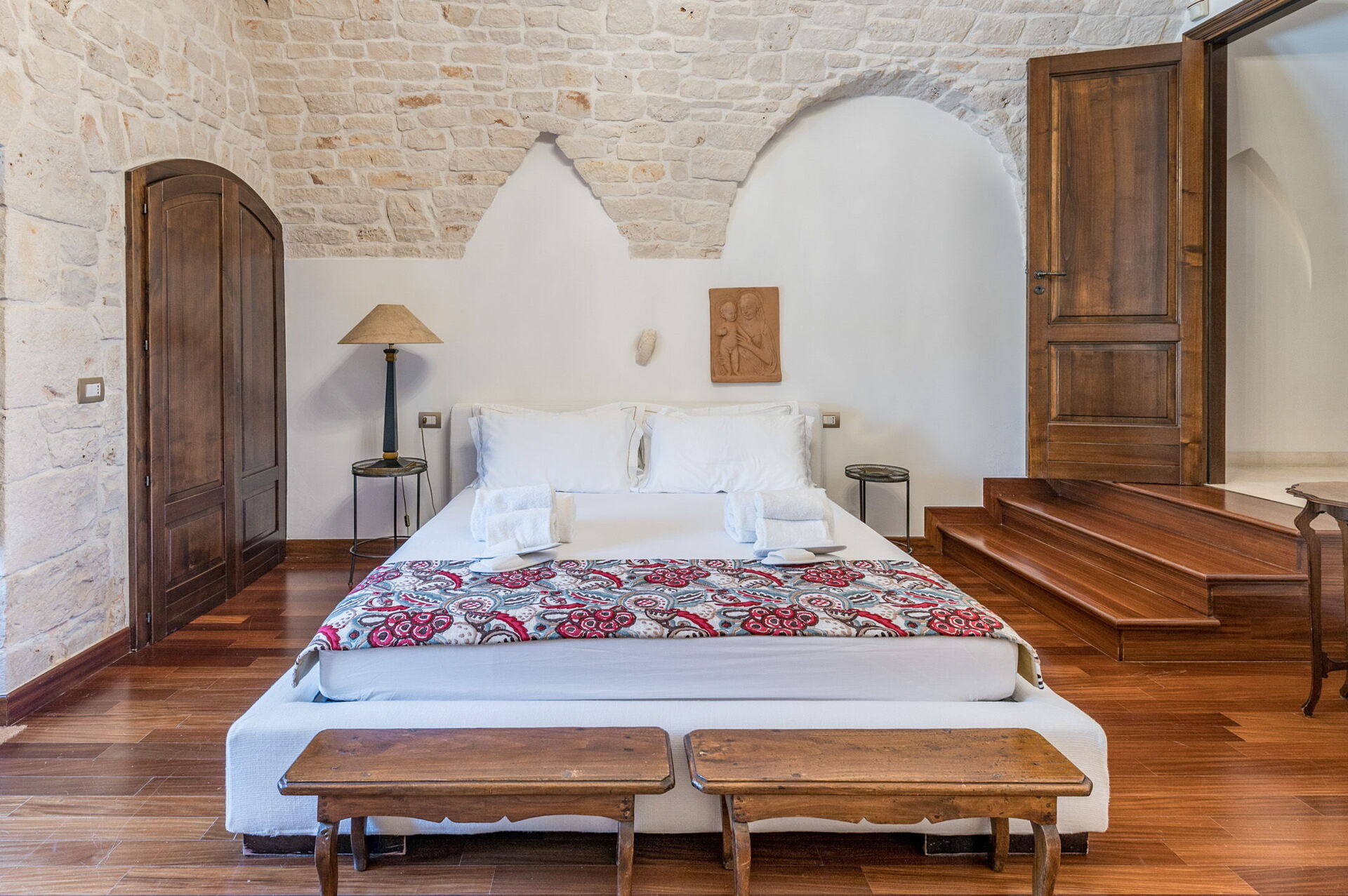 Masseria Della Croce is an historic masseria for rent with swimming pool located in Putignano (Puglia). Up to 8 sleeps in 4 bedrooms, one with hydromassage bathtub.