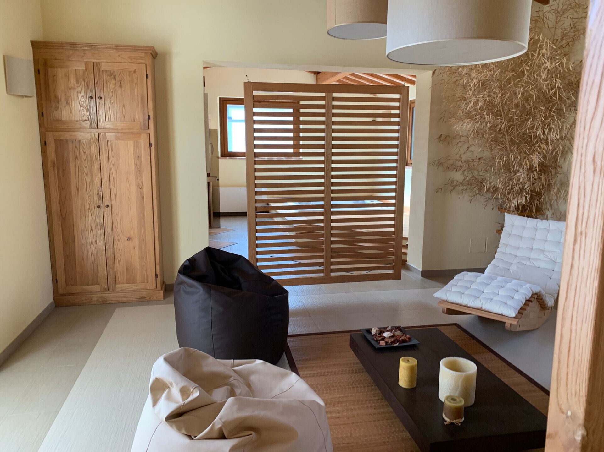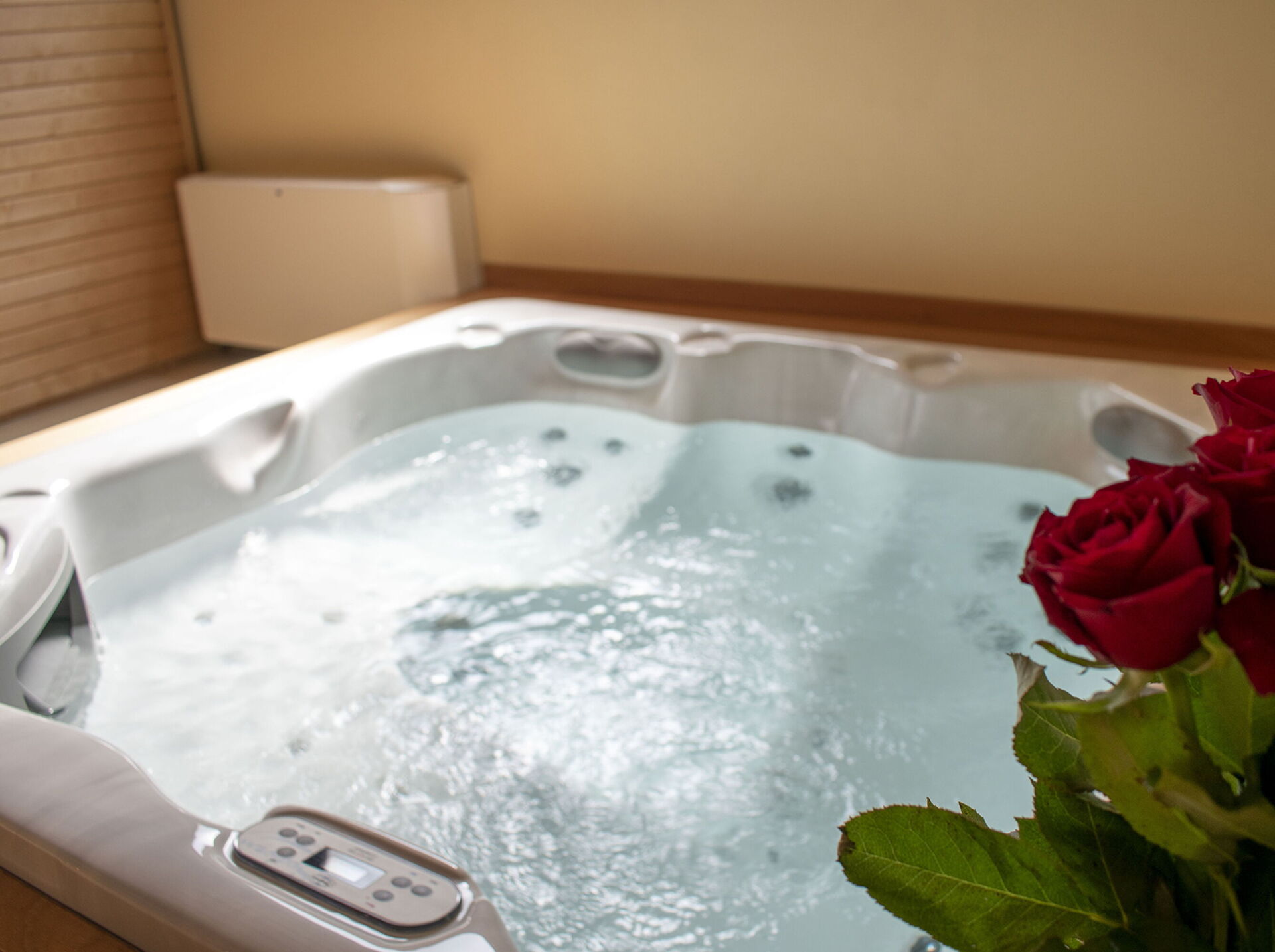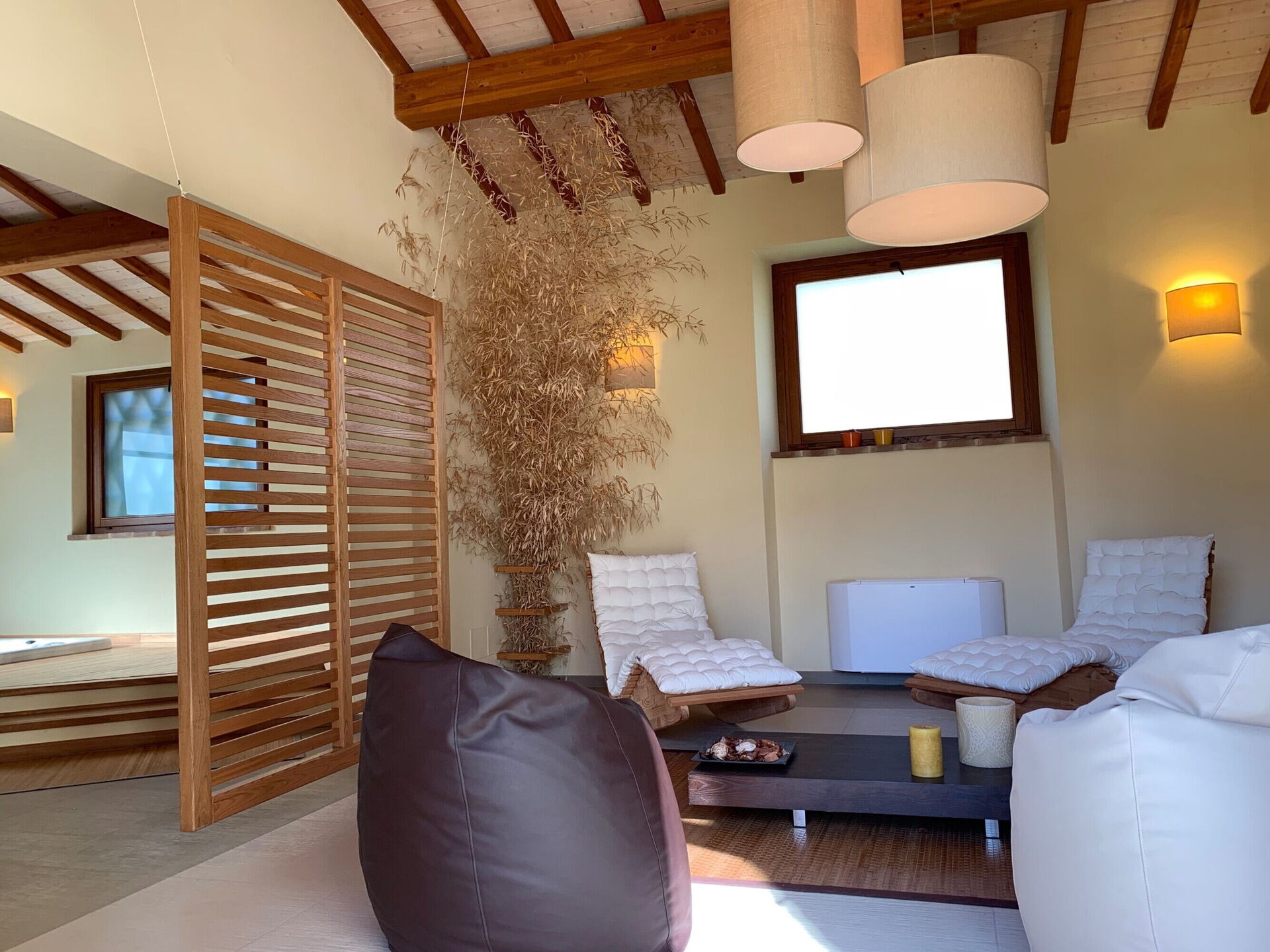 espace bien-être: bain à remous couvert, douche, sauna.