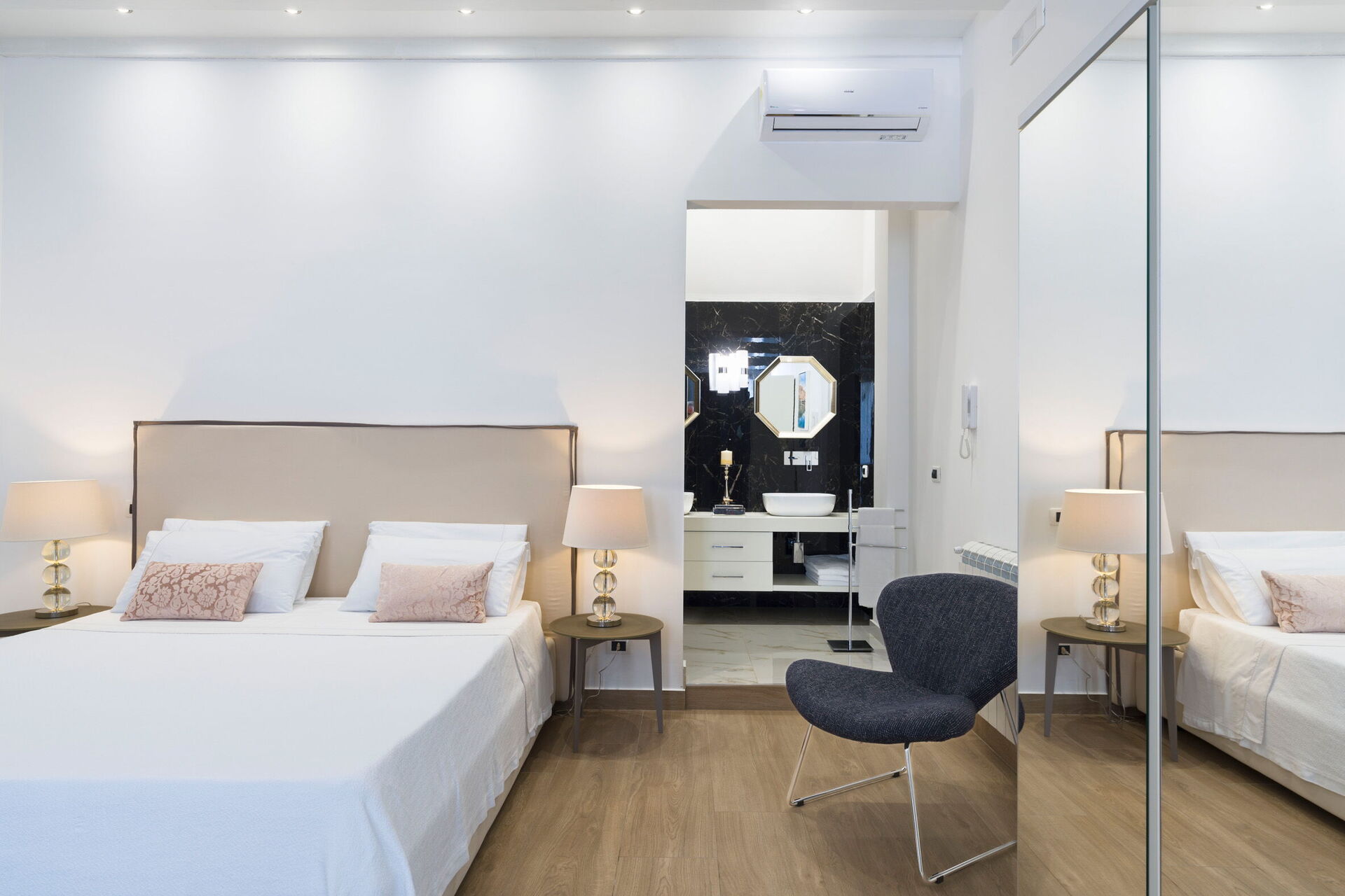 chambre avec salle de bain: lit double, internet WIFI, internet, climatisation, bassin, wc, bidet, douche, détecteur de fumée, détecteur de co2, sortie sur le jardin.