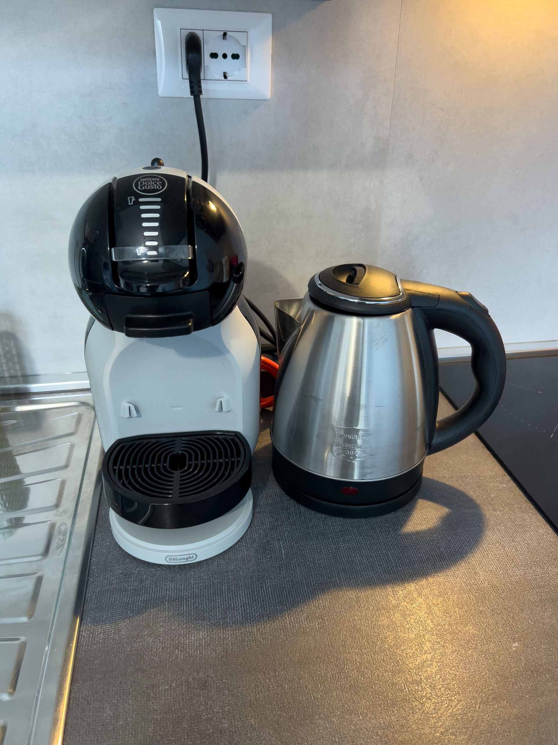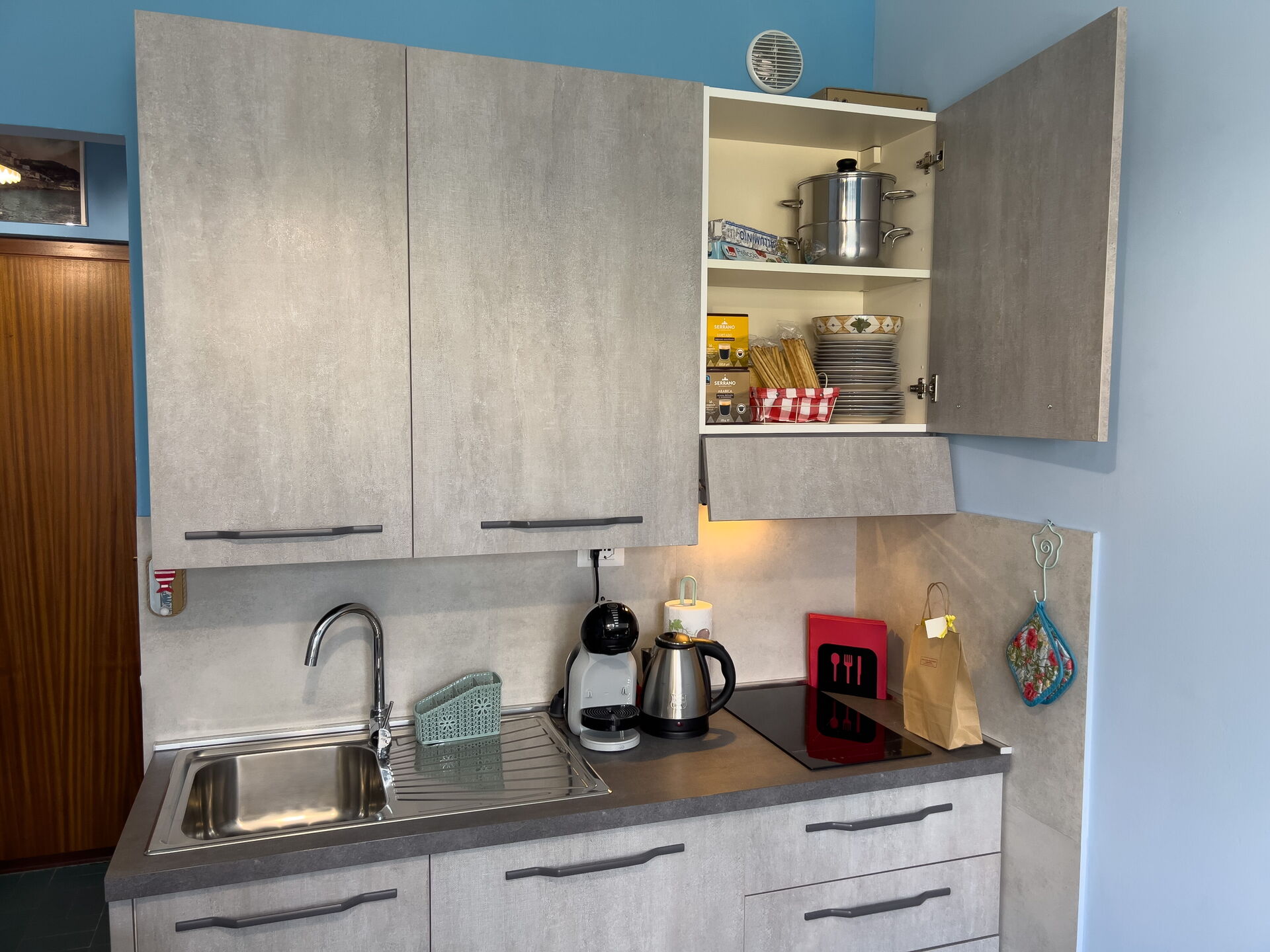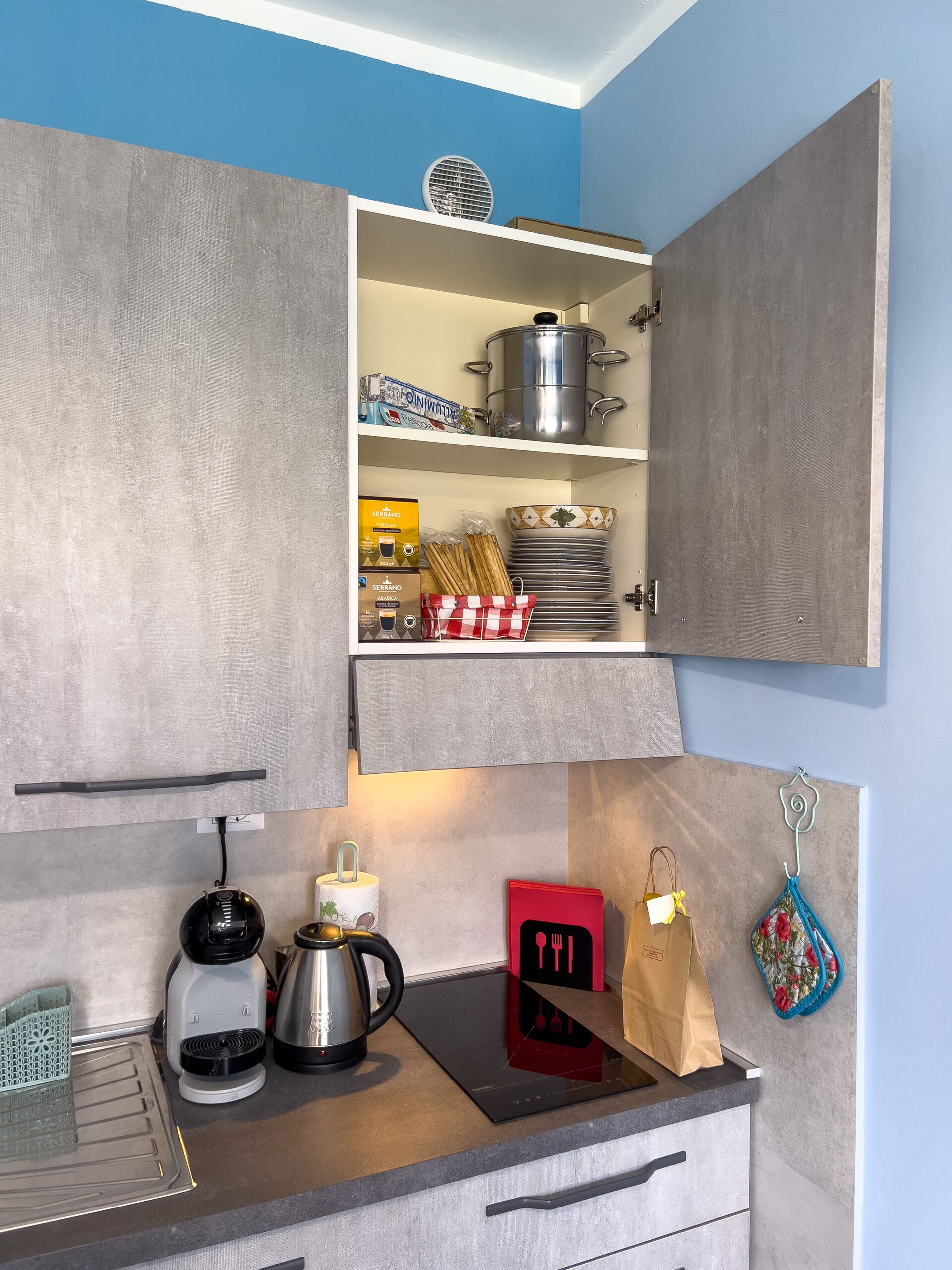 Kitchenette équipée, avec plaque à induction (deux feux), évier, lave-linge. Machine à café Dolce Gusto Nescafé. Grille-pain, bouilloire. Micro-ondes avec fonction grill.