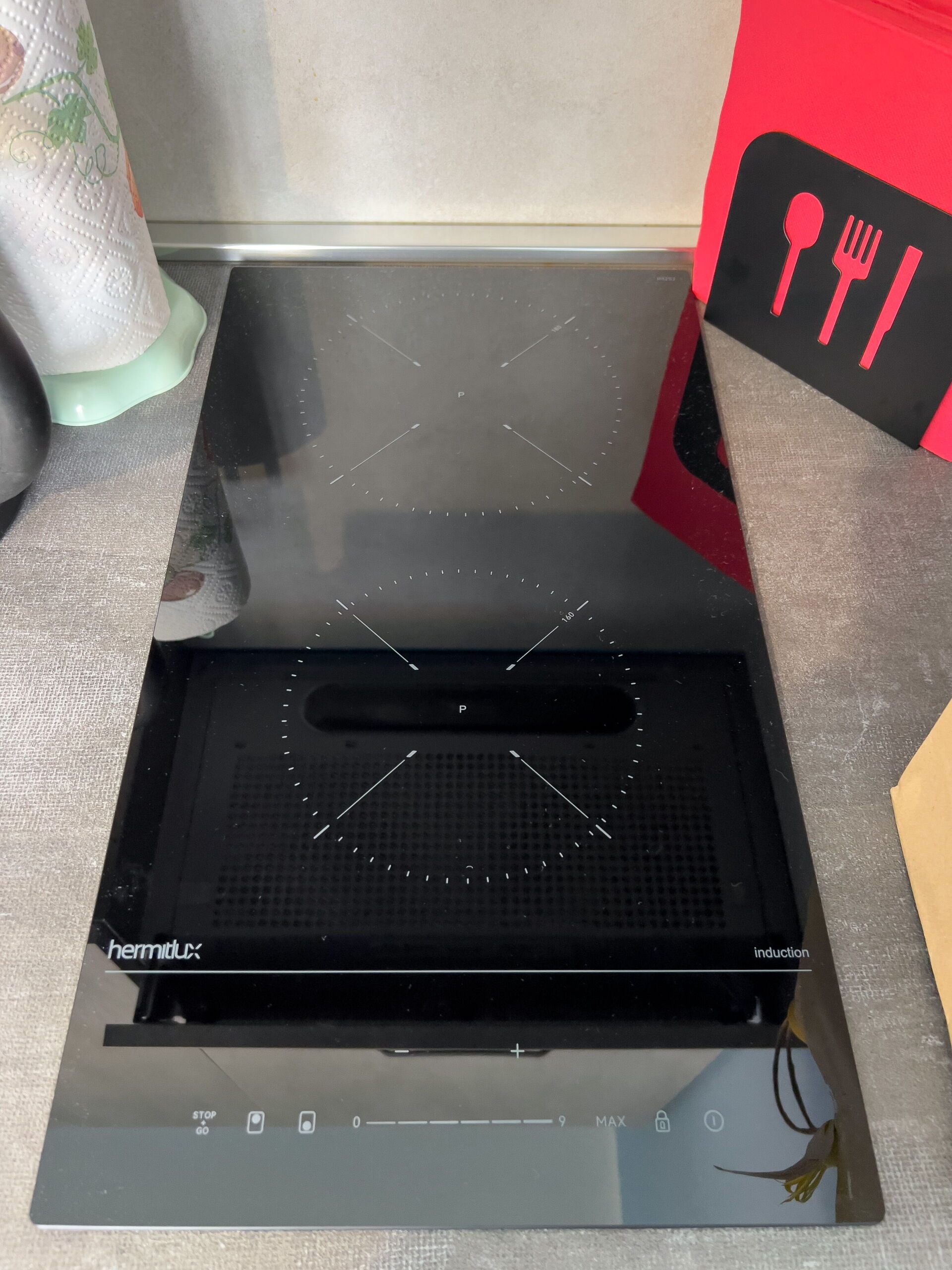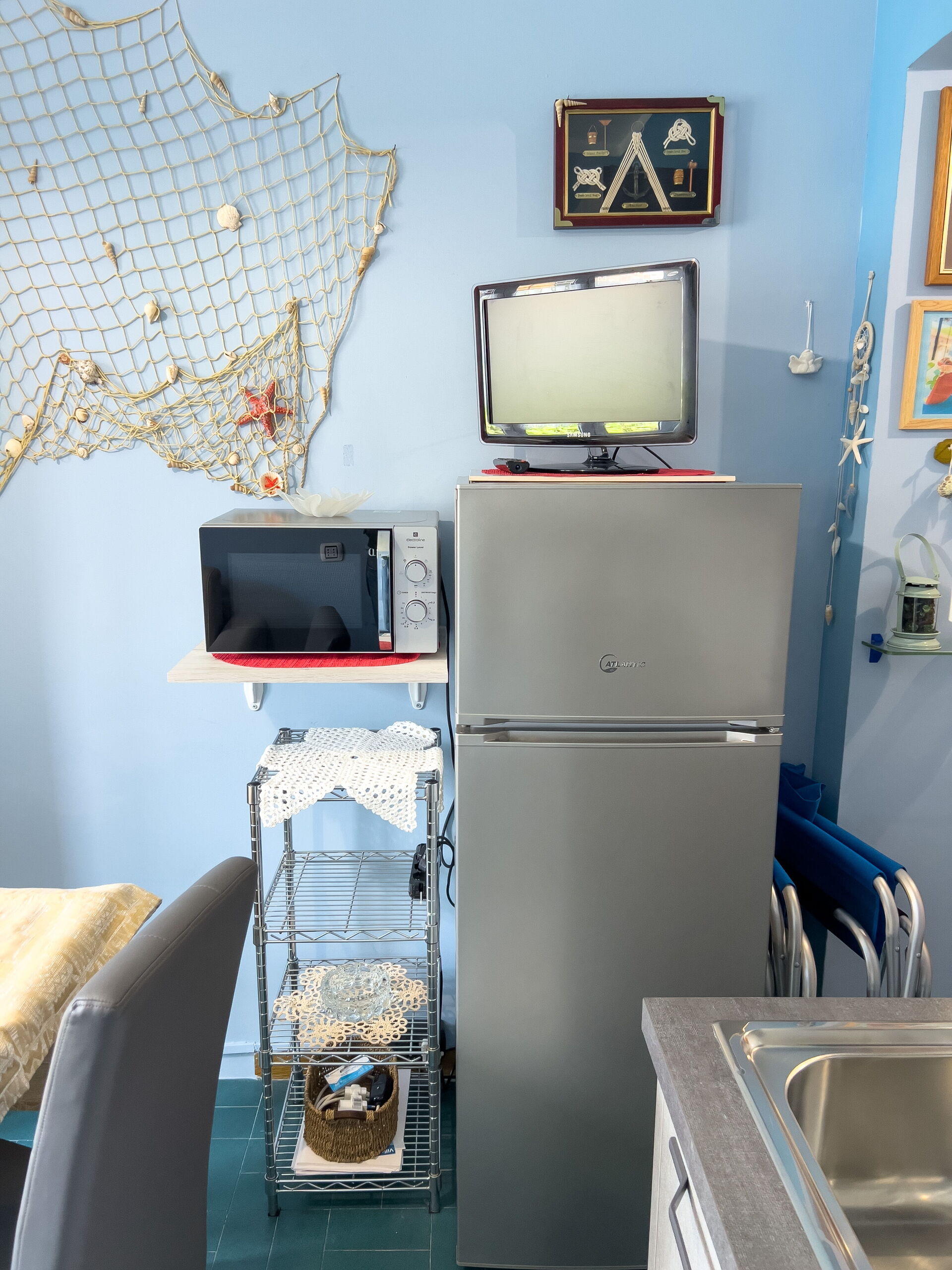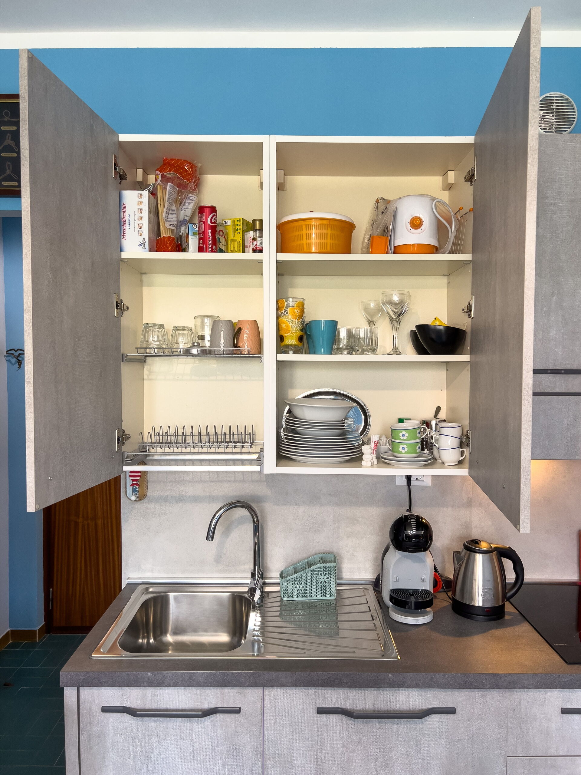 Kitchenette équipée, avec plaque à induction (deux feux), évier, lave-linge. Machine à café Dolce Gusto Nescafé. Grille-pain, bouilloire. Micro-ondes avec fonction grill.
