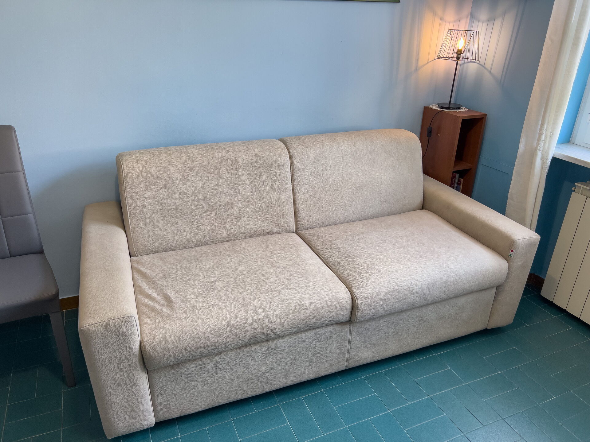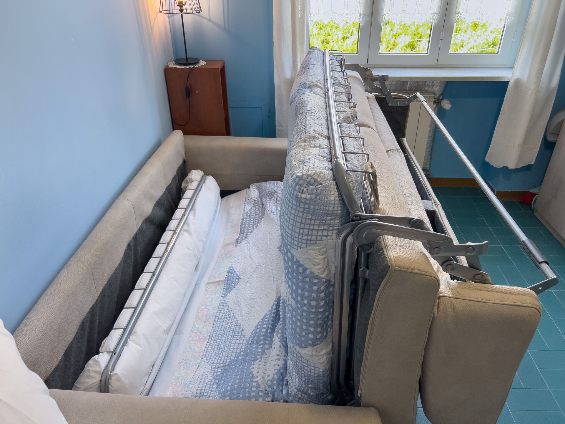 Le canapé devient un lit double : une fois ouvert, l'espace de vie diminue considérablement, mais le lit peut être ouvert et fermé confortablement, à volonté, pour gérer l'espace.