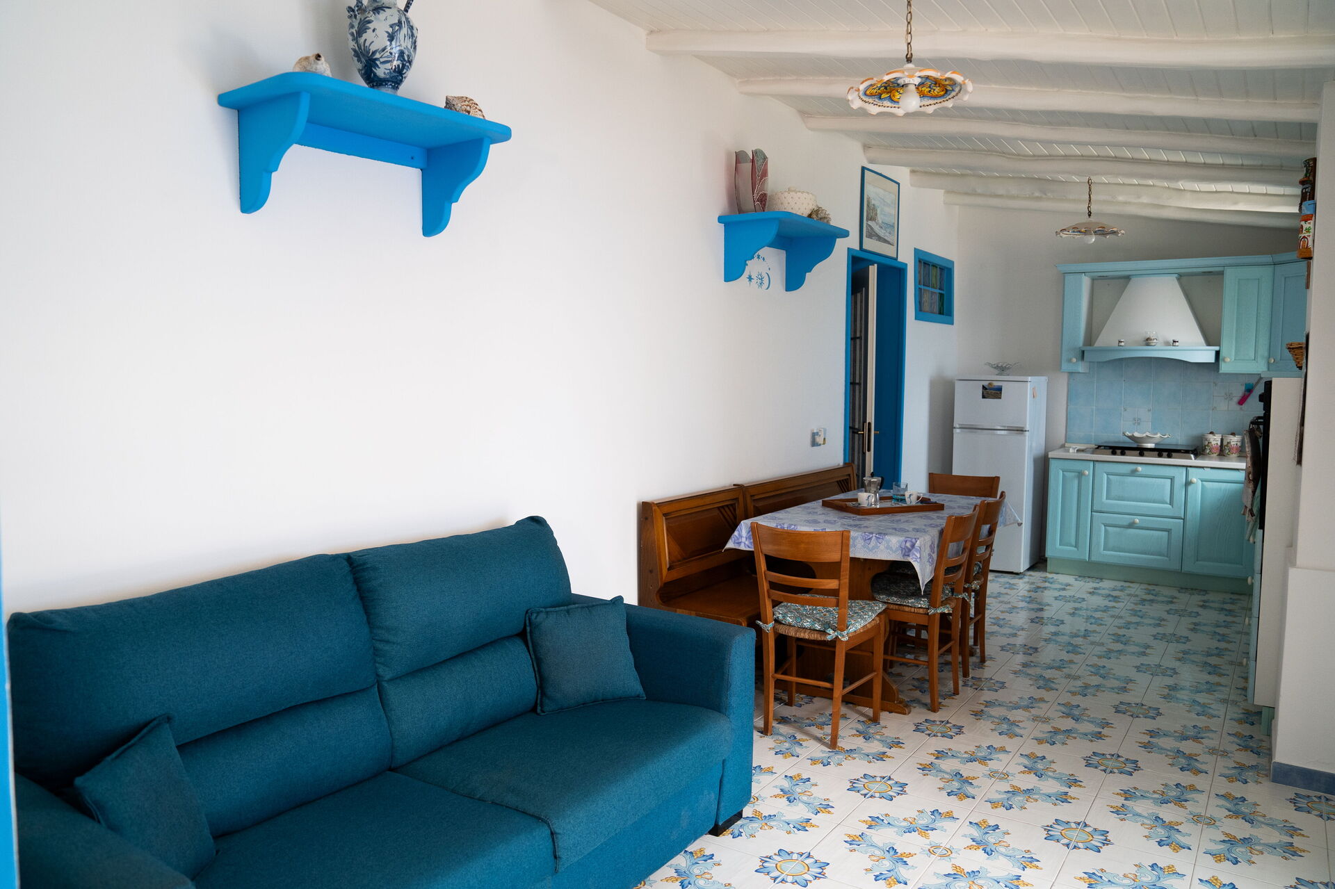 Cuisine – salle de séjour: cuisine bien équipée, table à manger, réfrigérateur, congélateur, four micro-onde, cuisinière, grille-pain, fer à repasser, machine à café italienne, canapé, internet WIFI, climatisation, chaise-haute, tv satellitaire, sortie sur la terrasse.
