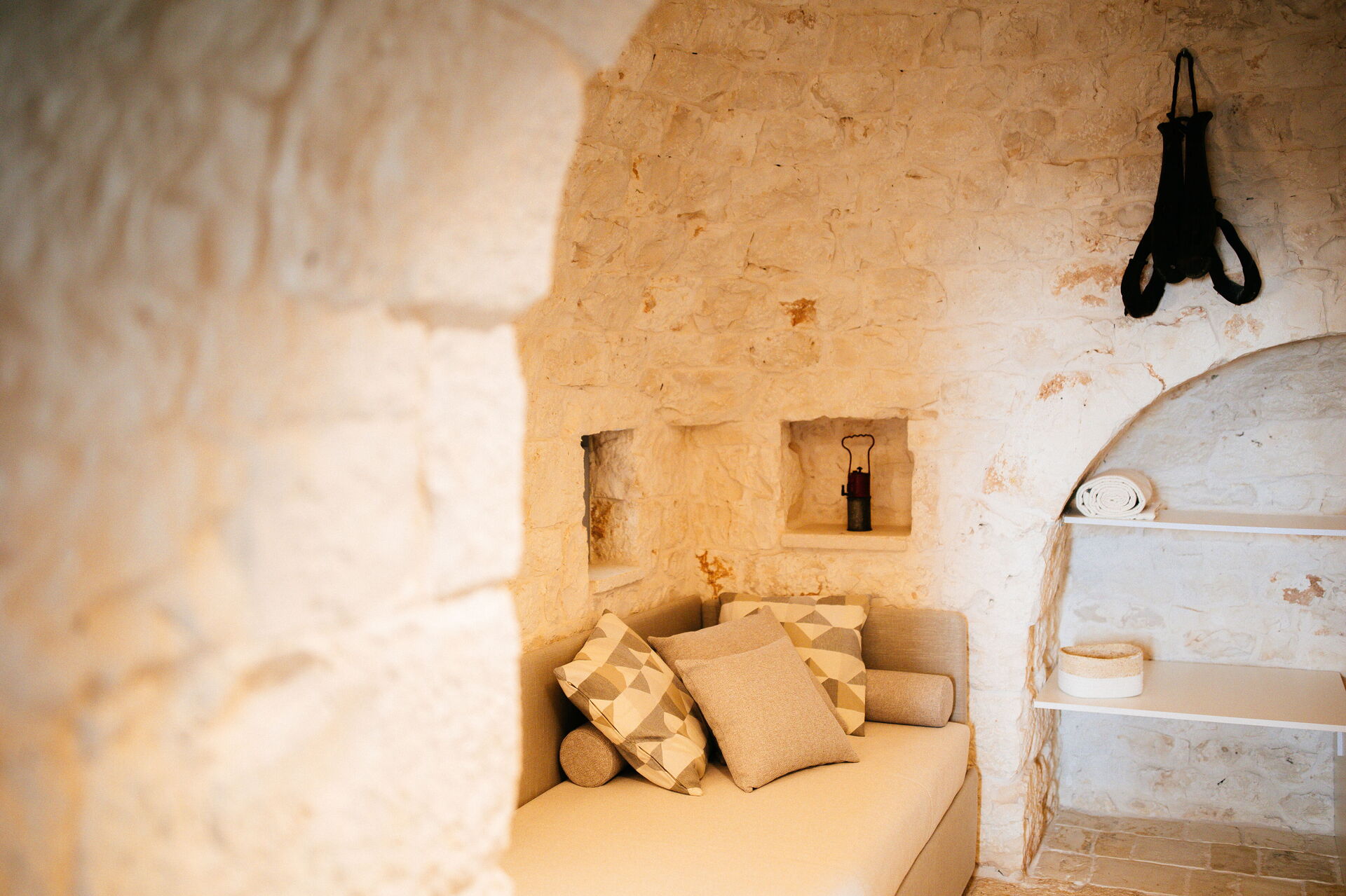 The oldest body of approximately 60 square meters is made up of four rooms: a lamia used as a living area, furnished with a dining table, sofa, TV and stone fireplace, mezzanine with kingsize double bed measuring 180 x 200 cm and memory foam mattress with pillows of different heights, as well as a single bed; a trullo with a 160 x 200 cm sofa bed and cellar fridge; a kitchen furnished with fridge, oven, microwave oven, induction hob, dishwasher, Nespresso coffee machine, kettle, citrus juicer and toast plate, complete with pots and cooking accessories; a bathroom with shower and two-seater tub with hydromassage, for a total of 4 + 1 beds.