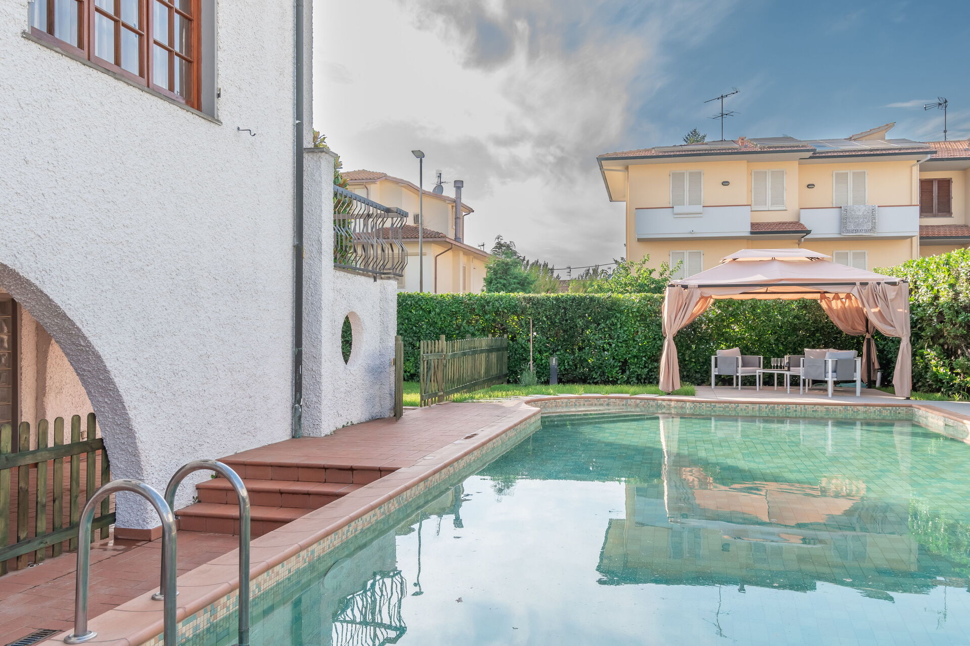 jardin: piscine (privé, largeur: 6m, longueur: 13m, profondeur: 1.5m, profondeur max.: 2m, profondeur min.: 1m), internet WIFI, espace extérieur pour les repas en plein air, table à manger, pavillon, meuble de jardin, chaise longue, clôturé /clôturée, propriété clôturée.