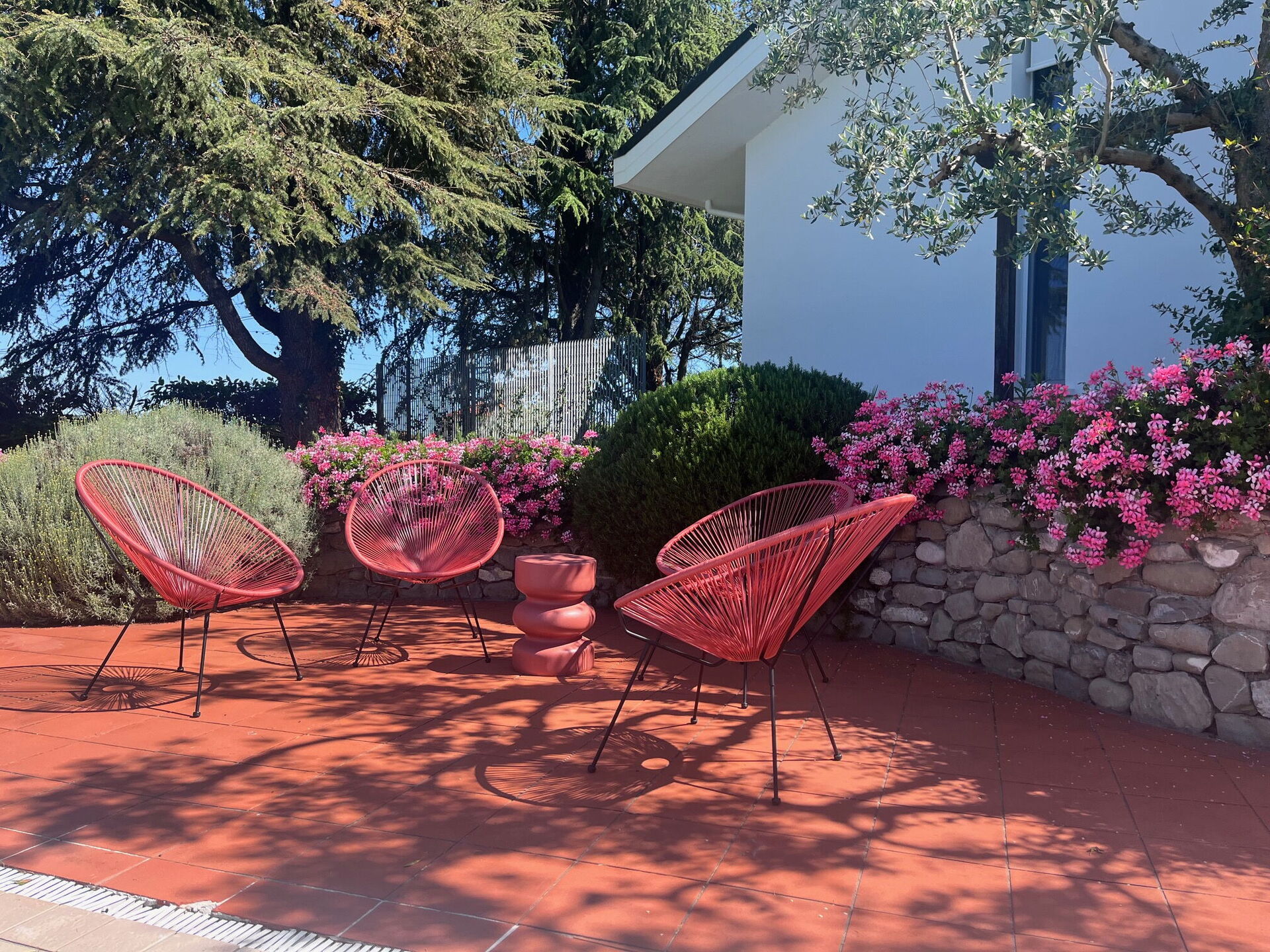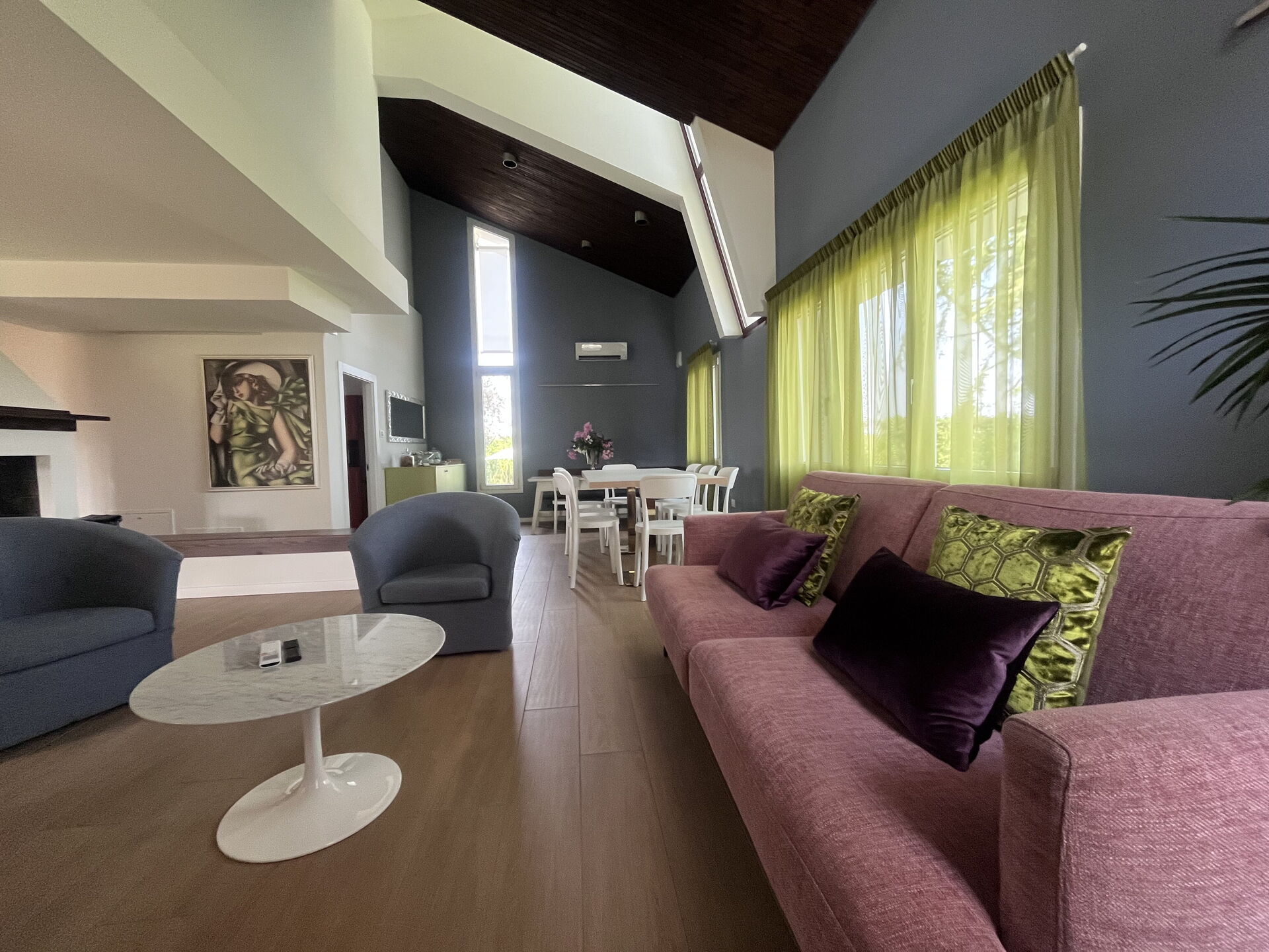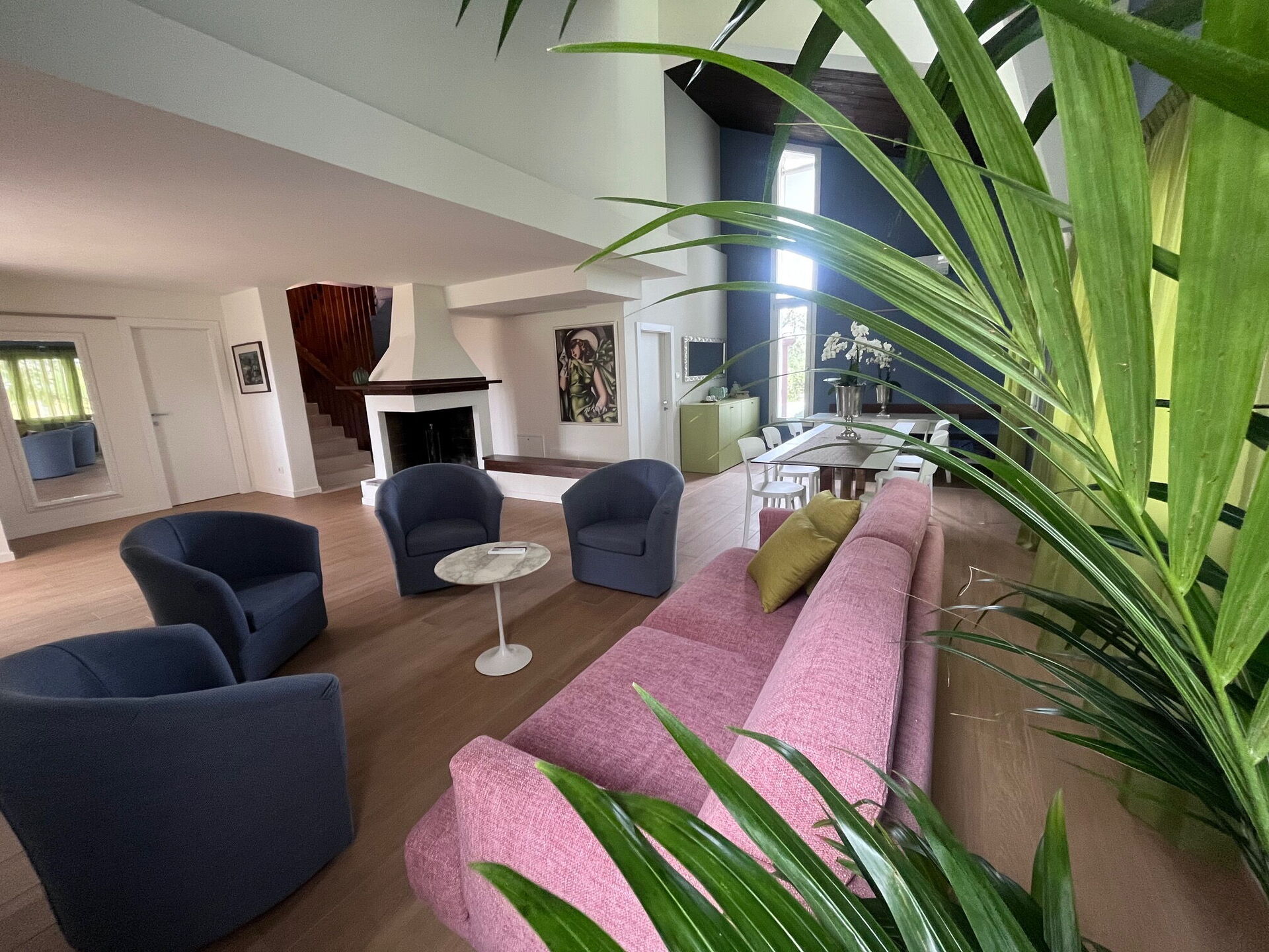 Salon (70 m2): canapé, quatre fauteuils, cheminée, deux tables à manger (personnes: 10), internet WIFI, climatisation, tv satellitaire, moustiquaires, sortie sur le jardin, sortie sur la véranda.