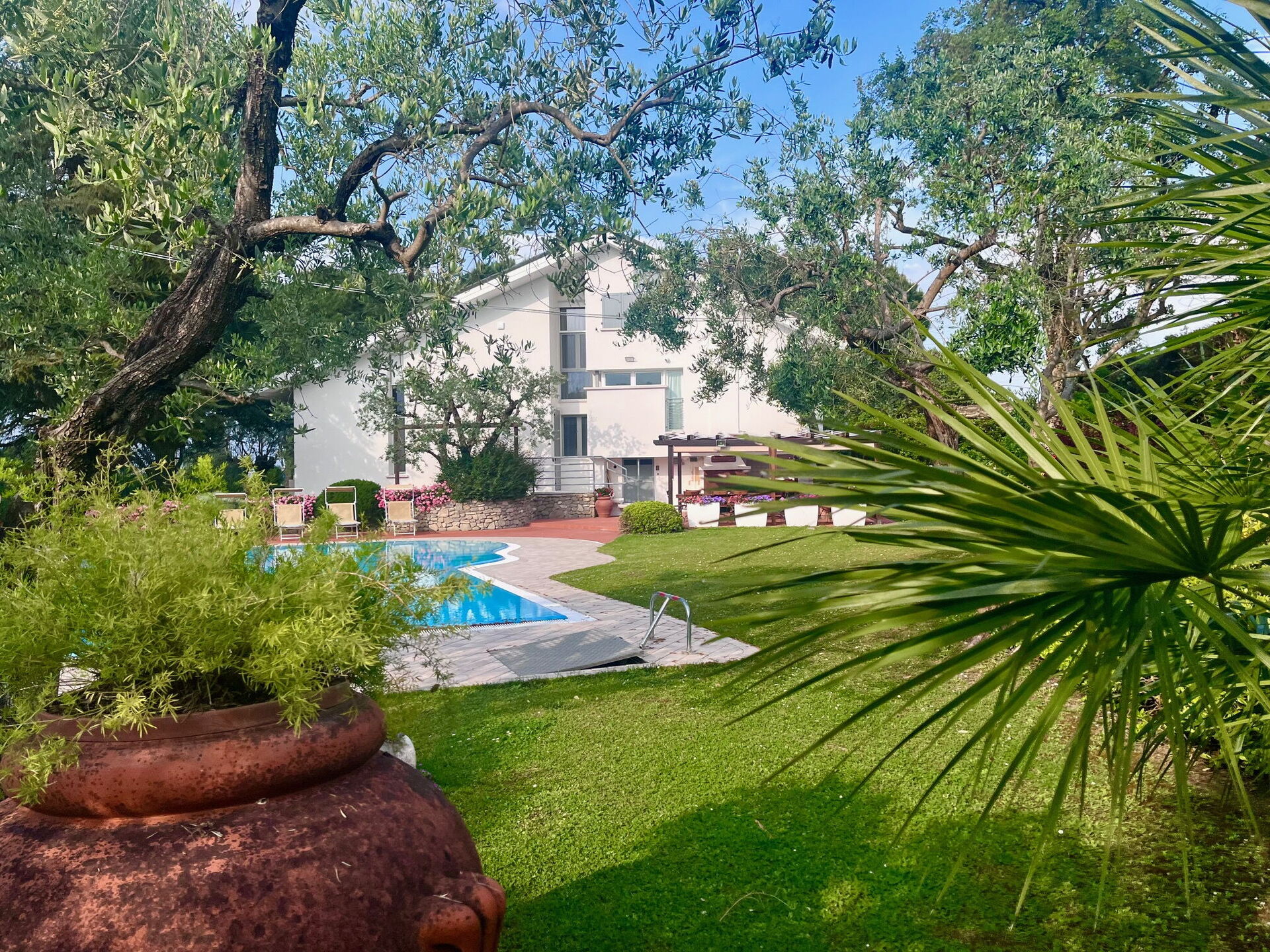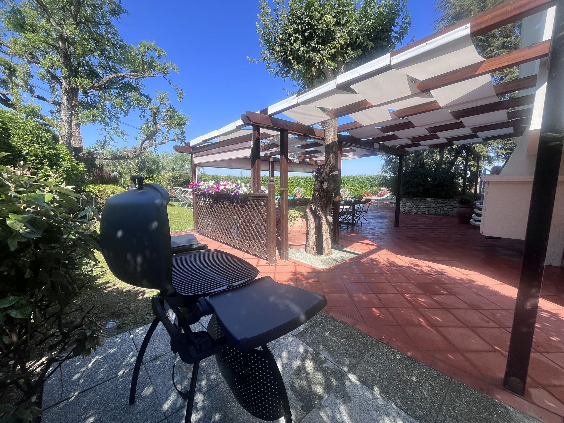jardin: piscine, douche, barbecue, espace extérieur pour les repas en plein air, table à manger, meuble de jardin, chaise longue, clôturé /clôturée.