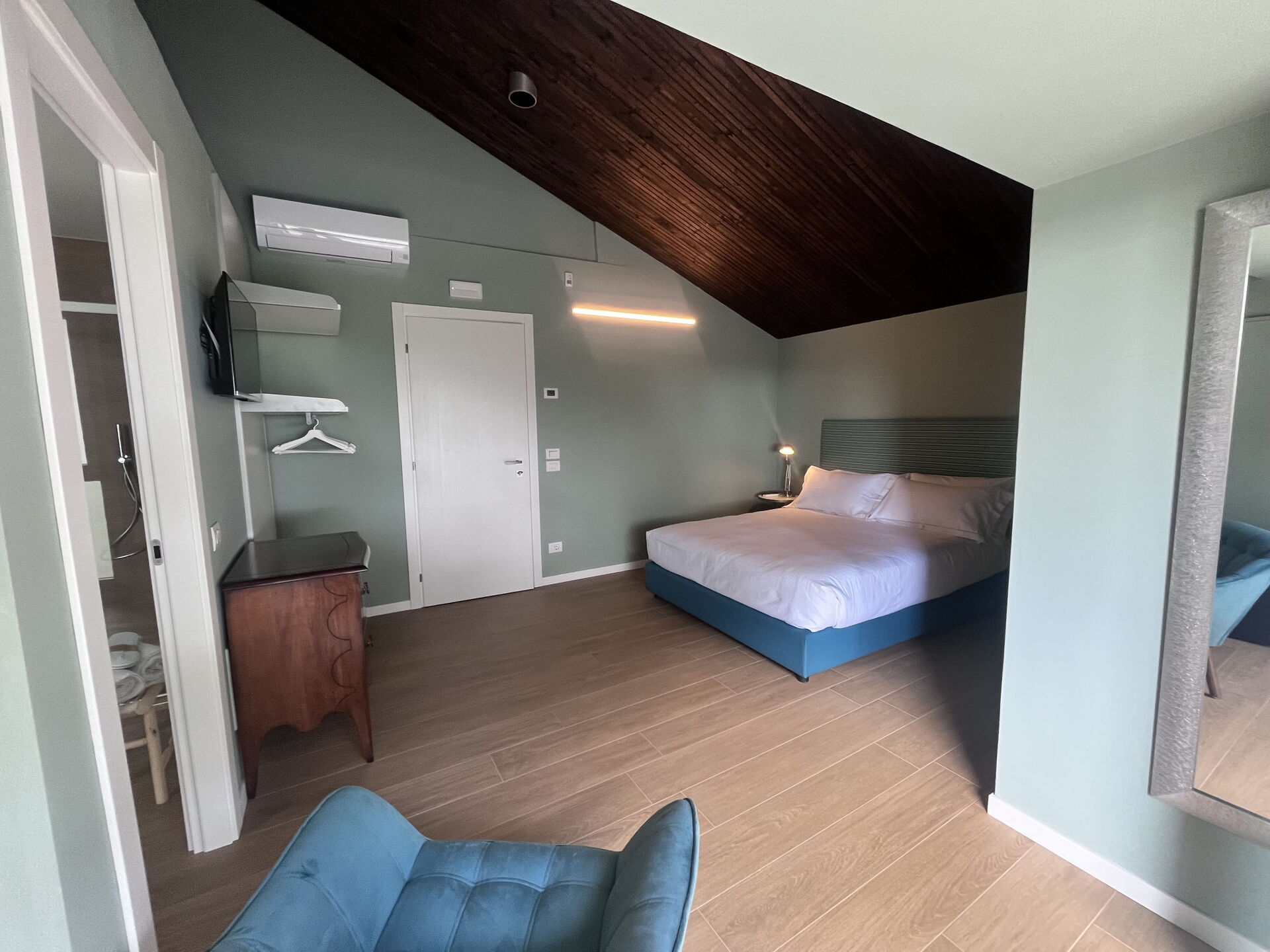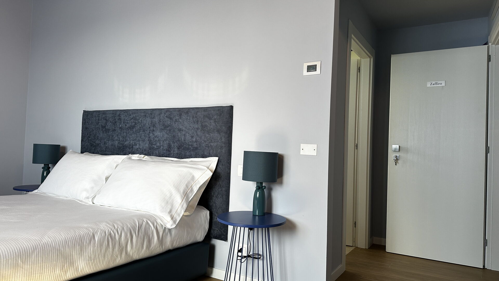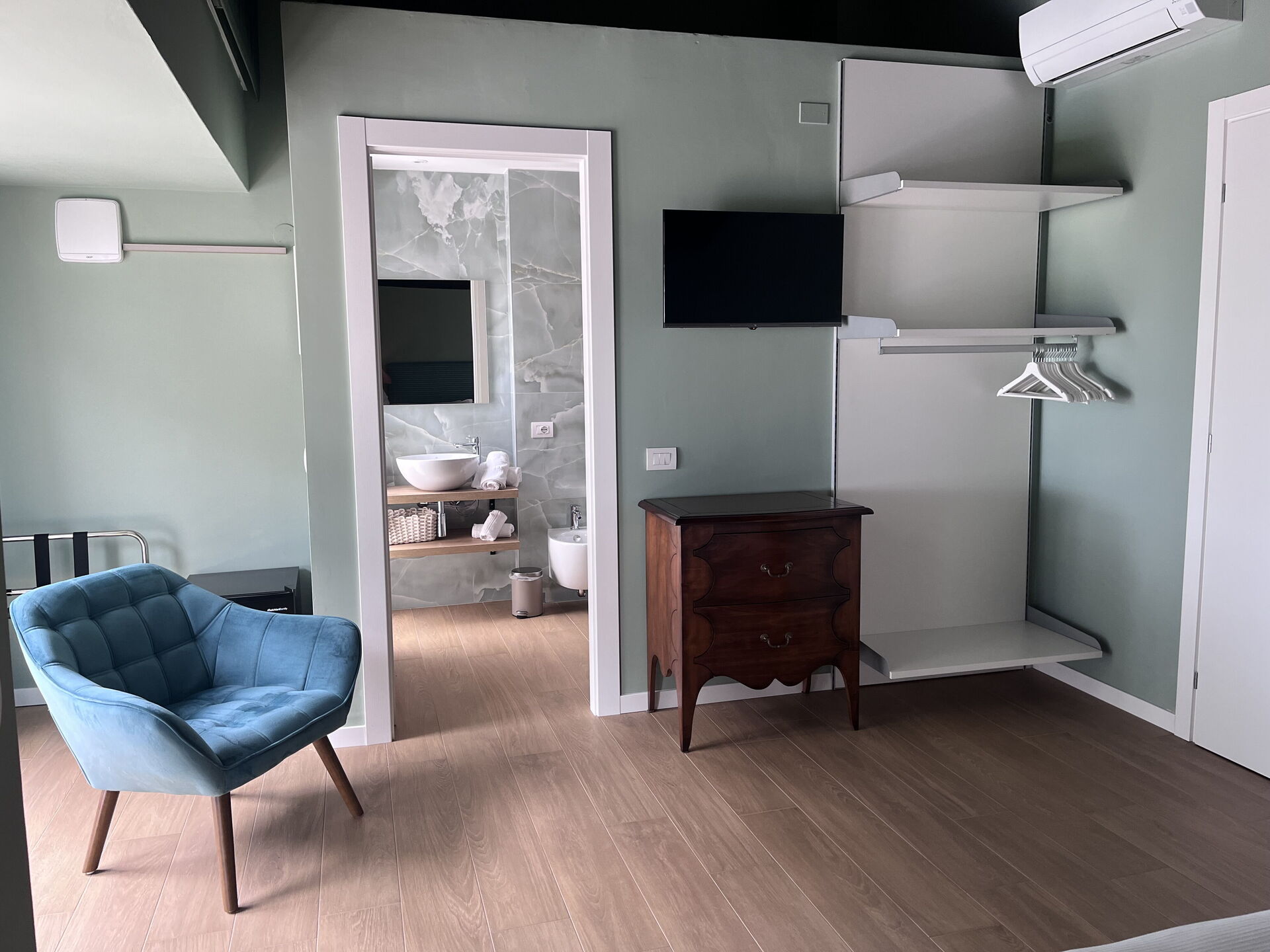 chambre avec salle de bain 2 (20 m2): lit double (largeur: 160m, longueur: 200m), internet WIFI, climatisation, moustiquaires, tv satellitaire, fauteuil, réfrigérateur, bassin, wc, bidet, sèche-cheveux, sortie sur le balcon.