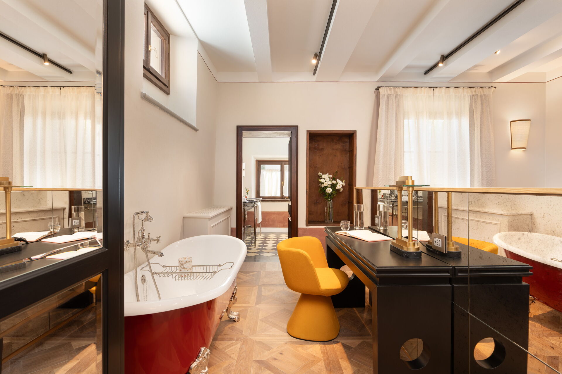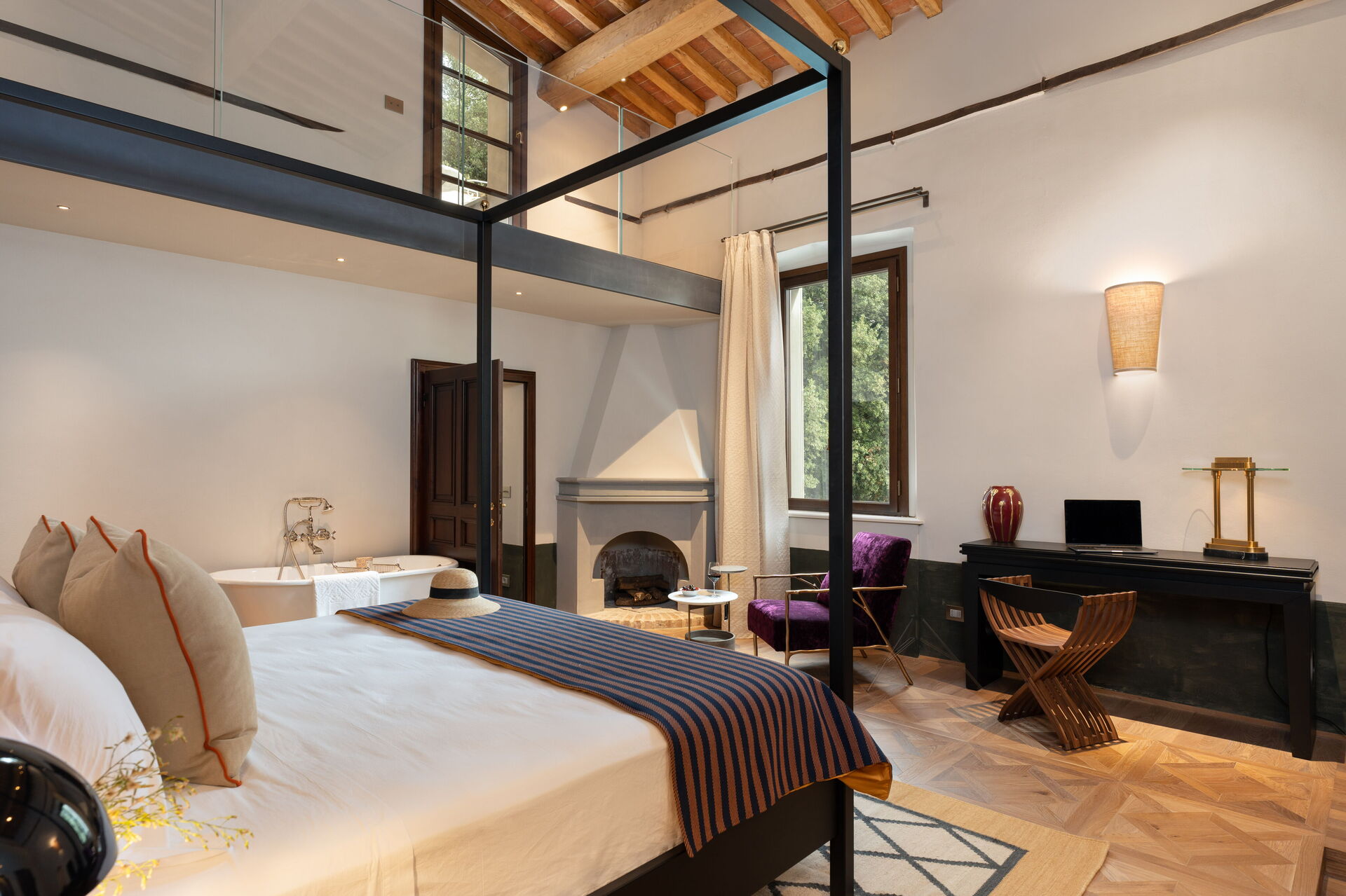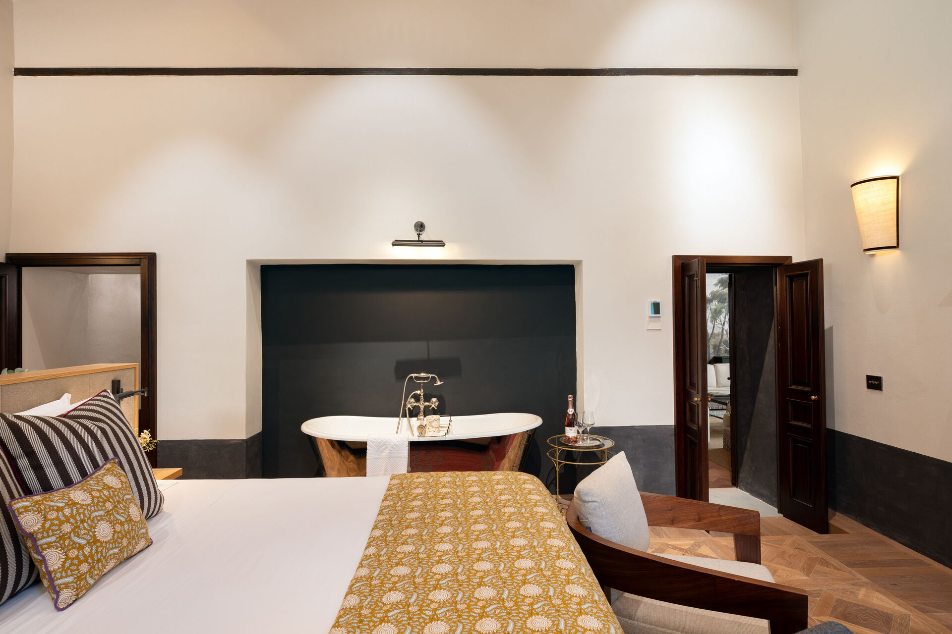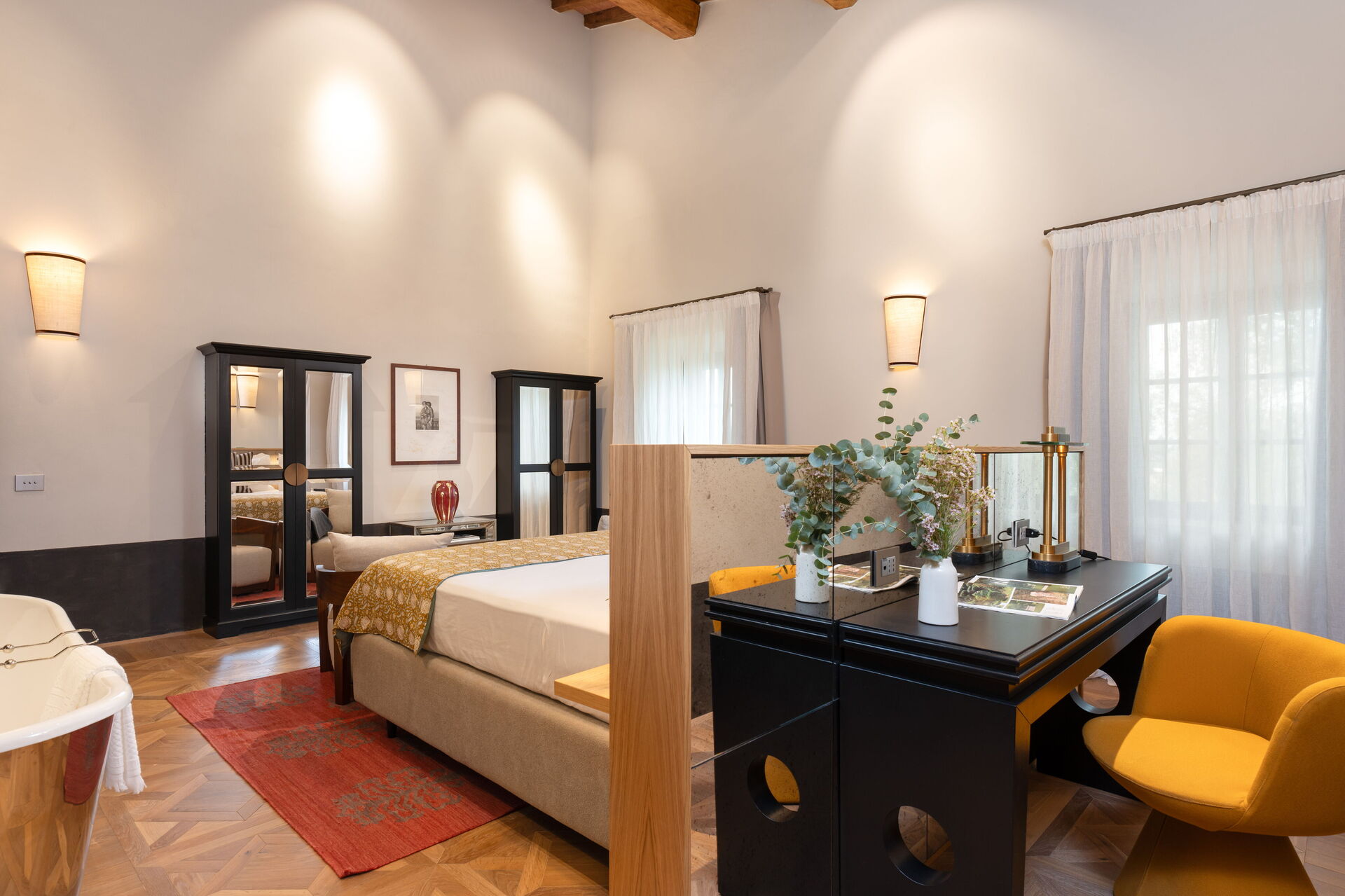chambre avec salle de bain 1: grand lit à deux places (largeur: 180m, longueur: 200m), internet WIFI, climatisation, bassin, wc, bidet, bagnoire, douche, sèche-cheveux, sortie sur la terrasse, galerie.
