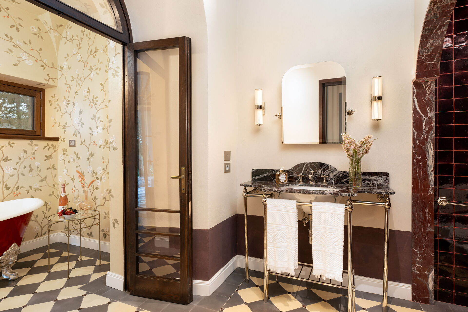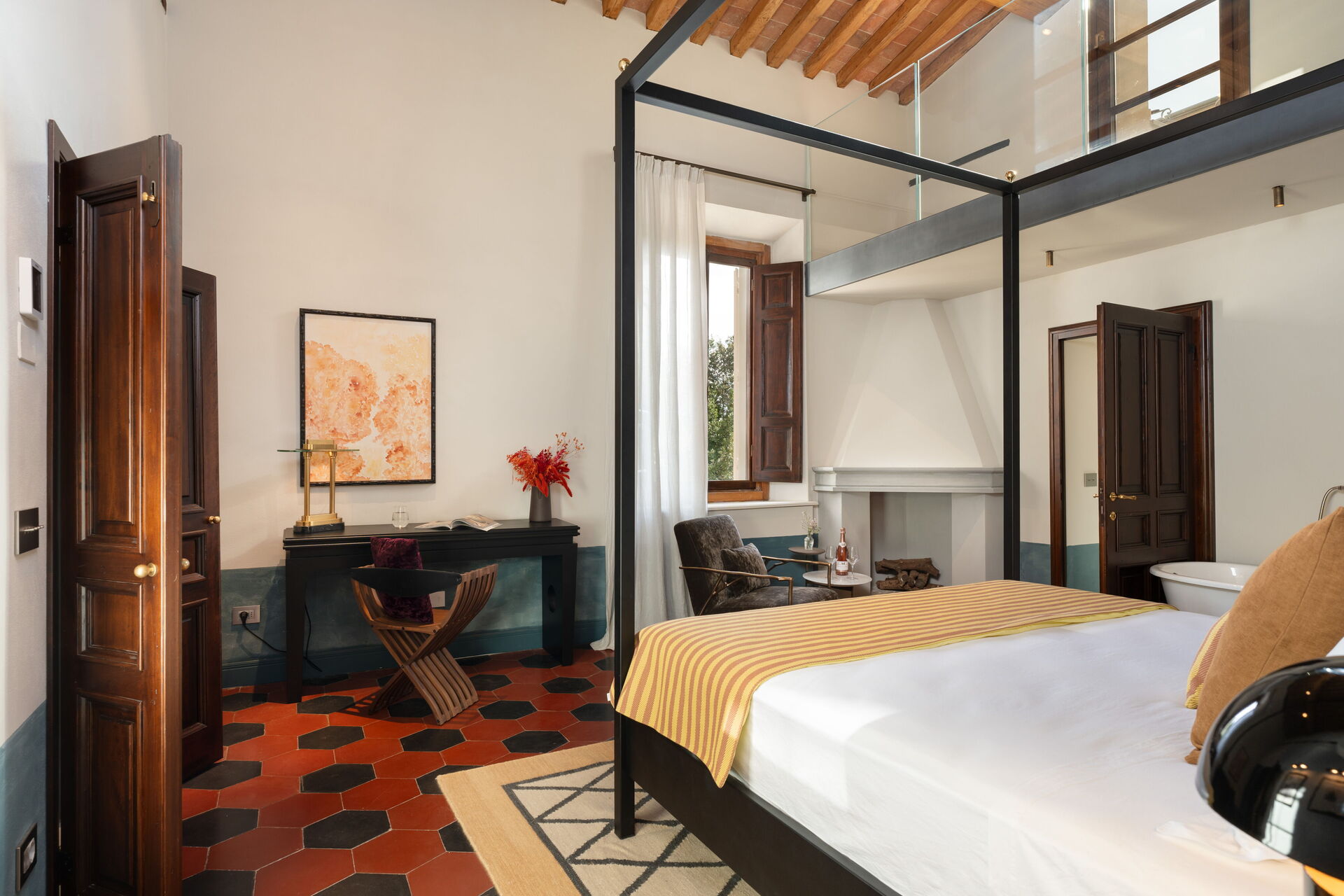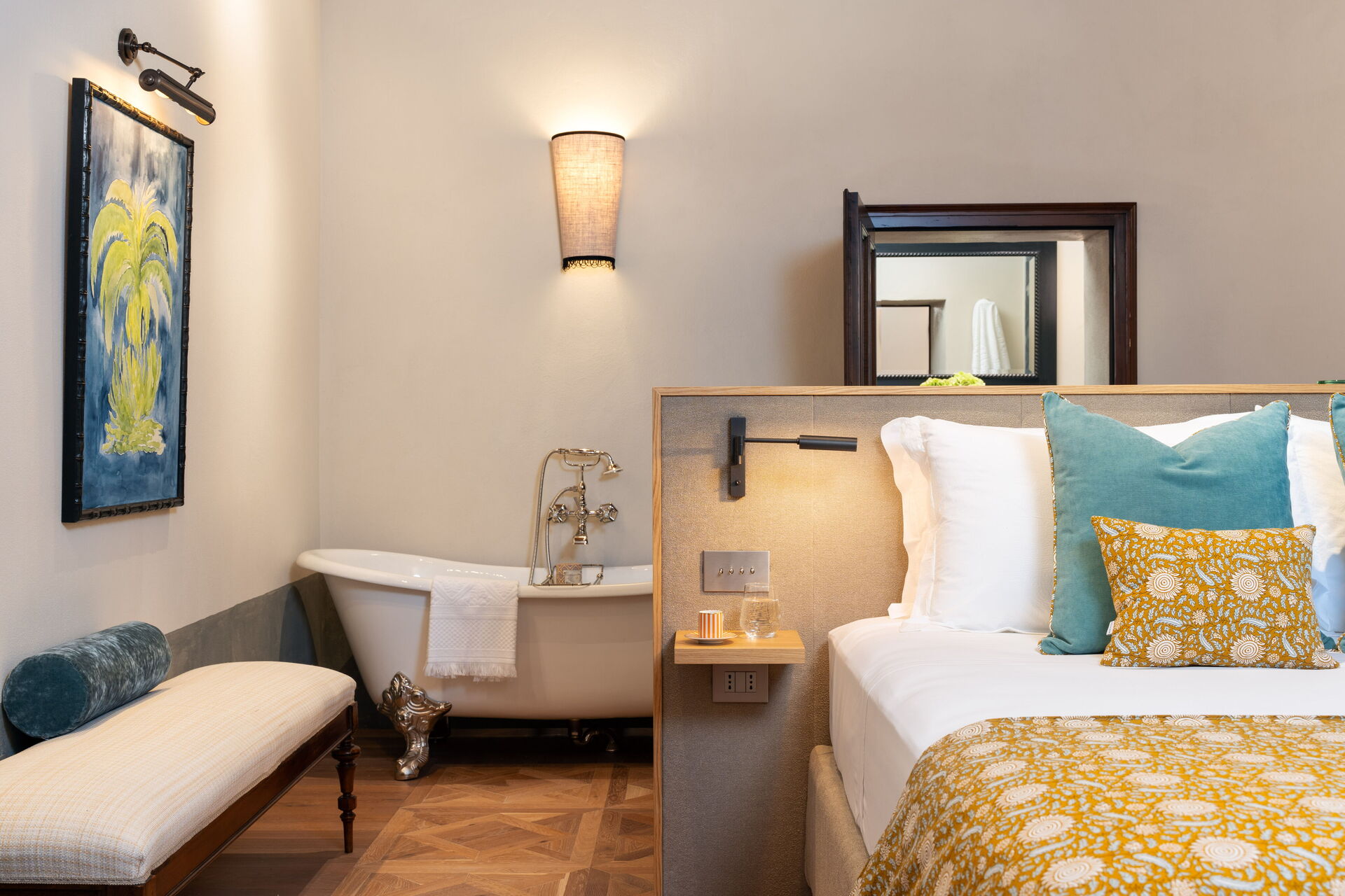 chambre avec salle de bain 1: grand lit à deux places (largeur: 180m, longueur: 200m), internet WIFI, climatisation, bassin, wc, bidet, bagnoire, douche, sèche-cheveux, sortie sur la terrasse, galerie.