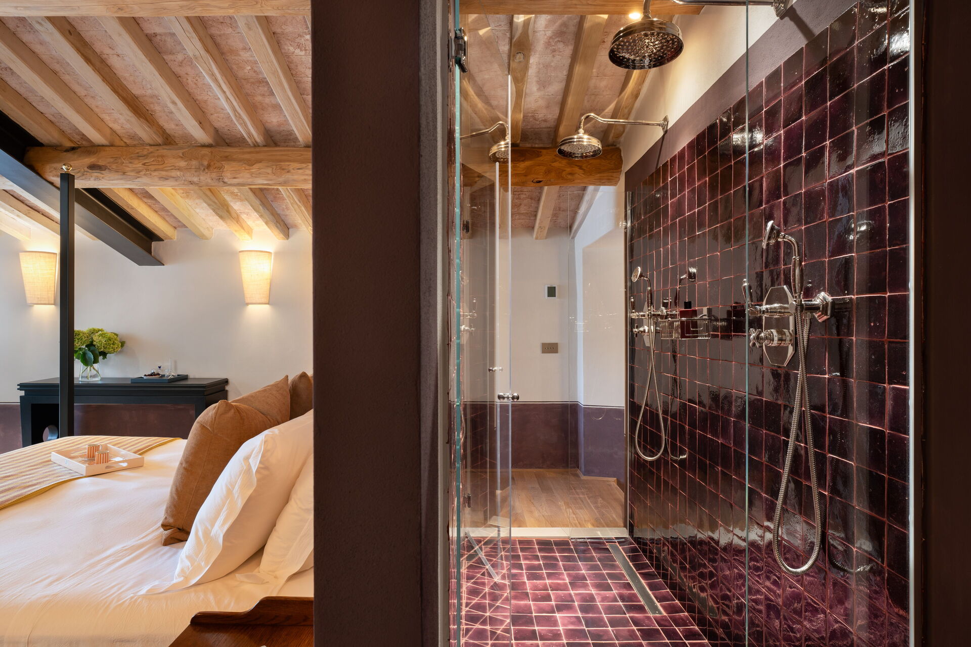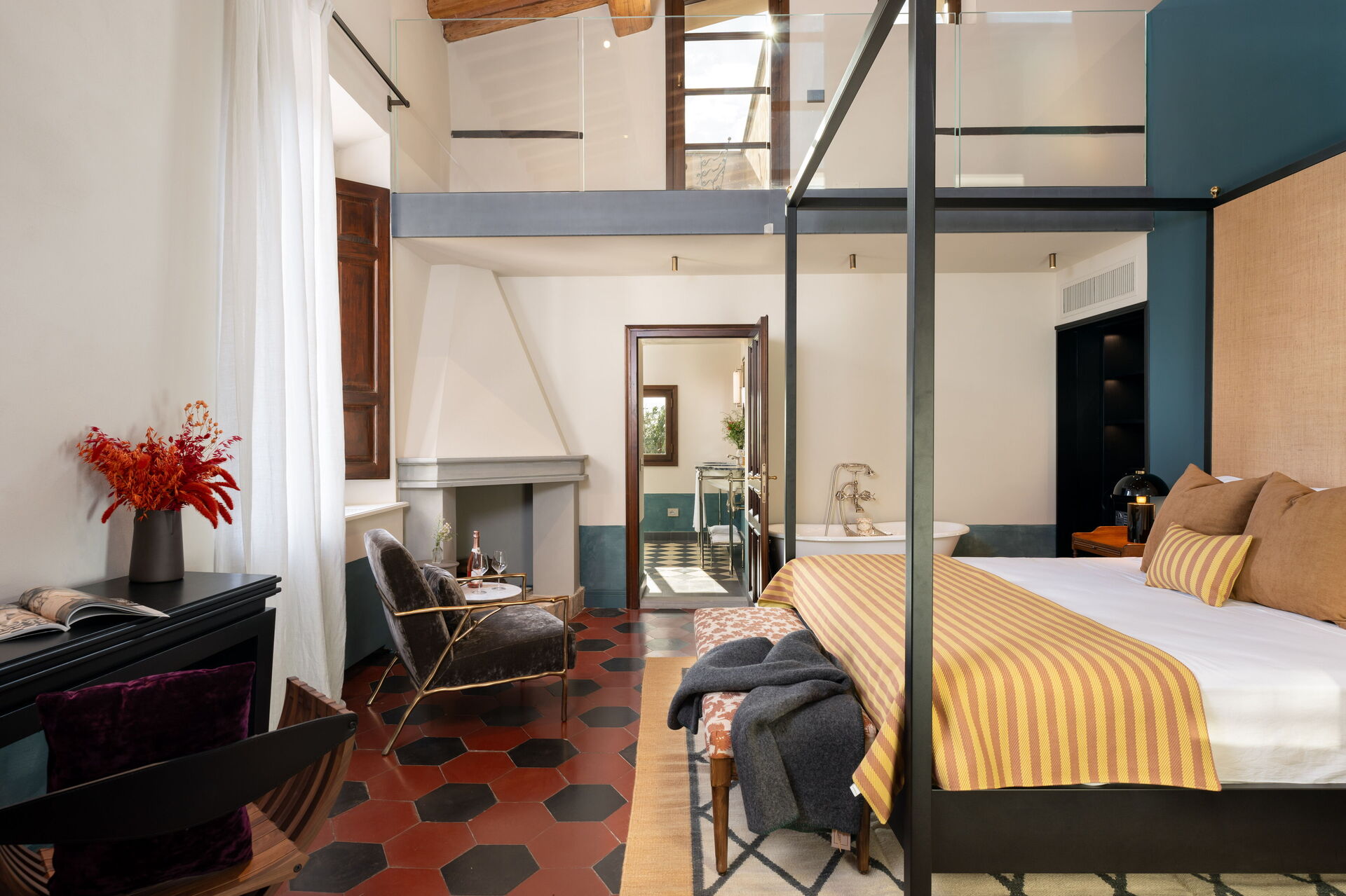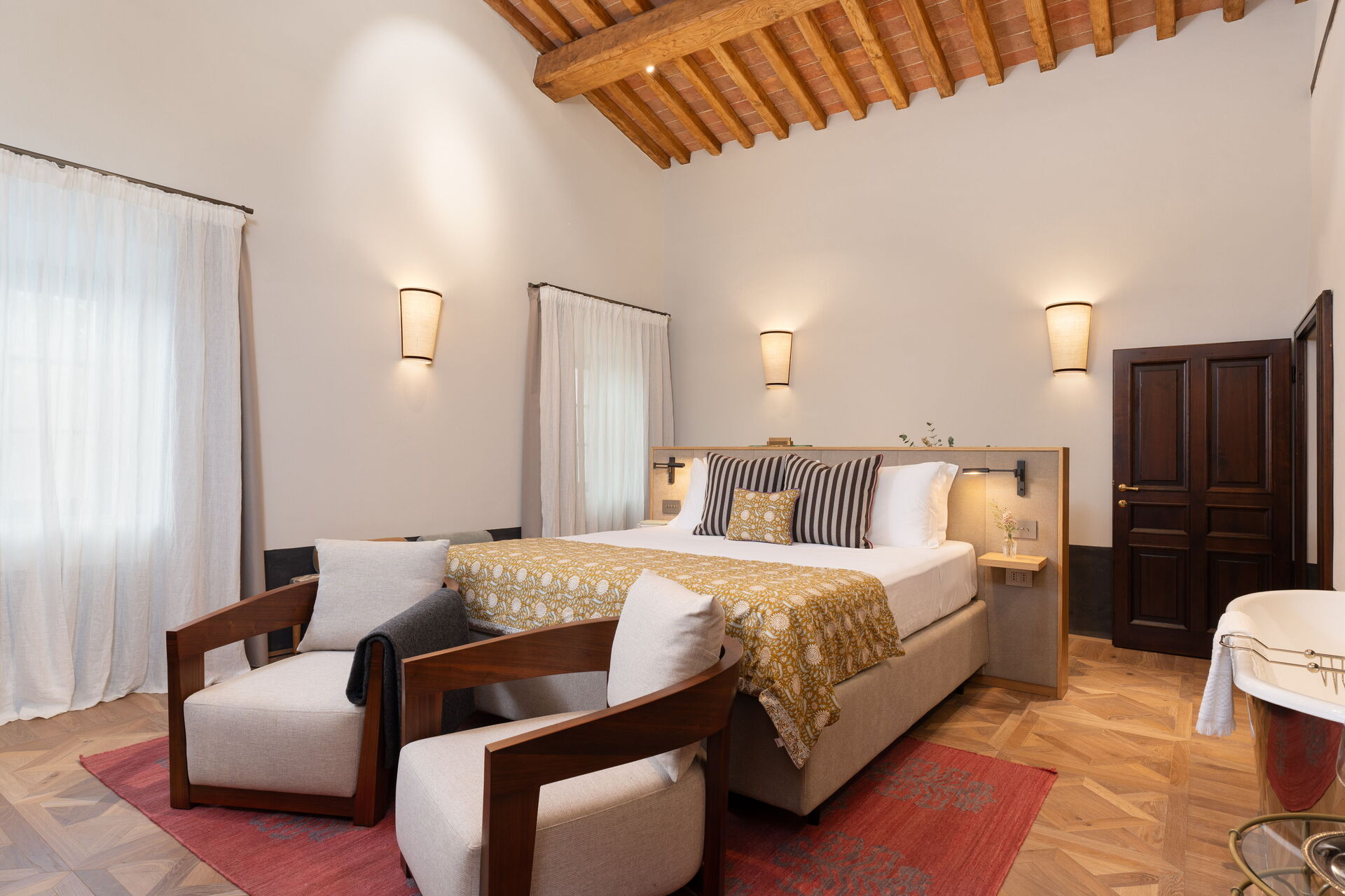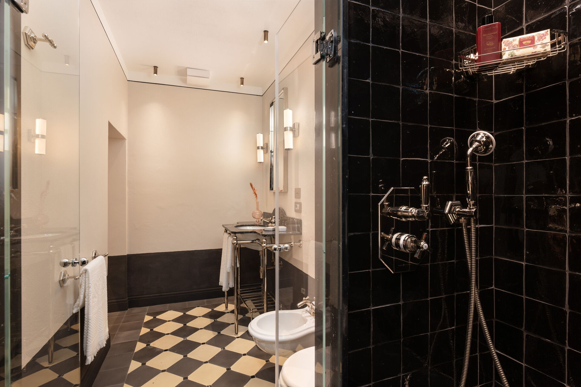 chambre avec salle de bain 1: grand lit à deux places (largeur: 180m, longueur: 200m), internet WIFI, climatisation, bassin, wc, bidet, bagnoire, douche, sèche-cheveux, sortie sur la terrasse, galerie.