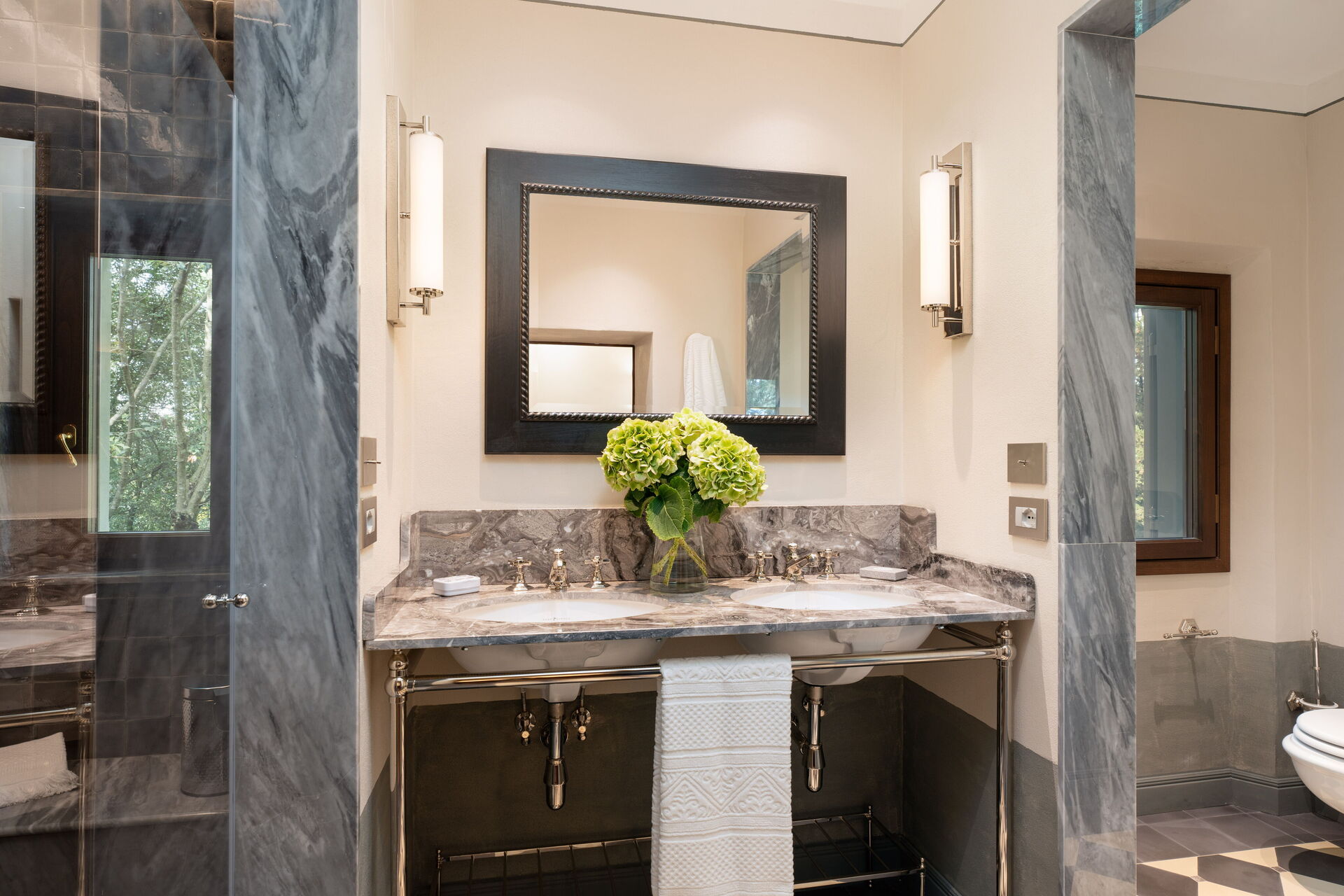 chambre avec salle de bain 2: grand lit à deux places (largeur: 180m, longueur: 200m), internet WIFI, climatisation, bassin, wc, bidet, bagnoire, douche, sèche-cheveux, sortie sur la terrasse, galerie.
