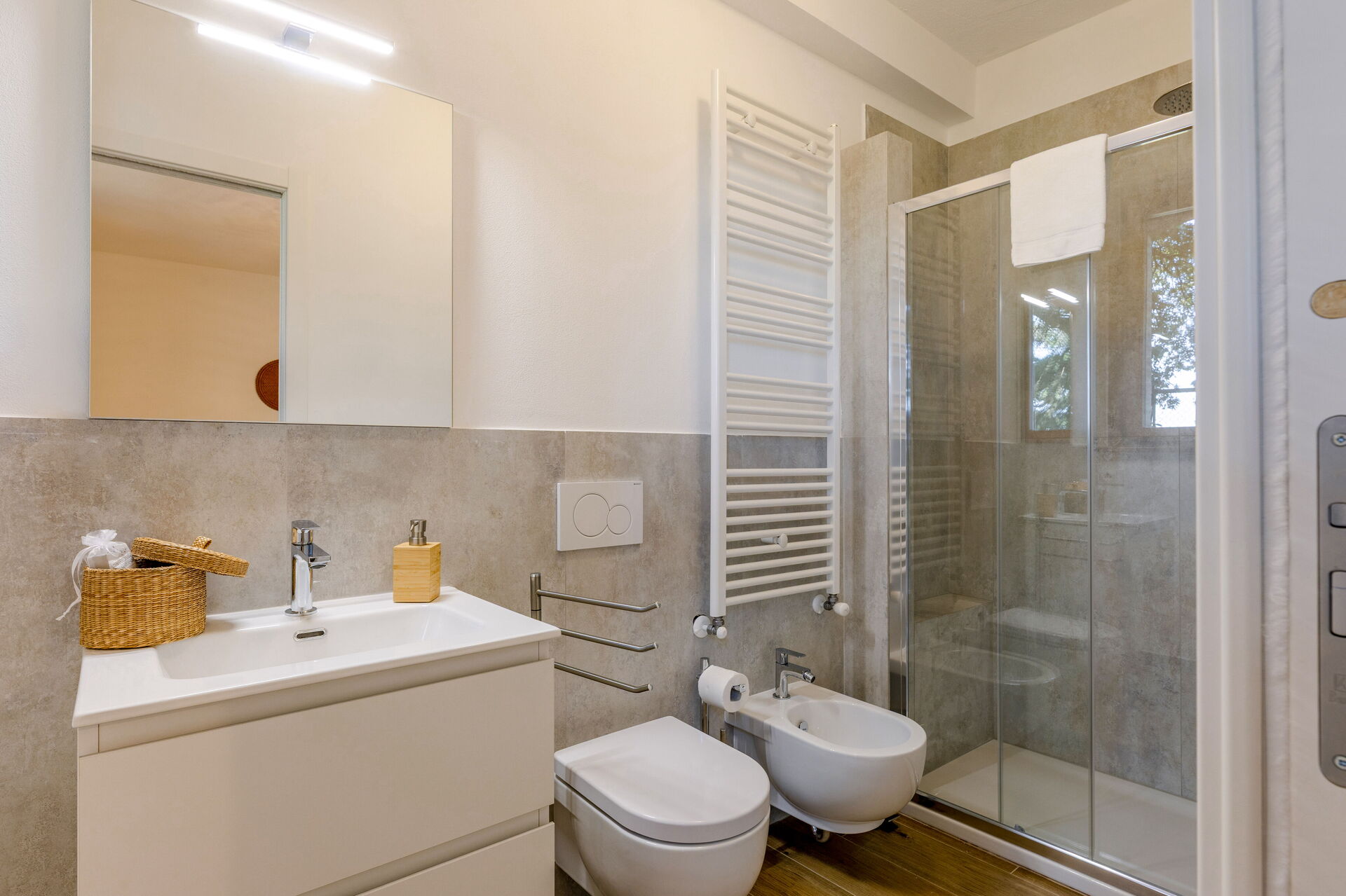 salle de bain: bassin, wc, bidet, douche.